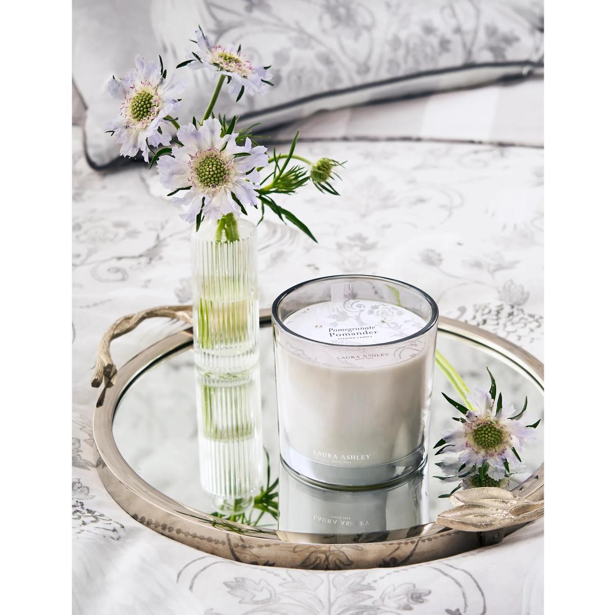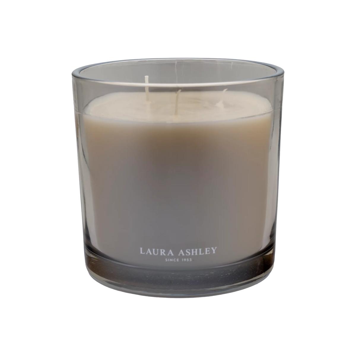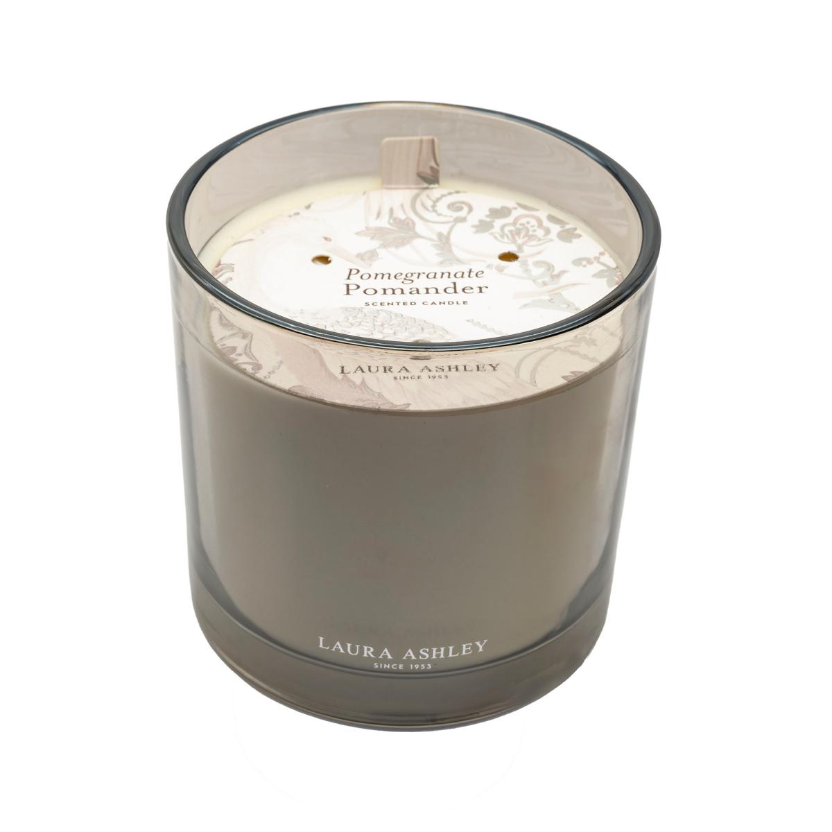 This three-wick wax candle from Laura Ashley is scented with rich pomegranate, elevated by spicy notes of pink pepper and clove. A heart of white jasmine mingles with fresh, fruity elements, while a base of patchouli and amber adds warmth. This candle comes housed in a glass jar with an eye-catching grey lustre finish.