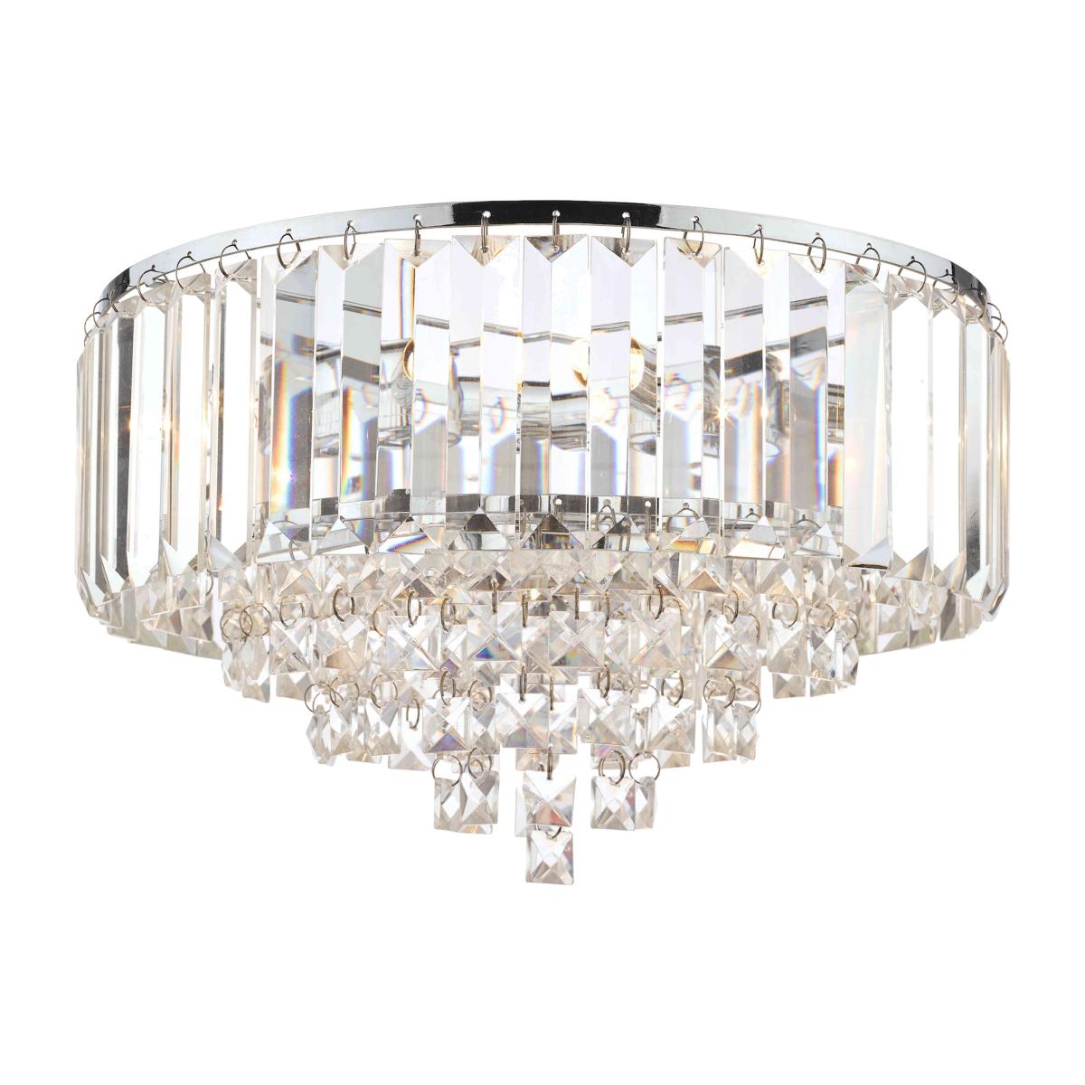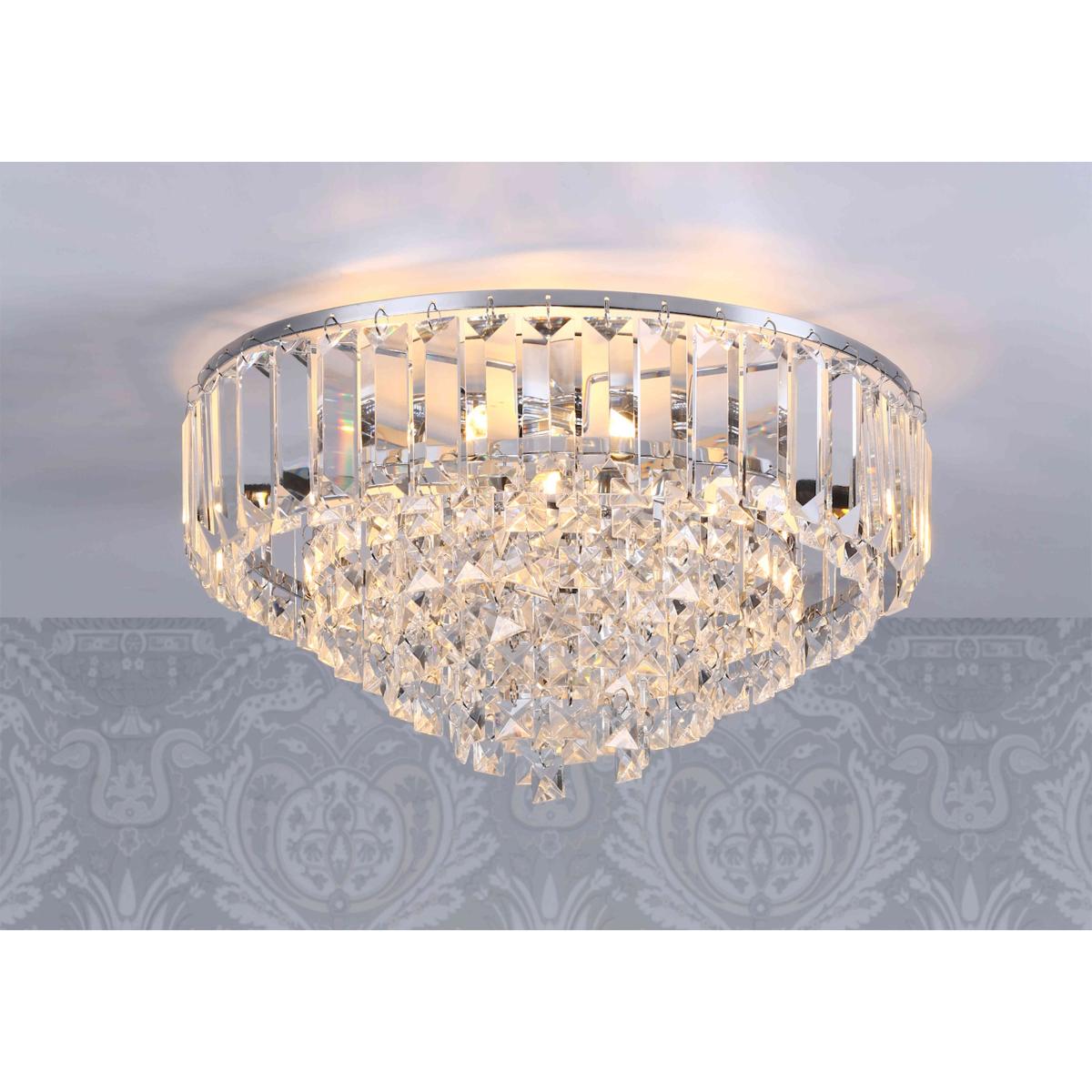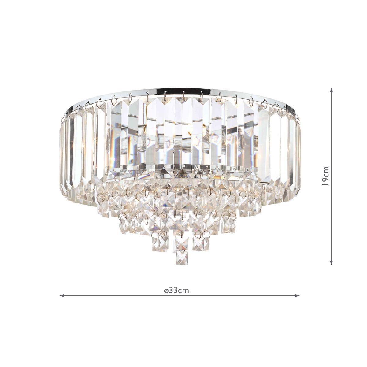Bring glamour to your living space – whatever its size – with this beautiful crystal flush-fitting ceiling light, part of our Laura Ashley lighting collection. Why you'll love it This crystal glass flush ceiling light is glam and gorgeous. It showcases a mesmerising waterfall of square-cut faceted glass droplets. Bevelled glass rods are suspended from a circular metal frame. Bright polished chrome-effect metalwork. Flush style has a neat finish with no visible cables. Ideal for a smaller or lower-ceilinged room. This 3-light flush ceiling light is part of the Laura Ashley lighting collection. What you need to know Made of crystal glass and mild steel. Requires 3 x G9 max. 20 W bulbs (not included). Please do not exceed this wattage. To clean, wipe gently with a soft dry cloth. Do not use polishes or abrasive cleaning products. Be sure to switch off before cleaning or changing the bulbs. Dimensions Height: 19 cm (8 in). Diameter: 33 cm (13 in).