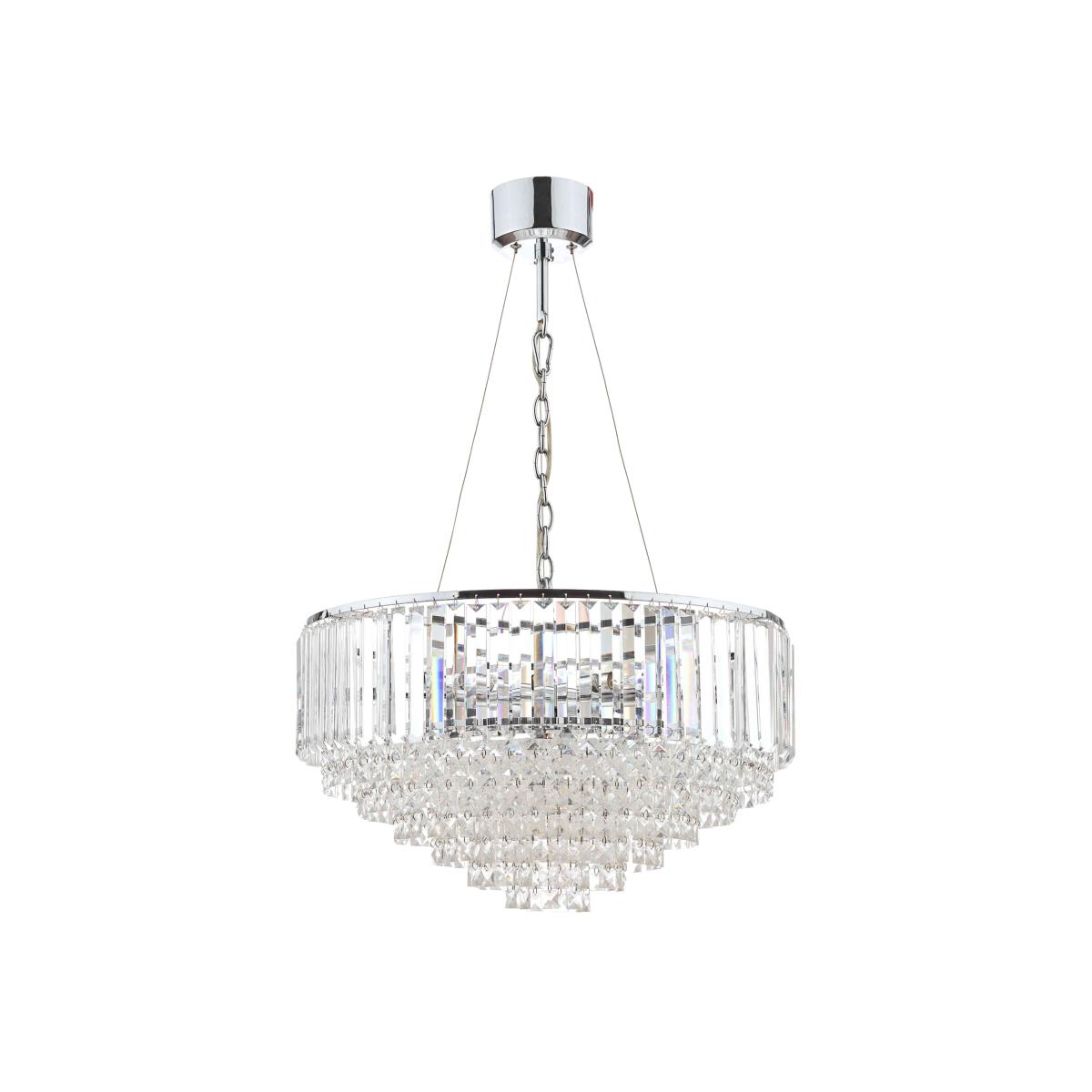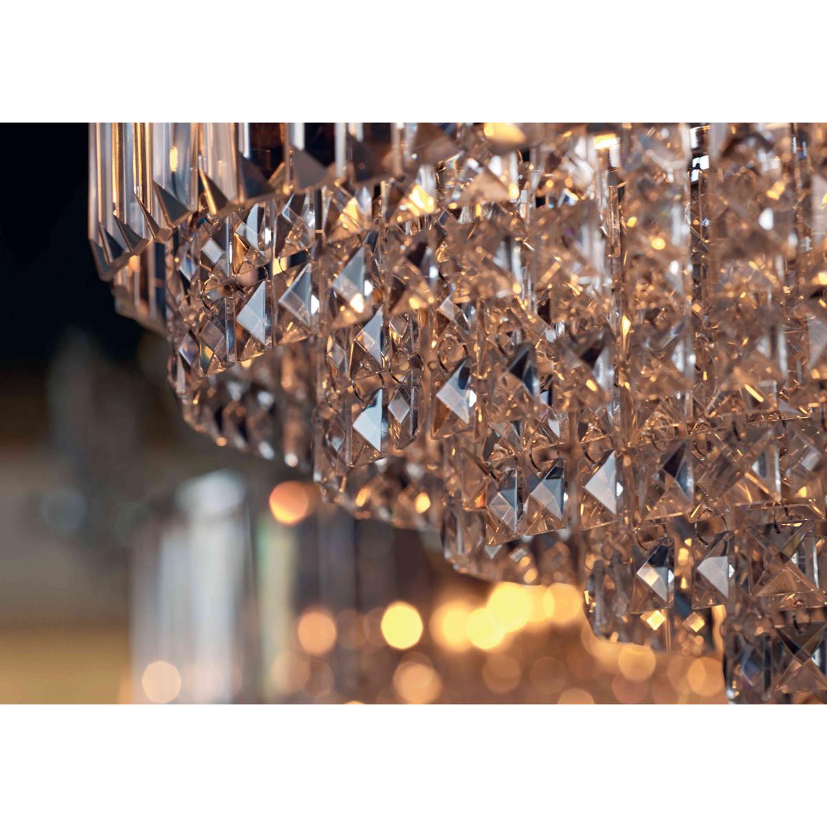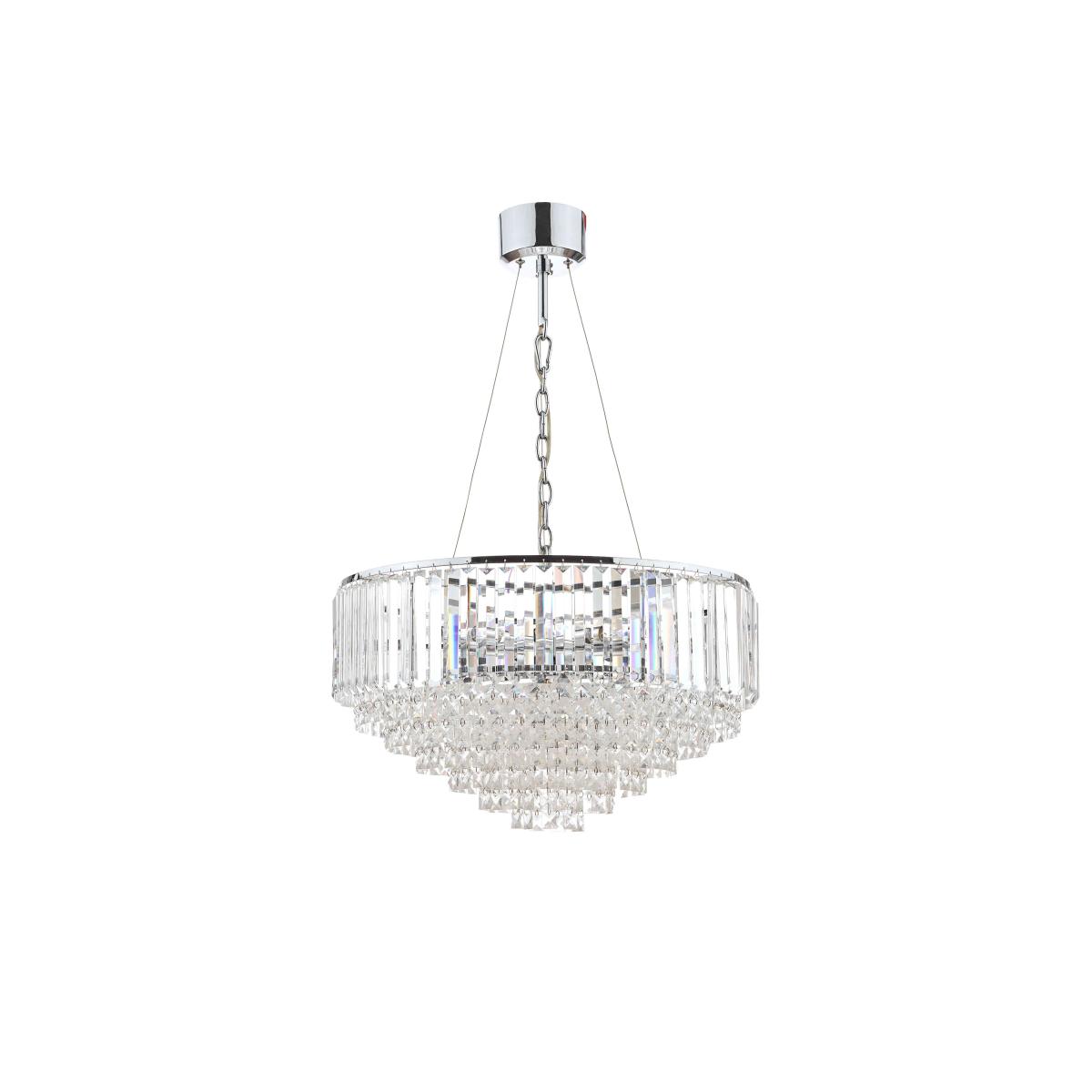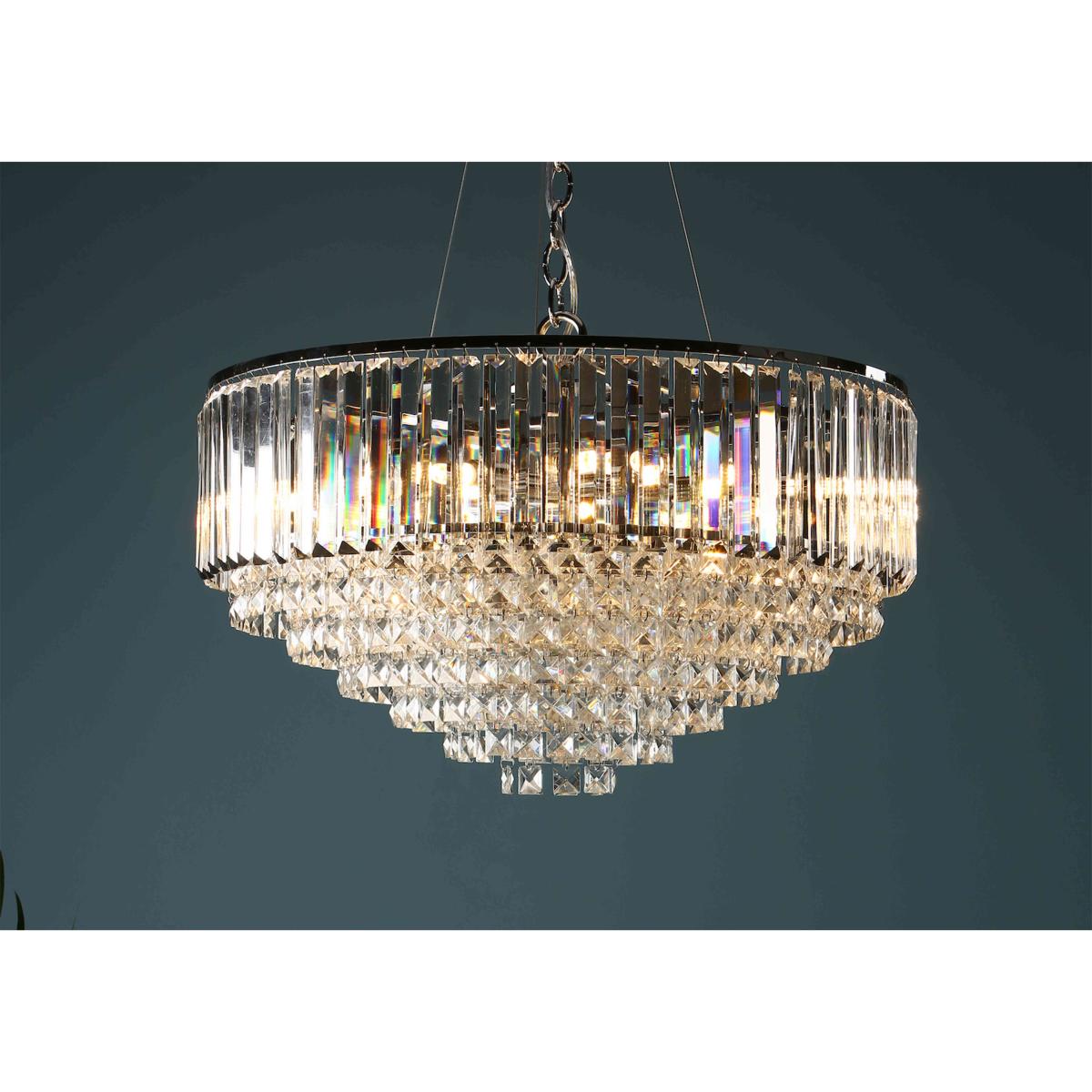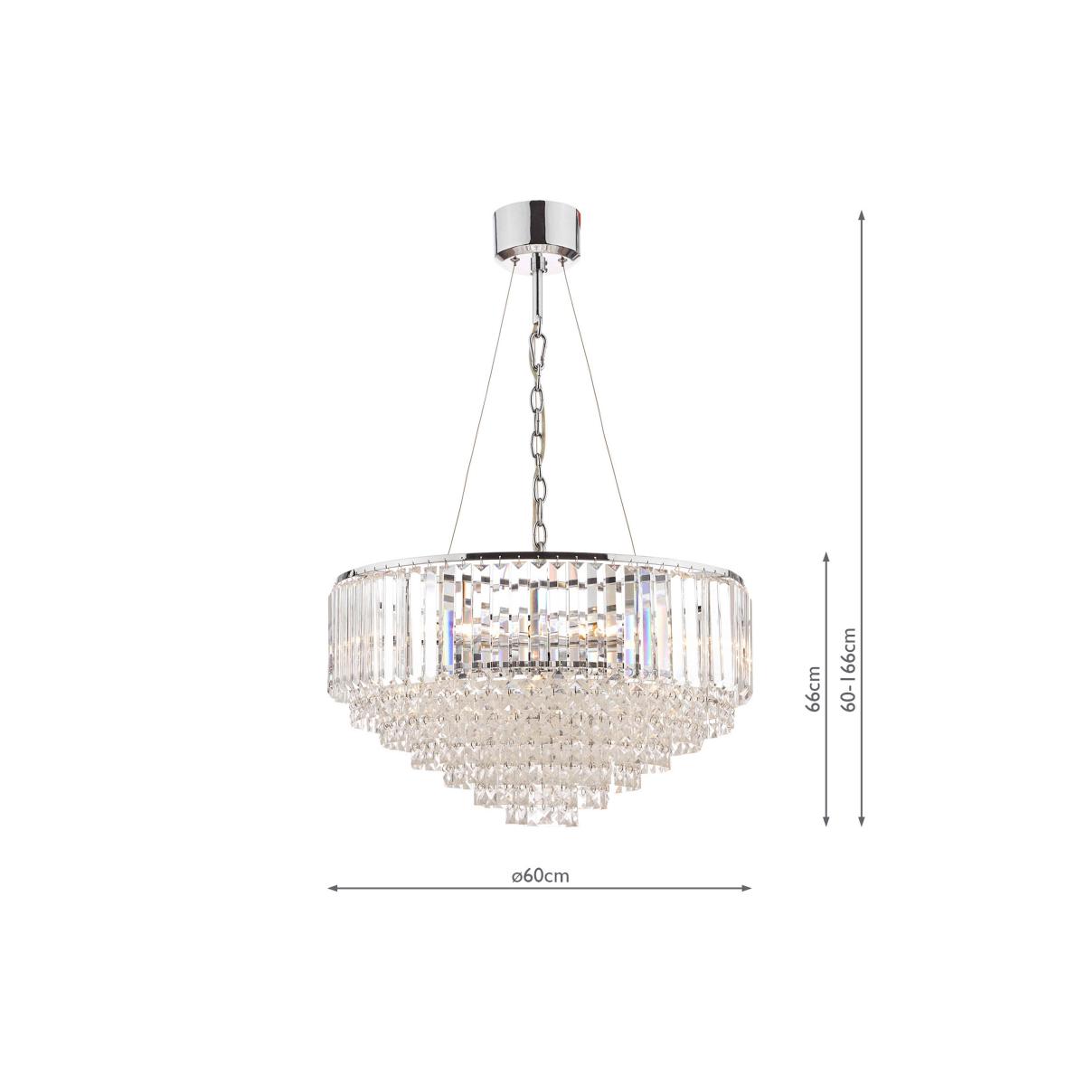 Grand and gorgeous, this very large nine-light ceiling pendant is a profusion of cut glass crystal and sparkling chrome-effect metalwork. Part of the Laura Ashley lighting collection. Why you'll love it This 9-light crystal ceiling pendant offers glam style on a grand scale. It showcases a mesmerising waterfall of square-cut faceted glass droplets. Bevelled glass rods are suspended from a circular metal frame. Bright polished chrome-effect metalwork. Height adjustable at installation. This 9-light ceiling pendant is part of the Laura Ashley lighting collection. What you need to know Made of crystal glass and mild steel. Requires 9 x G9 max. 20 W bulbs (not included). Please do not exceed this wattage. To clean, wipe gently with a soft dry cloth. Do not use polishes or abrasive cleaning products. Be sure to switch off before cleaning or changing the bulbs. Dimensions Height: 39 cm (16 in). Diameter: 60 cm (24 in). Minimum height from ceiling including light: 66 cm (26 in). Maximum height from ceiling including light: 166 cm (65 in).