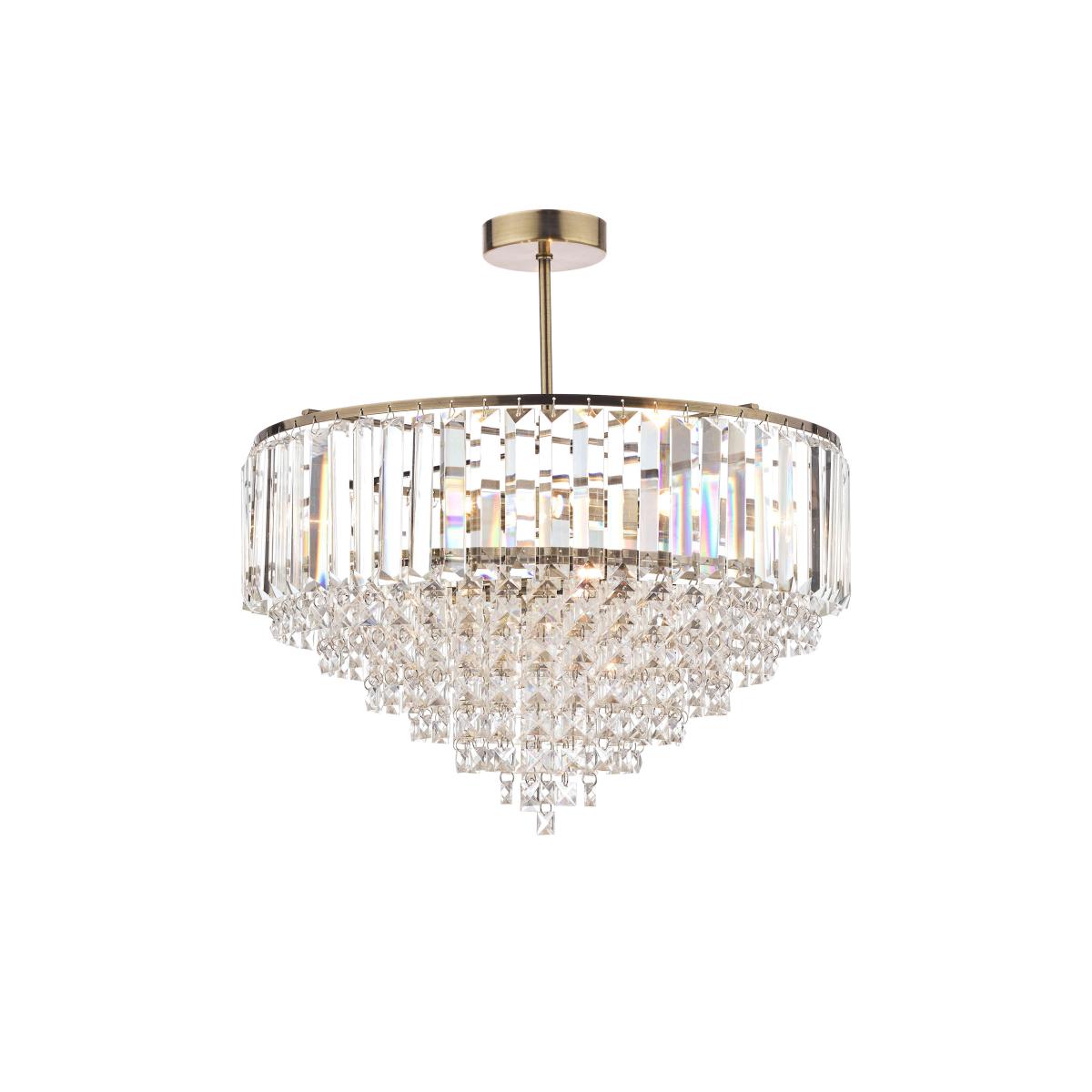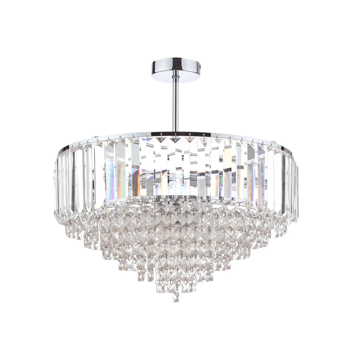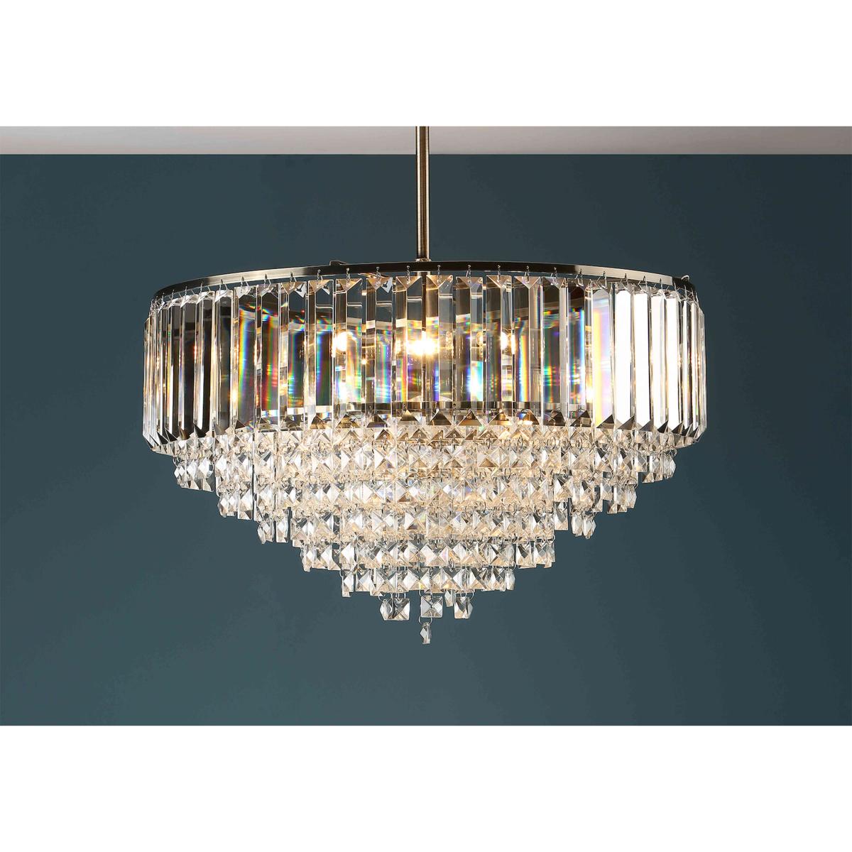 This large crystal ceiling light glitters with gorgeous glam style. A profusion of glass droplets provides a stunning focal point and brings home timeless glamour. By Laura Ashley lighting. Why you'll love it This large crystal glass ceiling light is glam and gorgeous. It showcases a mesmerising waterfall of square-cut faceted glass droplets. Bevelled glass rods are suspended from a circular metal frame. In a choice of metal finishes – antique brass and chrome. Semi-flush style is ideal for a smaller or lower-ceilinged room. This 5-light semi-flush ceiling light is part of the Laura Ashley lighting collection. What you need to know Made of crystal glass and mild steel. Requires 5 x G9 max. 33 W bulbs (not included). Please do not exceed this wattage. To clean, wipe gently with a soft dry cloth. Do not use polishes or abrasive cleaning products. Be sure to switch off before cleaning or changing the bulbs. Dimensions Height: 48 cm (19 in). Diameter: 48 cm (19 in).