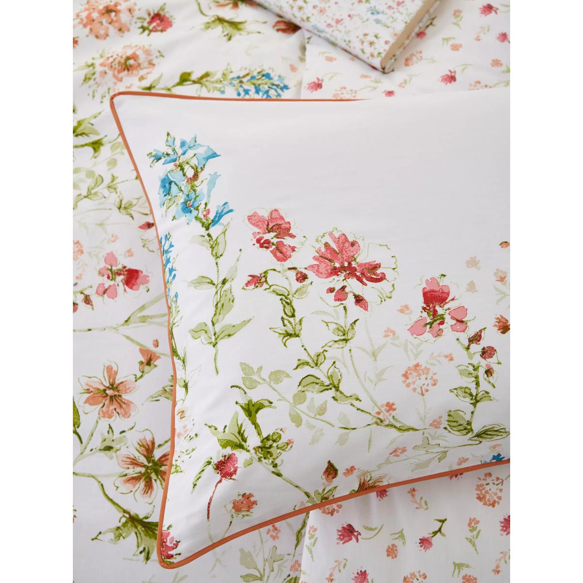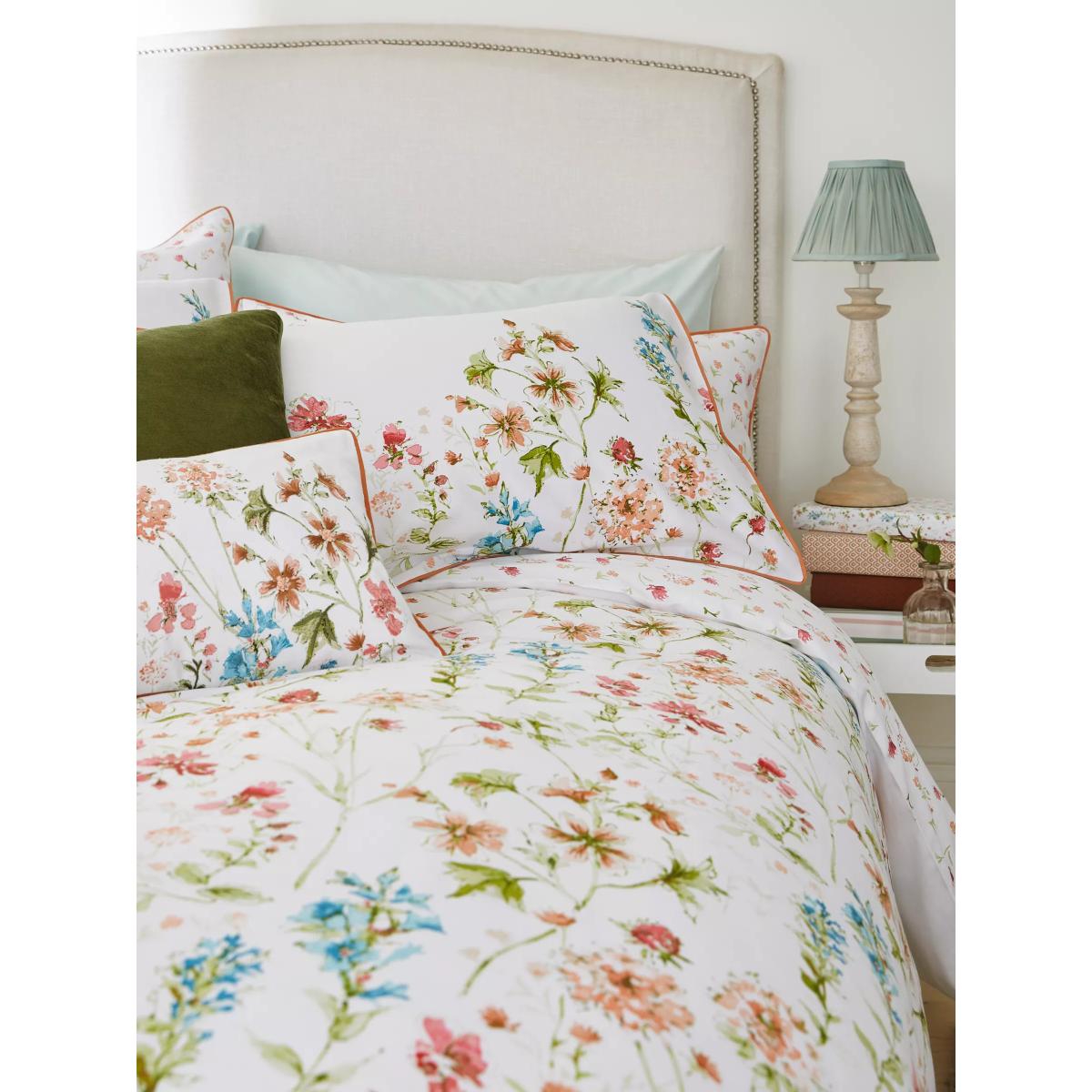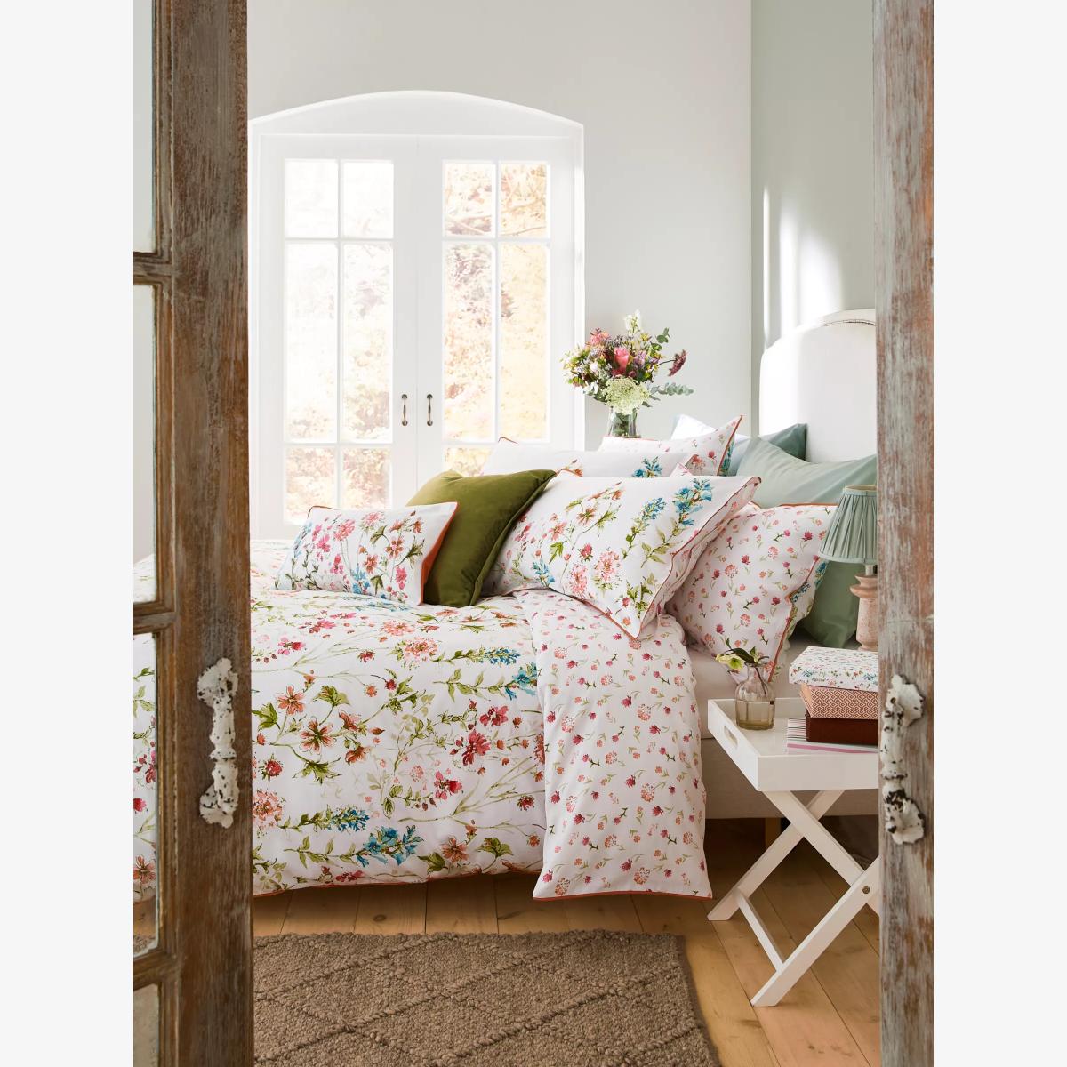 Bring a breath of fresh air to your bedroom with this 200 thread count pure cotton duvet cover set. Scattered blossoms, illustrated in graceful watercolour, cover the outer side and the shades of crimson, apricot and blue, give you a range of colour options to coordinate with. The reverse side features miniatures of the print so that the pretty theme continues when the covers are pulled back. Flat piped edging features on the duvet cover and pillowcases. Each set comes with 2x standard pillowcases. Bedding sizes To fit duvet/pillow size (cm) Standard pillowcase, L75 x W50cm Double duvet cover, L200 x W200cm King duvet cover, L220 x W225cm Super king duvet cover, L220 x W260cm Have you thought about sheeting? Shop here.
