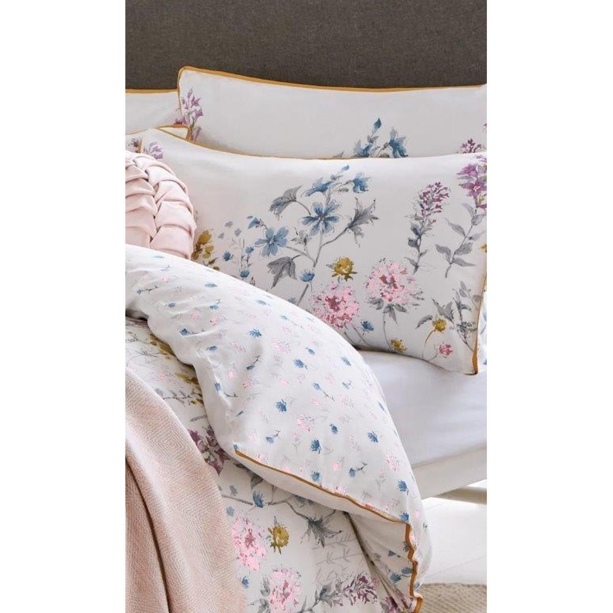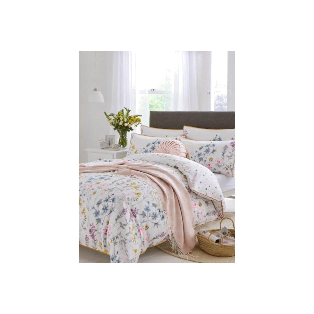 Bring a breath of fresh air to your bedroom with this 200 thread count pure cotton Laura Ashley Wild Meadow Duvet. Scattered blossoms illustrated in graceful watercolour cover the outer side, and the shades of blue, yellow, and pink, give you a range of colour options to coordinate with. The reverse side features miniatures of the print so that the pretty theme continues when the covers are pulled back. Choose from our single, double, king, or super king sizes Machine Washable 100% Cotton Available in: Single, Double, King and Super King Sizes Set includes: Duvet cover and 2 x Pillowcases (1 x Pillowcase in single set) All screens vary in colour reproduction and whilst every effort has been made to display the colour as accurately as possible it is for guidance only.