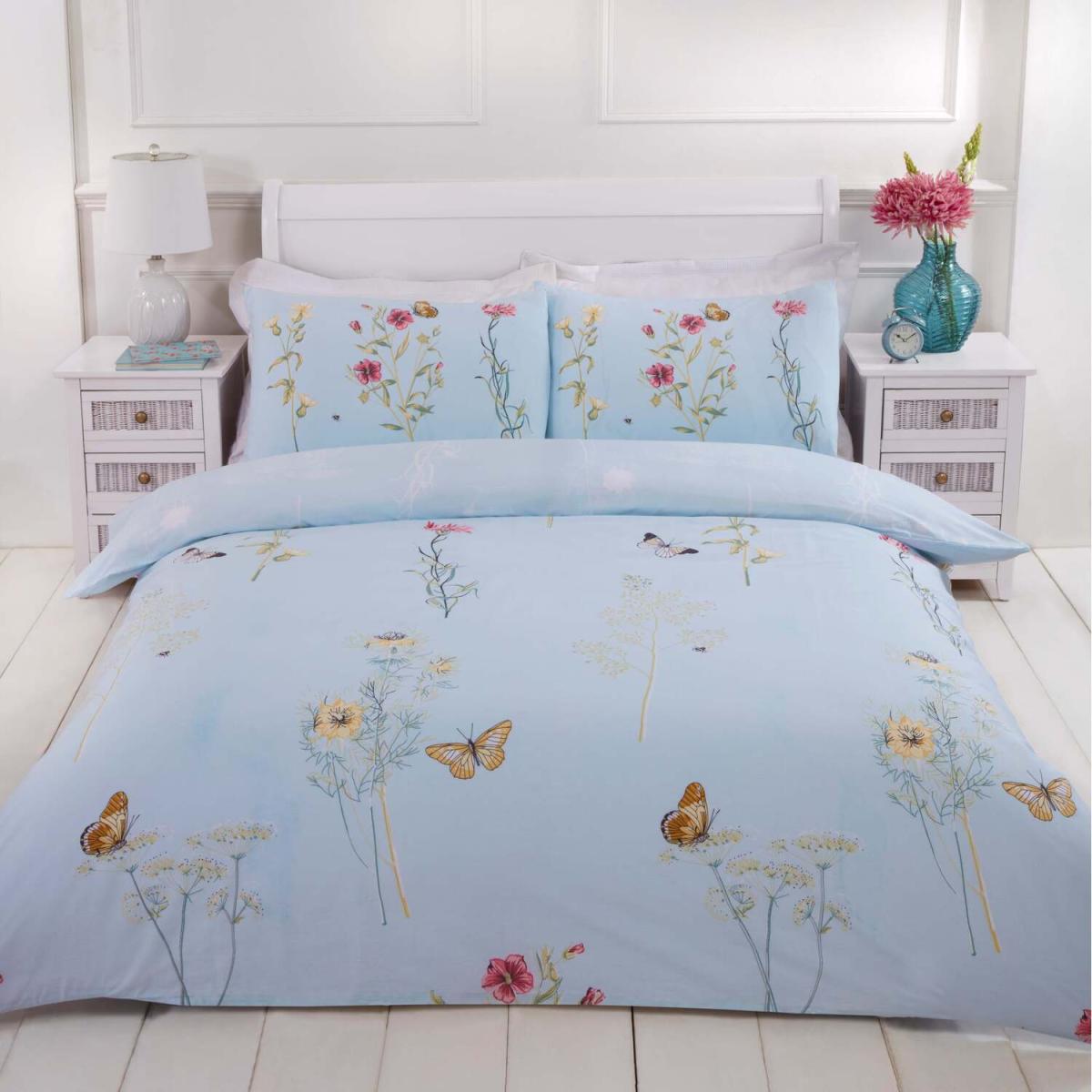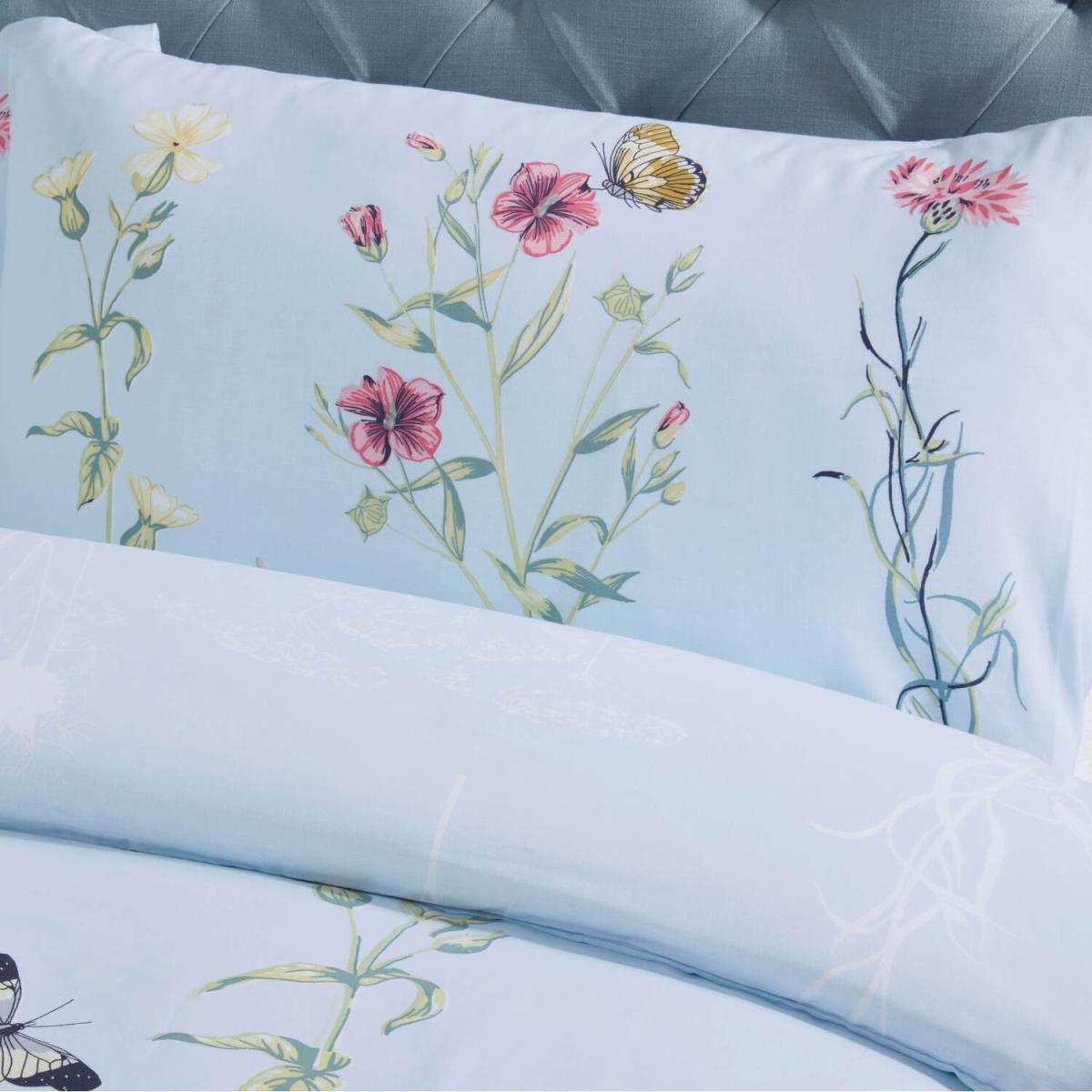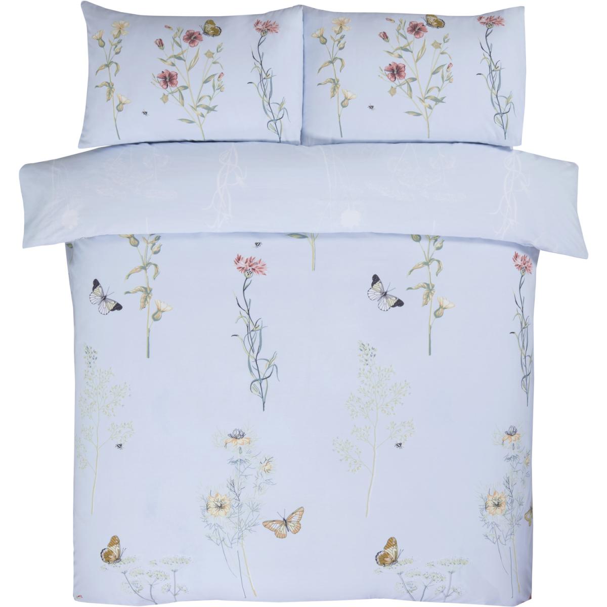 The gorgeous laura quilt cover set has a charming botanical floral stem and butterfly print on a soft pastel background.