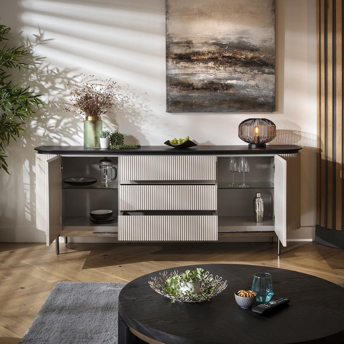 This 210cm wide modern mid-century sideboard cabinet seamlessly blends elegance and bold design. This large sideboard features a unique ribbed wood texture that catches the light, adding a standout element to any space. With a smooth matte chalk finish, this contemporary buffet is both stylish and functional. This modern buffet stands out with its meticulous craftsmanship and elegant design. The ribbed wood detailing creates a stunning texture that plays with light, while the rounded sides add a soft, elegant touch. Supported by smoked metal legs, this contemporary sideboard is as durable as it is eye-catching, making it a timeless addition to any home. The Laura sideboards body is finished in a smooth matte chalk paint, providing a sophisticated contrast to the durable oak veneer tabletop. The top, with its black oak colour, offers a sleek and subtle elegance. This harmonious colour combination enhances the sideboards modern appeal, making it a versatile piece for various interior styles. Designed for practicality, this sideboard cabinet features 2 large cupboard compartments and three spacious drawers. Inside, youll find glass shelves, perfect for displaying items or organising essentials. The integrated vents can also serve as cable holes, ensuring that this storage cabinet is as functional as it is stylish. W210cm D45cm H80cm Preassembled Large Sideboard Cabinet
