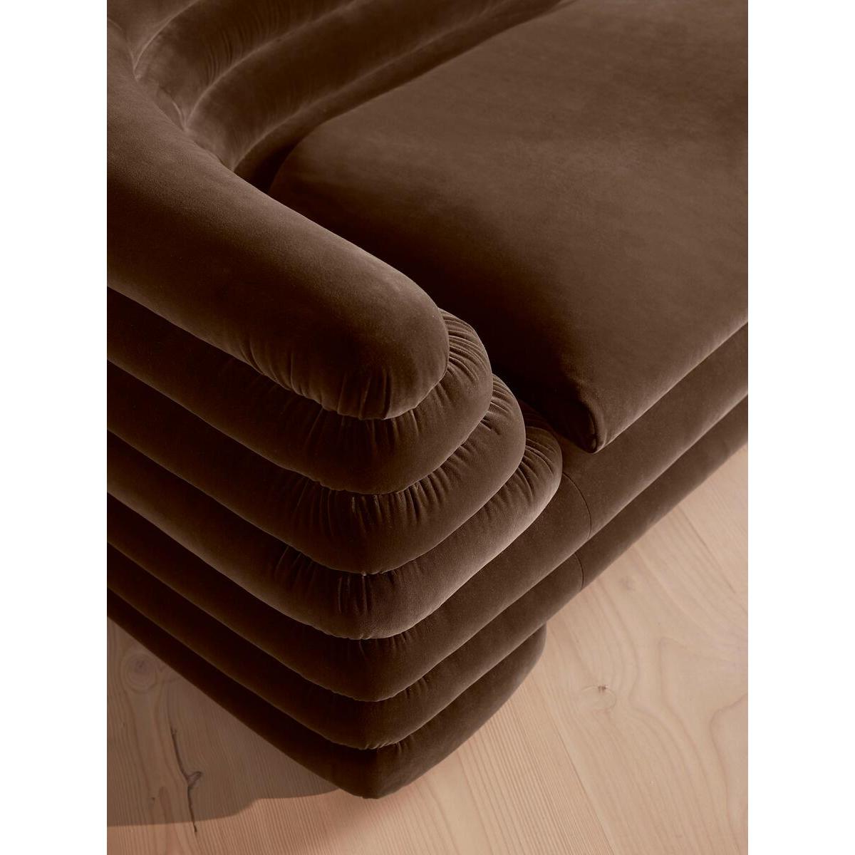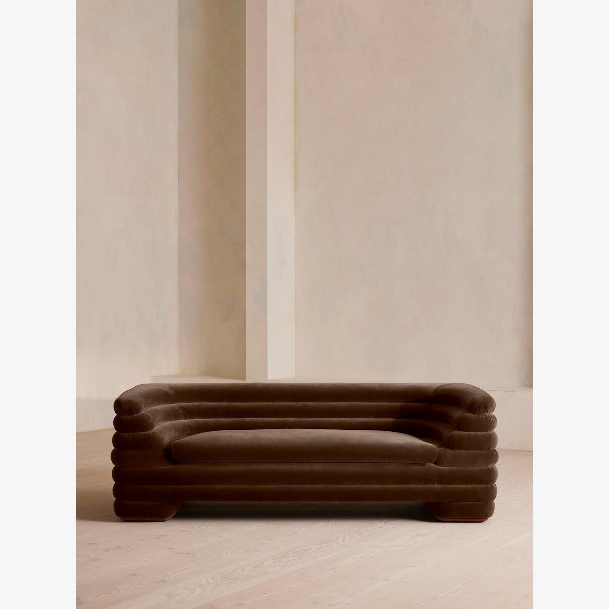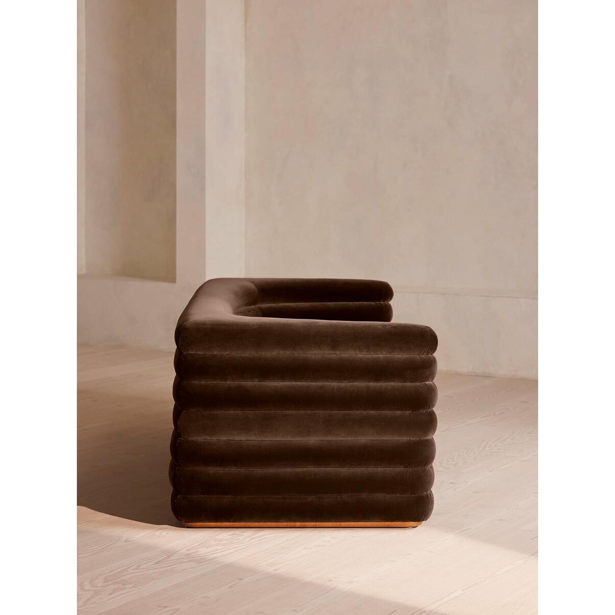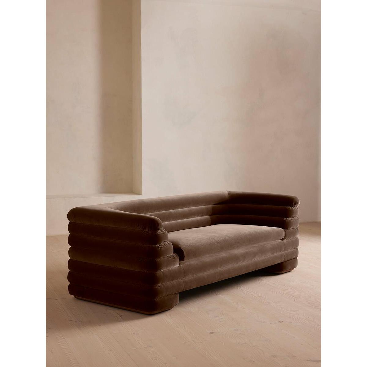Our Laura three-seater sofa offers endless relaxation while showcasing design-led details, inspired by 180 House. Upholstered in a rich velvet fabric, its curved shape is set apart by padded sectioning, which wraps around the sofa for ergonomic comfort, with a deep sit for cosy conversations among family and friends. Curved three-seater sofa Layered padded sectioning for ergonomic comfort Deep sit Foam feather-wrapped loose cushions Reversible seat pad Upholstered in velvet Available in a range of colours Dark stained solid wood feet Inspired by 180 House