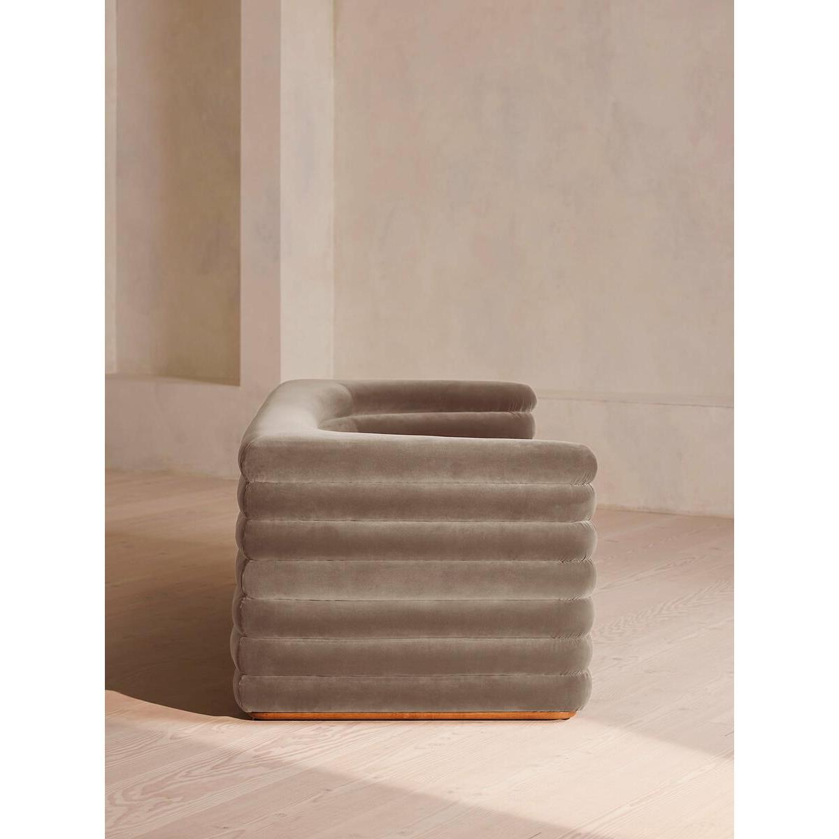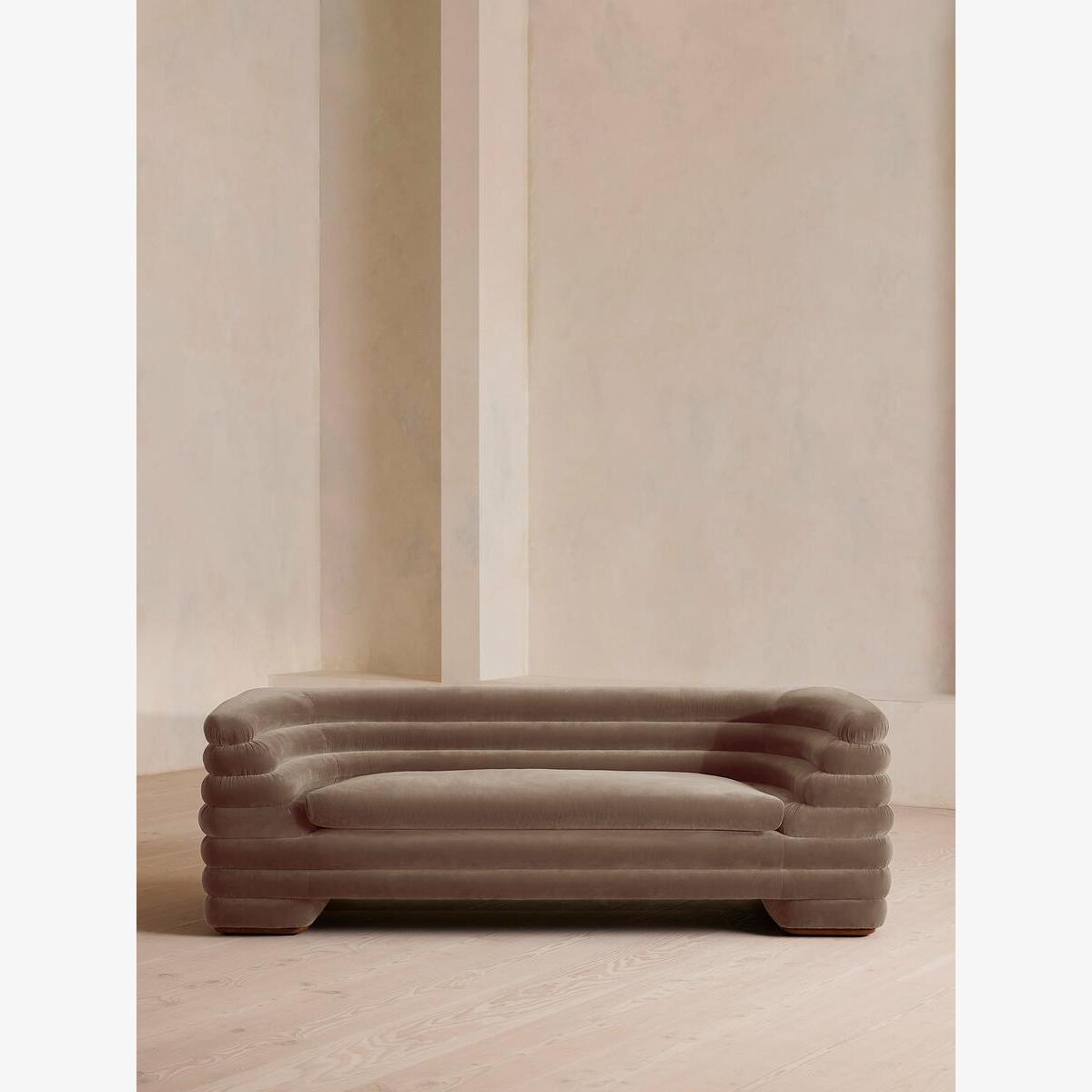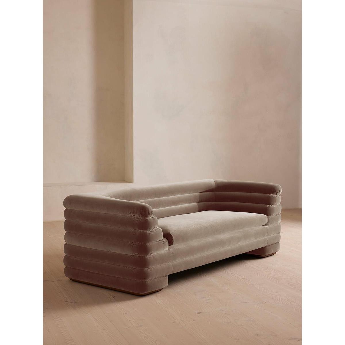 Our Laura three-seater sofa offers endless relaxation while showcasing design-led details, inspired by 180 House. Upholstered in a rich velvet fabric, its curved shape is set apart by padded sectioning, which wraps around the sofa for ergonomic comfort, with a deep sit for cosy conversations among family and friends. Curved three-seater sofa Layered padded sectioning for ergonomic comfort Deep sit Foam feather-wrapped loose cushions Reversible seat pad Upholstered in velvet Available in a range of colours Dark stained solid wood feet Inspired by 180 House