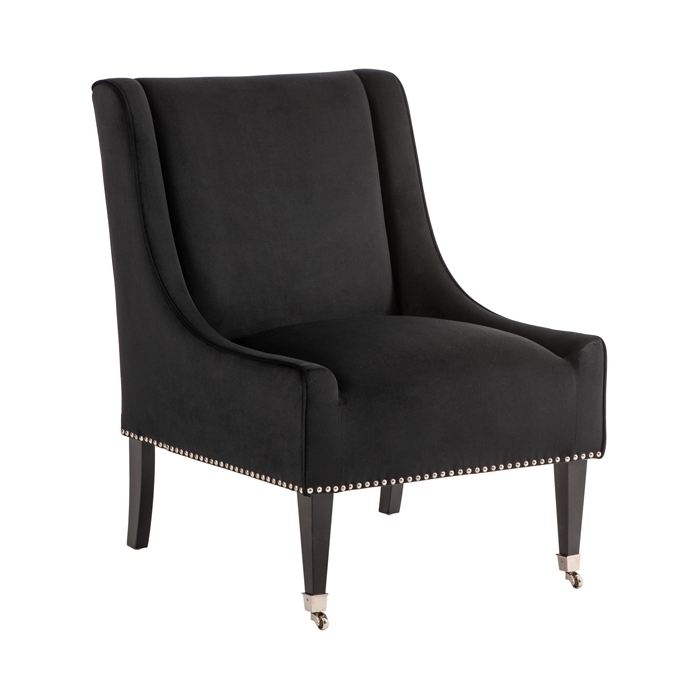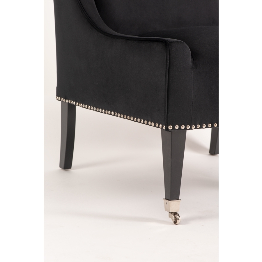 A handsome and comfortable chair with chrome details and luxurious black velvet finish Perfectly scaled for use in reception areas, living rooms and bedrooms A timeless, elegant design Simple assembly required (attachment of legs -approx. 10 minutes)