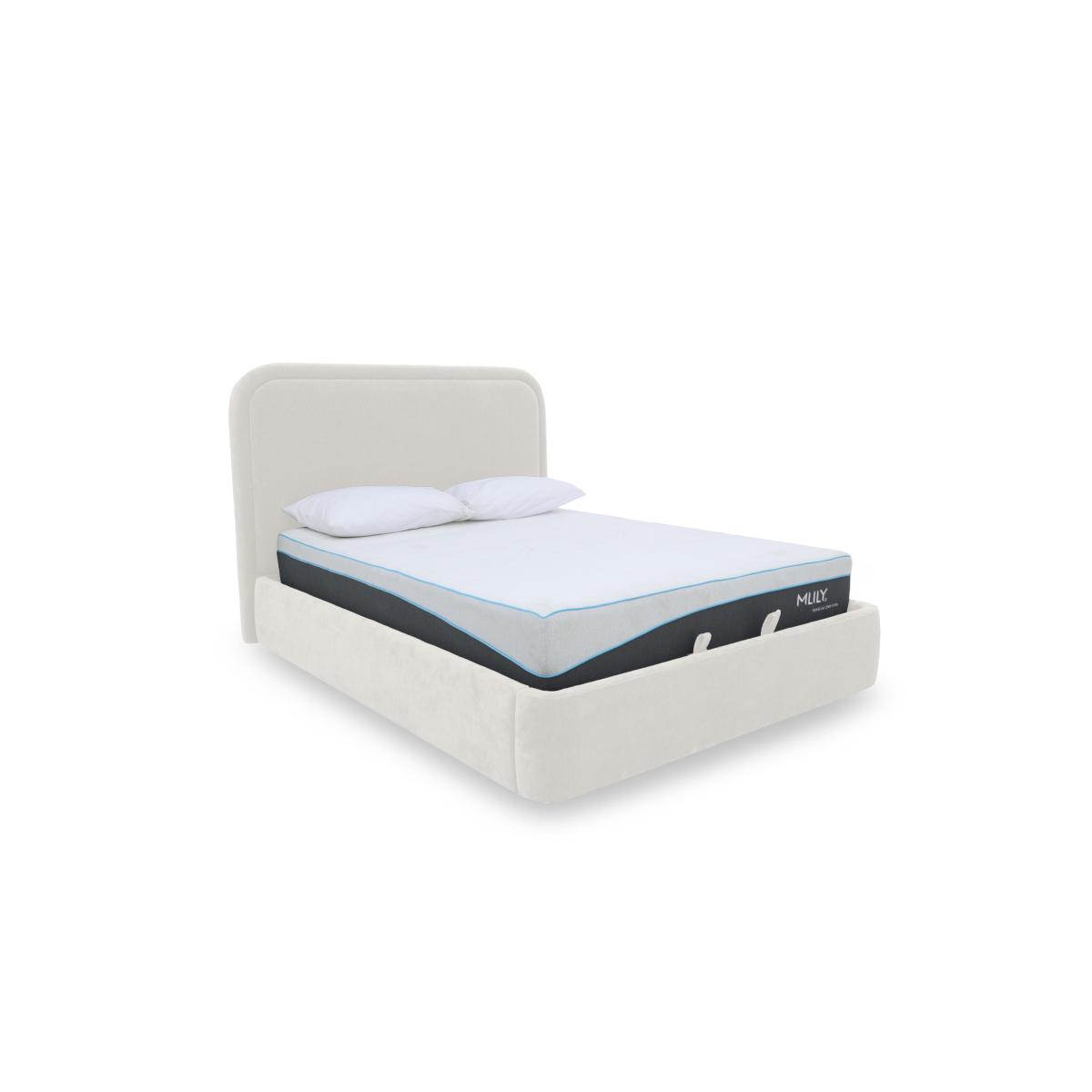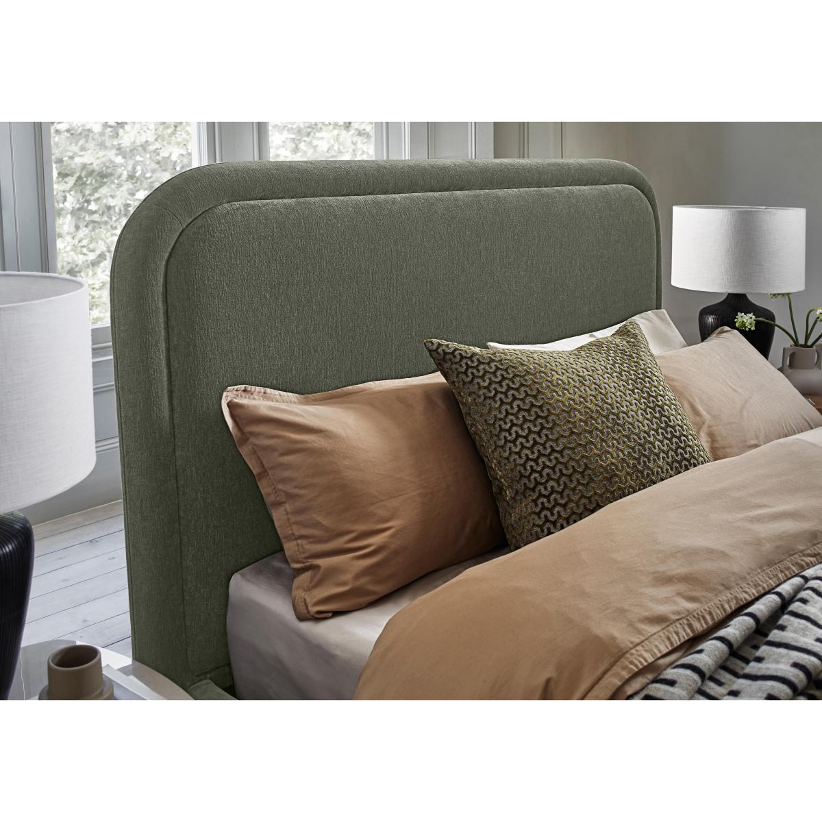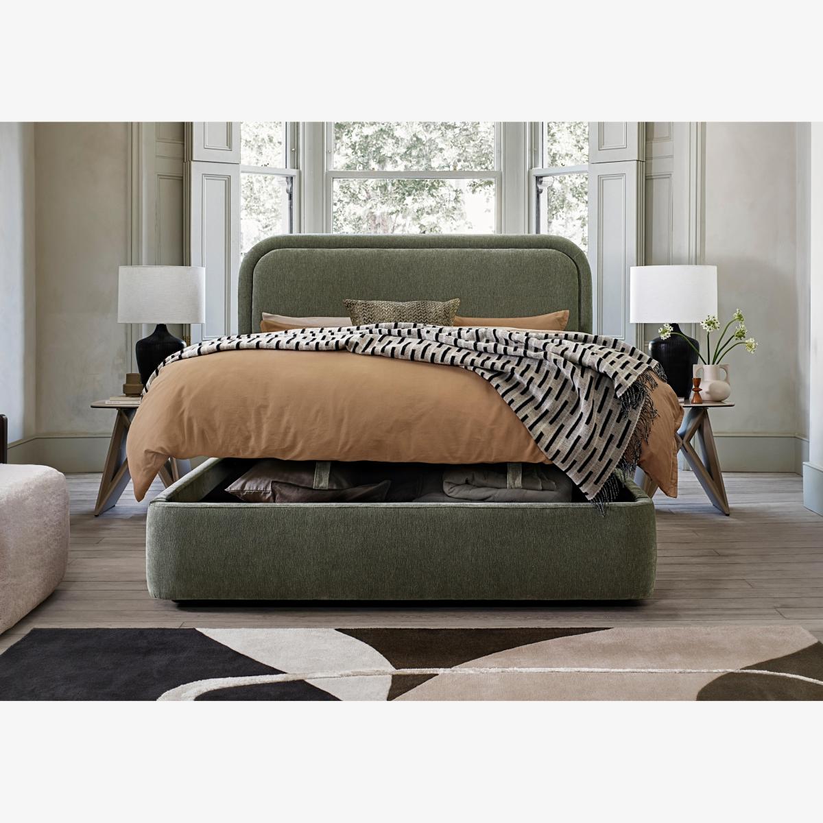 Functionality never looked so fabulous. This ottoman bed frame brings extra storage to your bedroom as well as chic style. Great value and only at Furniture Village. Why you'll love it This ottoman bed frame looks incredible – and the price is pretty amazing too. The chic rounded headboard is sumptuously cushioned. Its stylish curves hide a large storage compartment. Integrated safety system. Spacious and practical storage for pillows, duvets, clothing and more. Slatted wood base encourages ventilation. Moving house? It’s quick and easy to disassemble tool-free. Choice of upholstery colours. In double, king and super king bed sizes. The Laurent ottoman bed frame is a Furniture Village exclusive. What you need to know Mattress sold separately. Slatted wooden mattress base. 30 slats in king size. This ottoman bed frame opens at the end. Maximum mattress weight by bed frame size: 56 kg for double, and 65 kg for king and super king. Please keep hands clear of the mechanism when opening and closing the ottoman. Do not sit on the foot end of this ottoman bed frame when opening. Clean regularly using a soft brush or vacuum with the curtain attachment. Deal with any spills promptly. Professional cleaning advised for oil- and grease-based stains. Some fabrics can show wear on areas of more use or in direct sunlight. Flattening and shading of heavy wear areas on pile fabrics like velvet is unavoidable. Be sure to brush pile fabrics only in the direction of the pile. Please read our upholstery care guide for more advice. Item code:LAUR46OTASTN-001