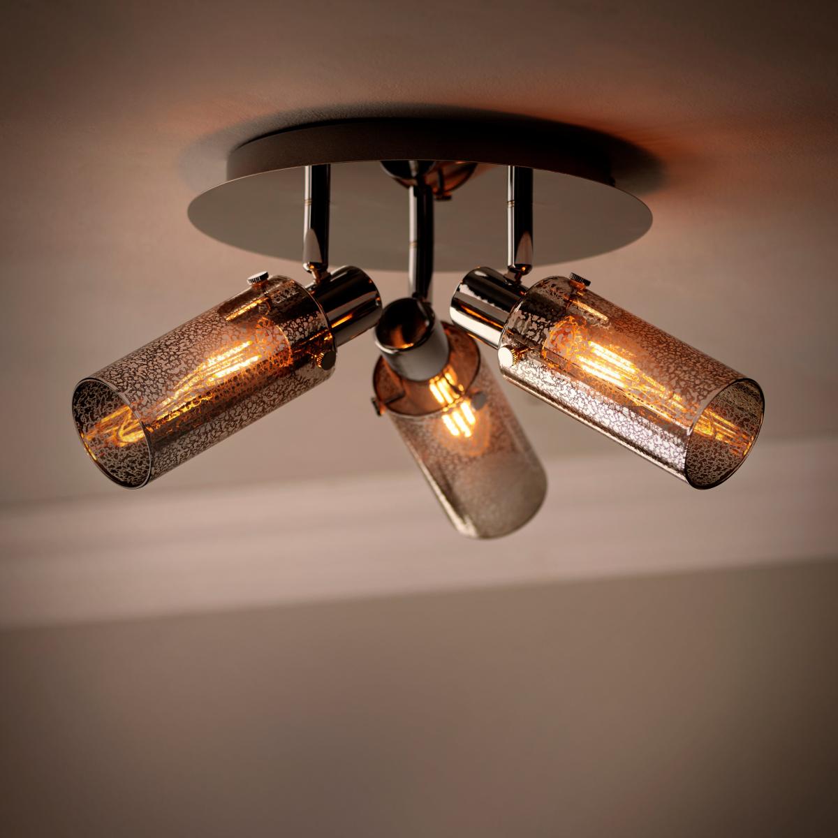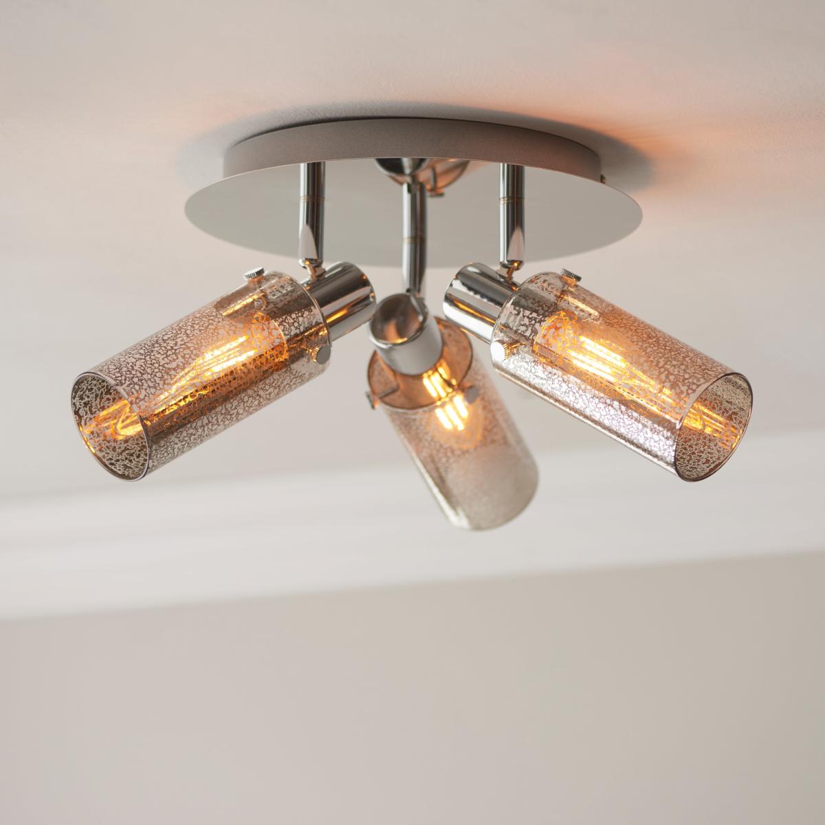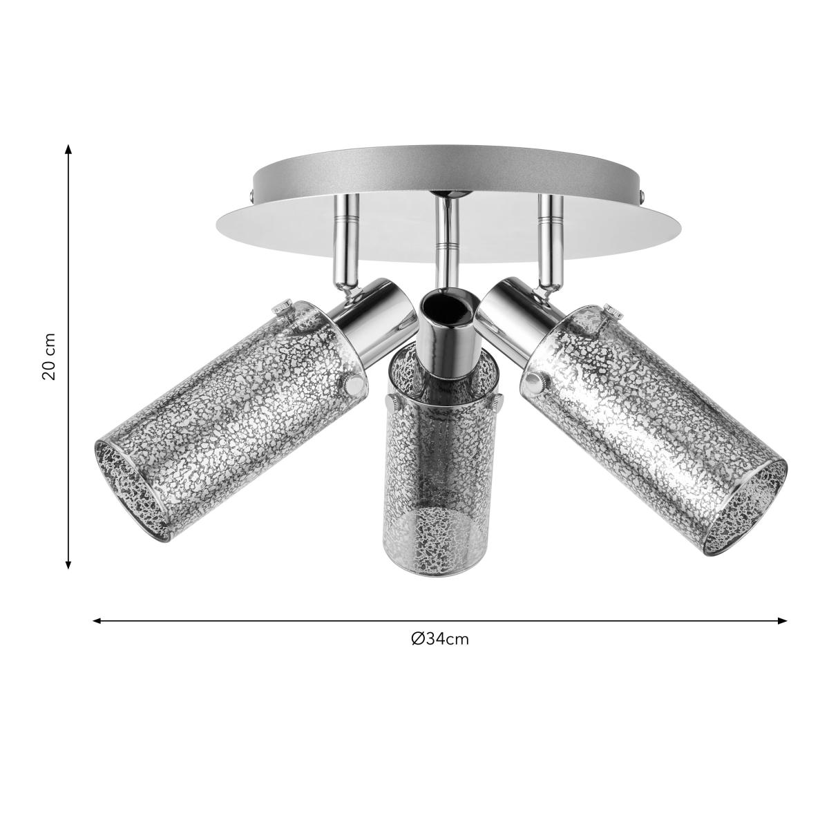 * Industrial-Inspired Design* Made from Metal & Glass* Adjustable Spotlight Heads - Tailored Ambience* Dimmable Compatible - Needs Dimmable Bulb & Switch* Requires: E14 Cap Type & Candle Bulbs Unique and eye-catching in design, the Lara Industrial 3 Light Adjustable Spotlight is the perfect addition to your home. Made from sturdy metal and stunning mercury glass shades, it boasts adjustable spotlight heads for tailored ambience.