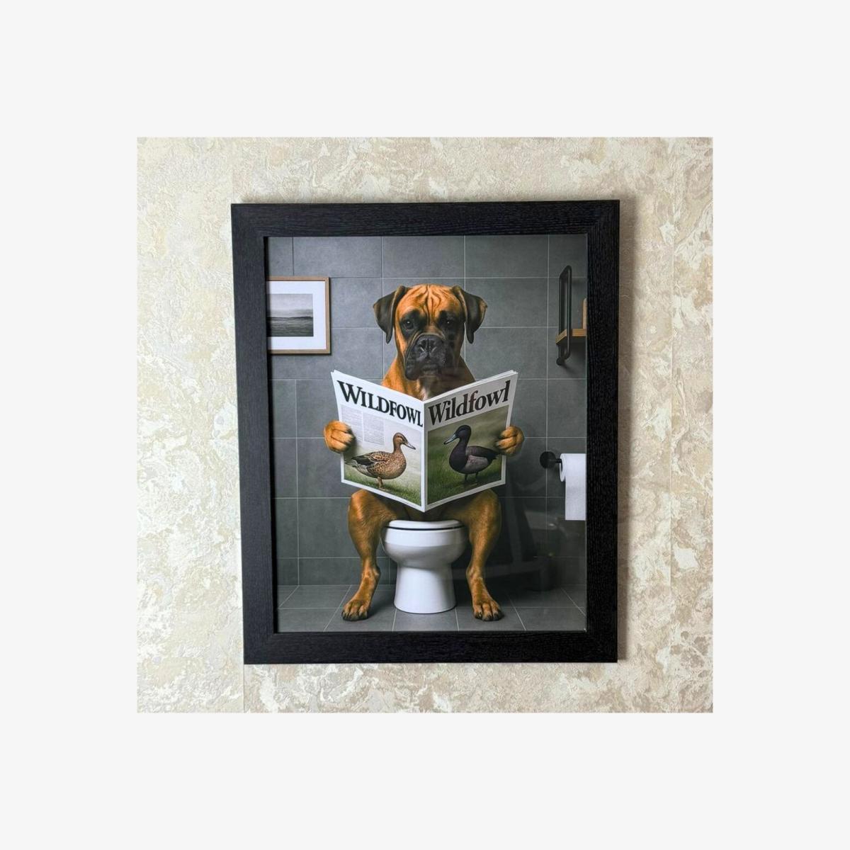 Lavatory Boxer wall art, featuring a black wooden frame. Playful and full of personality, the Lavatory Boxer wall art brings humour and charm to your bathroom. Set within a black wooden frame, this artwork captures a scene of a beagle in a cosy, tiled bathroom, absorbed in reading a newspaper. Ideal for bathrooms, cloakrooms or anywhere in need of a light-hearted touch, this artwork combines classic pet portraiture with a fun, unexpected twist—sure to bring a smile.