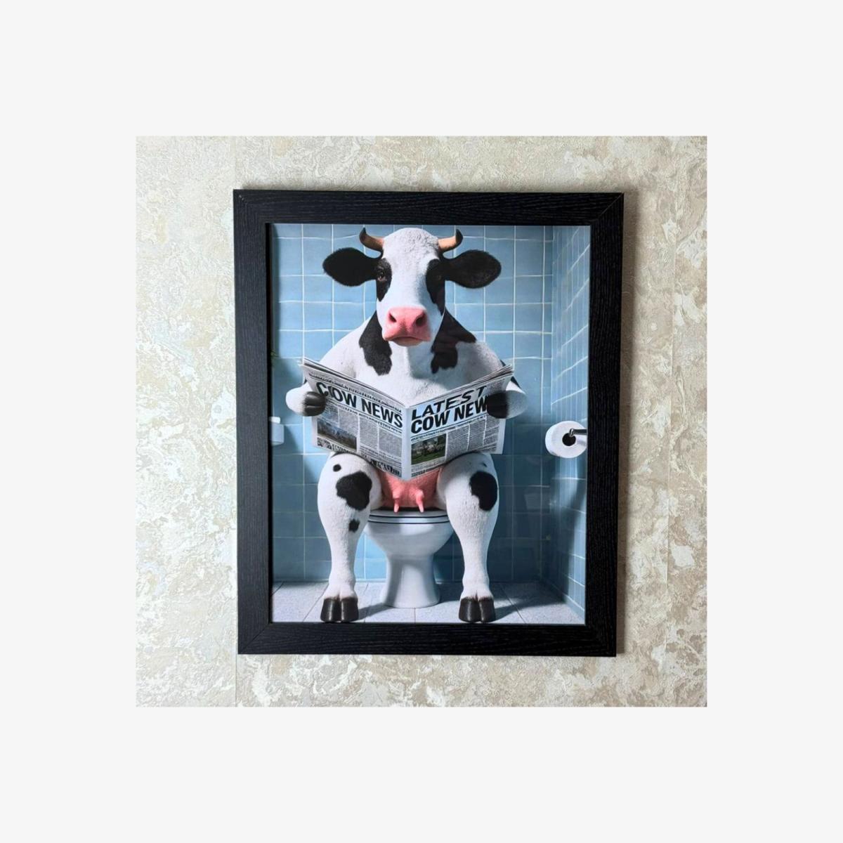 Lavatory Dairy Cow wall art, featuring a black wooden frame. Playful and full of personality, the Lavatory Dairy Cow wall art brings humour and charm to your bathroom. Set within a black wooden frame, this artwork captures a scene of a cow in a cosy, tiled bathroom, absorbed in reading a newspaper. Ideal for bathrooms, cloakrooms or anywhere in need of a light-hearted touch, this artwork combines classic animal portraiture with a fun, unexpected twist—sure to bring a smile.