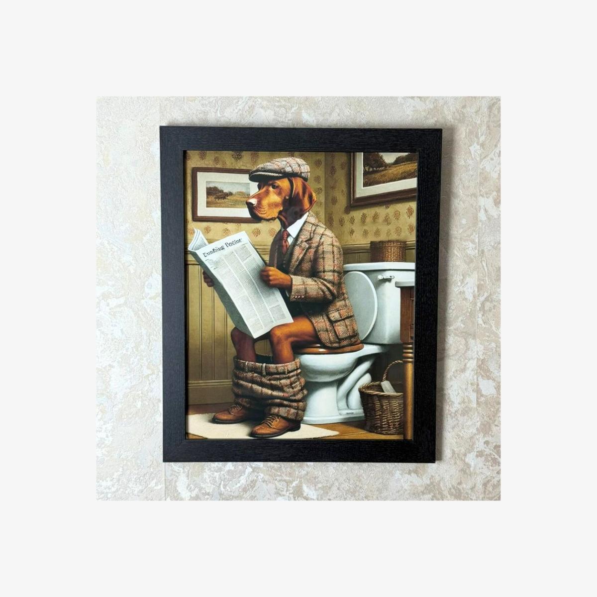 Lavatory Vizsla wall art, featuring a black wooden frame. Playful and full of personality, the Lavatory Vizsla wall art brings humour and charm to your bathroom. Set within a black wooden frame, this artwork captures a scene of a Hungarian vizsla dressed in hunting gear, set in a cosy, country-style bathroom and absorbed in reading a newspaper. Ideal for bathrooms, cloakrooms or anywhere in need of a light-hearted touch, this artwork combines classic pet portraiture with a fun, unexpected twist—sure to bring a smile.