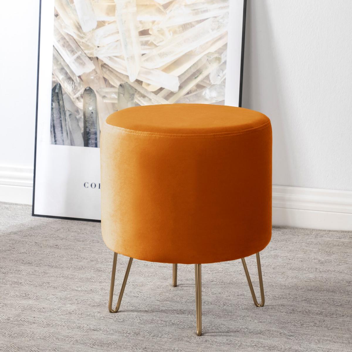 I love this little orange footstool for its bold colour and versatile design. It works beautifully in both contemporary and retro interiors, adding a pop of colour without overpowering the space. Its compact size makes it a practical addition to living rooms or bedrooms, perfect for use as extra seating or a cosy footrest. For styling tips, consider pairing it with neutral sofas or minimalist furniture to make the orange stand out, or coordinate with other warm tones and textures for a lively, inviting look. Its simple metal legs give it a modern edge, making it a stylish yet functional piece that can easily be moved around to suit your layout needs.