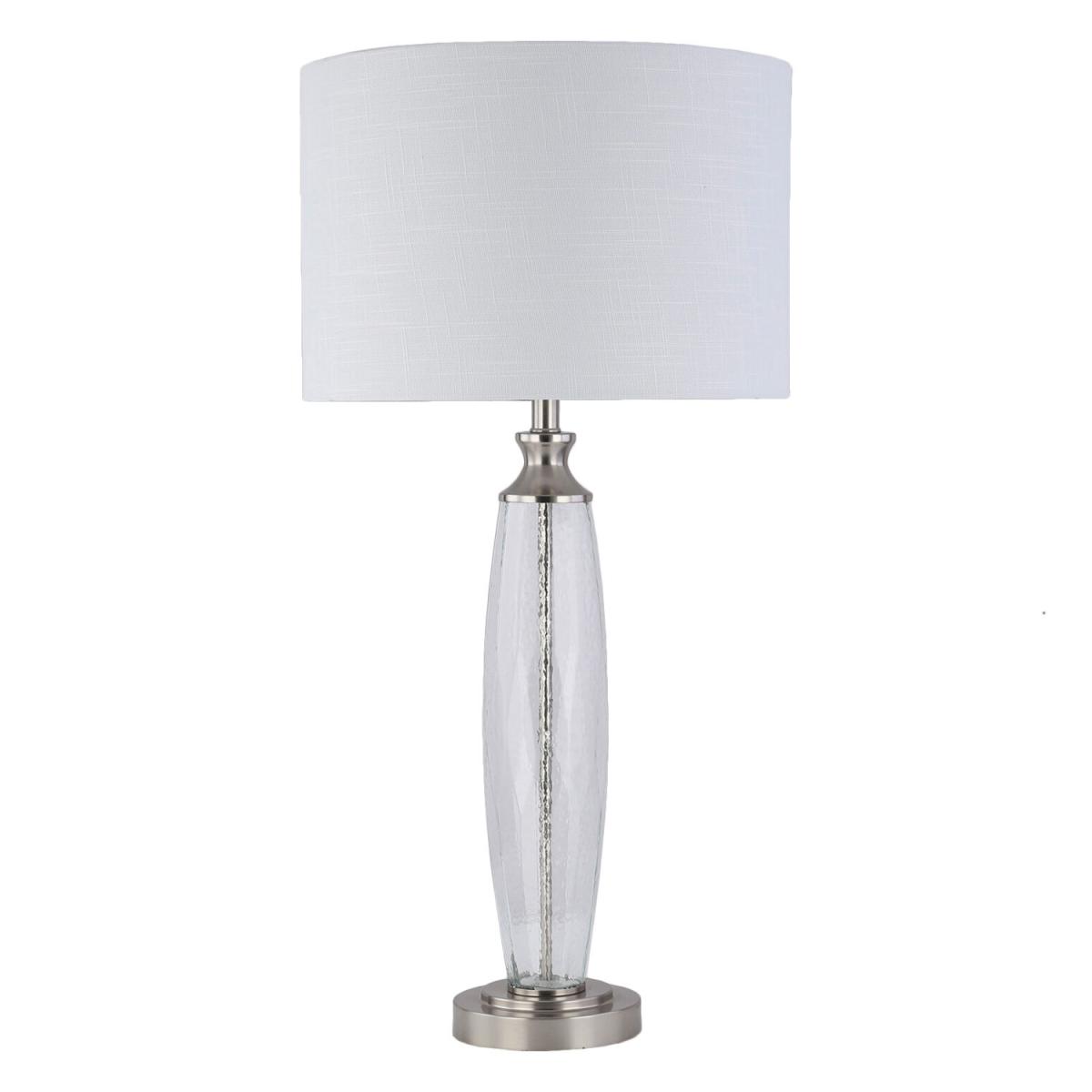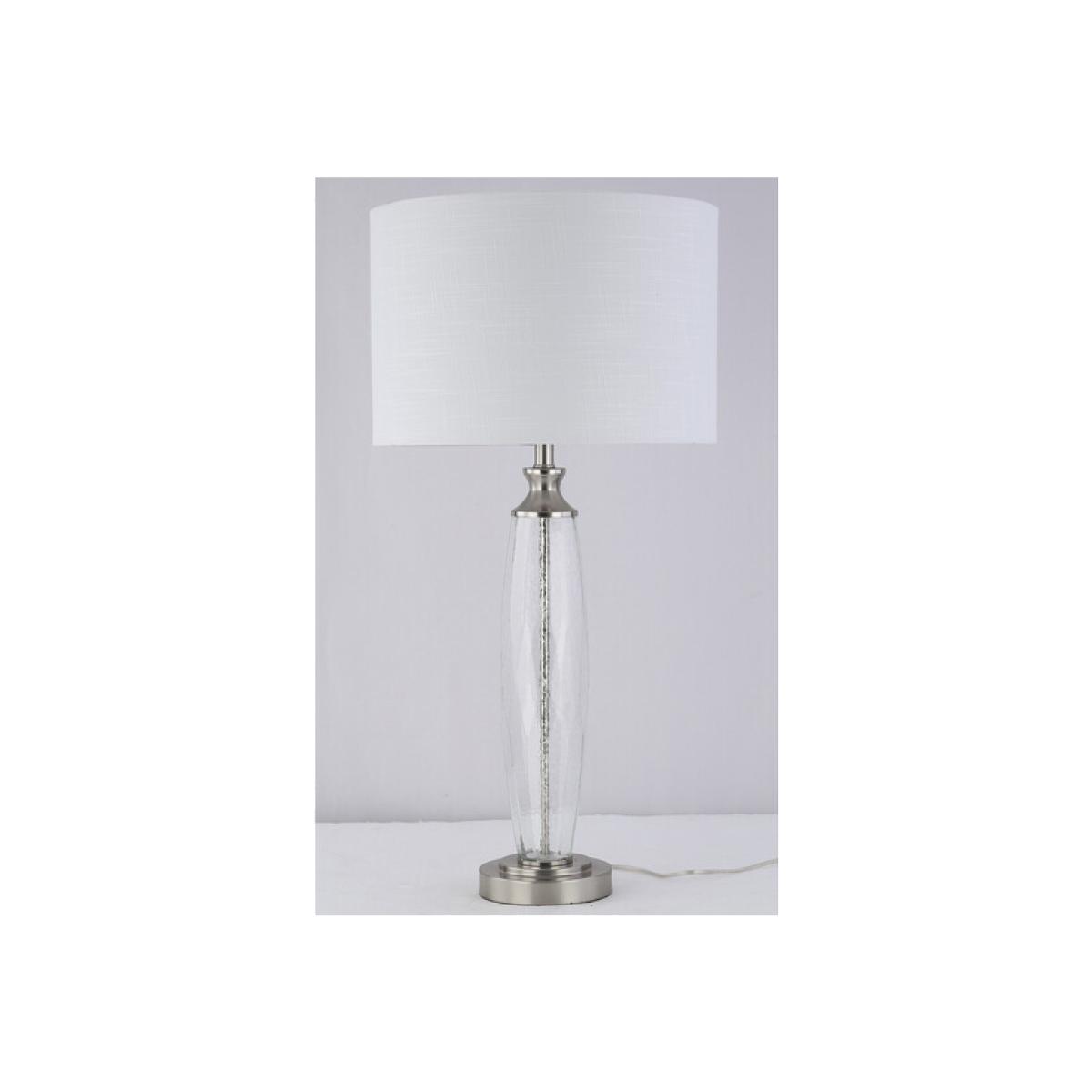 With sleek textured glass encasing a chromed pole, the Lavina Glass Table Lamp is a simple yet stunning table lamp that will bring elegance to your home. Finished on either end with a solid, satin chrome base and a rough-textured shade, this sophisticated light will help create a light and airy ambience when turned on in the evenings.