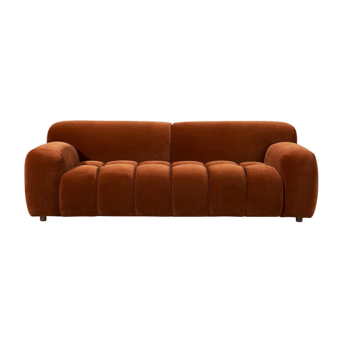 I love this sofa for its bold, vibrant orange fabric, which adds a cheerful focal point to any room. It works particularly well in eclectic, mid-century modern, or contemporary interiors where colour can be used to define the space. The chunky silhouette and plush upholstery make it inviting and comfortable, perfect for relaxed living. For styling tips, pair it with neutral or contrasting coloured cushions and throws to keep the look balanced, or introduce complementary tones like teals or navy for a more curated feel. Its size makes it versatile in both larger open-plan spaces and more intimate settings, and it can be effortlessly styled with statement lighting and minimal accessories to highlight its vibrant colour without overwhelming the room.