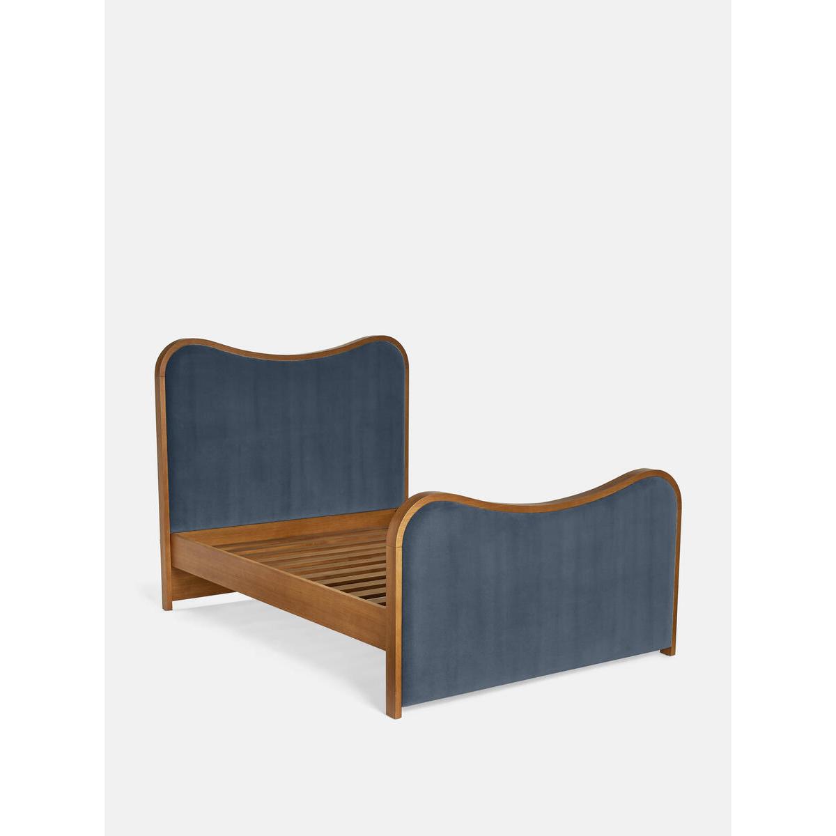 The bed frame is a stylish choice for adding colour and texture to a variety of interiors. I love the rich, velvety grey blue upholstery which brings a sense of softness and sophistication. It works particularly well in contemporary or mid-century styled bedrooms, but can also elevate more eclectic spaces. For practical styling, consider contrasting cushions in warm tones or metallic accents to create visual interest. The neutral yet striking hue makes it versatile enough to pair with both light and dark bedding, while its sturdy wooden frame lends durability and a timeless appeal that can complement various colour palettes. Overall, it’s a statement piece that blends comfort with elegant design.