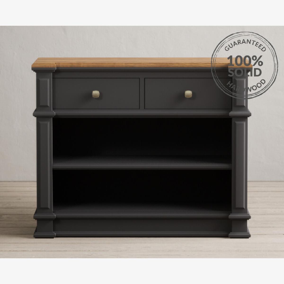The Lawson Charcoal Grey Console Table features a grey painted solid hardwood frame and 100% solid oak top, complete with a shelf and two Dovetail drawers.