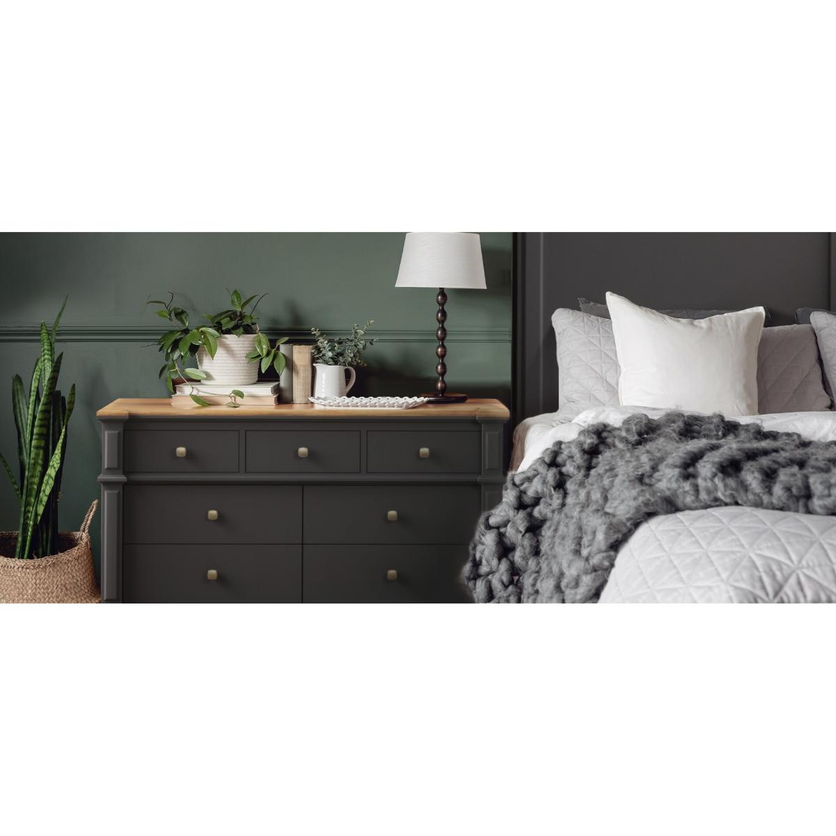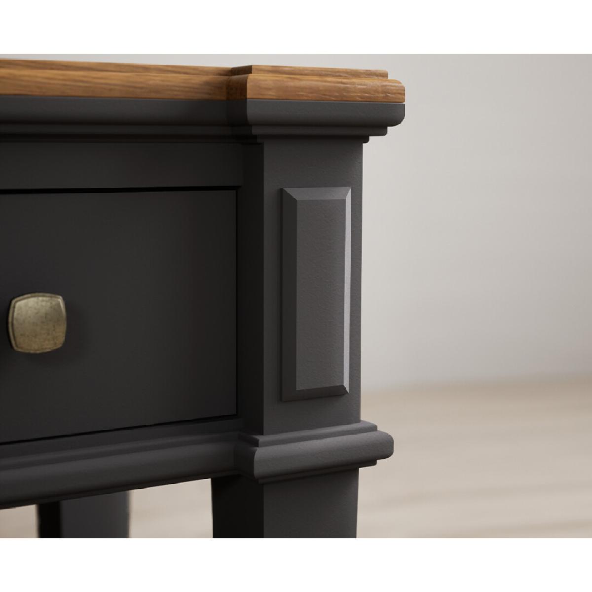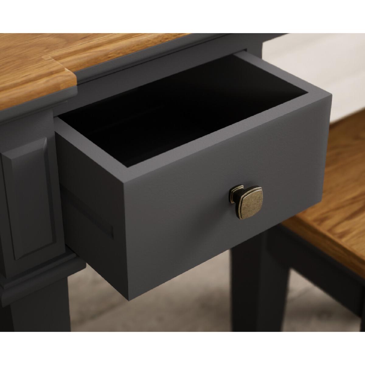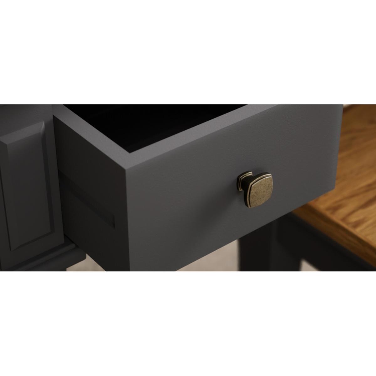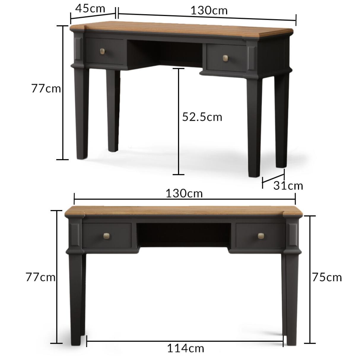 The Lawson Charcoal Grey Dressing Table is crafted from solid hardwood with a grey painted finish and topped with 100% solid oak. Complete with two Dovetail drawers and metal knob handles.