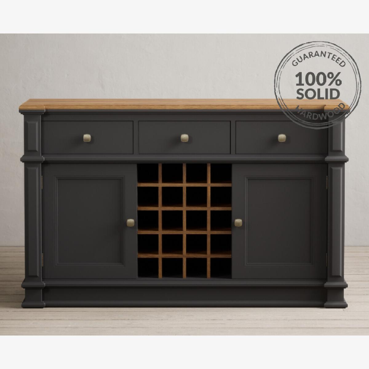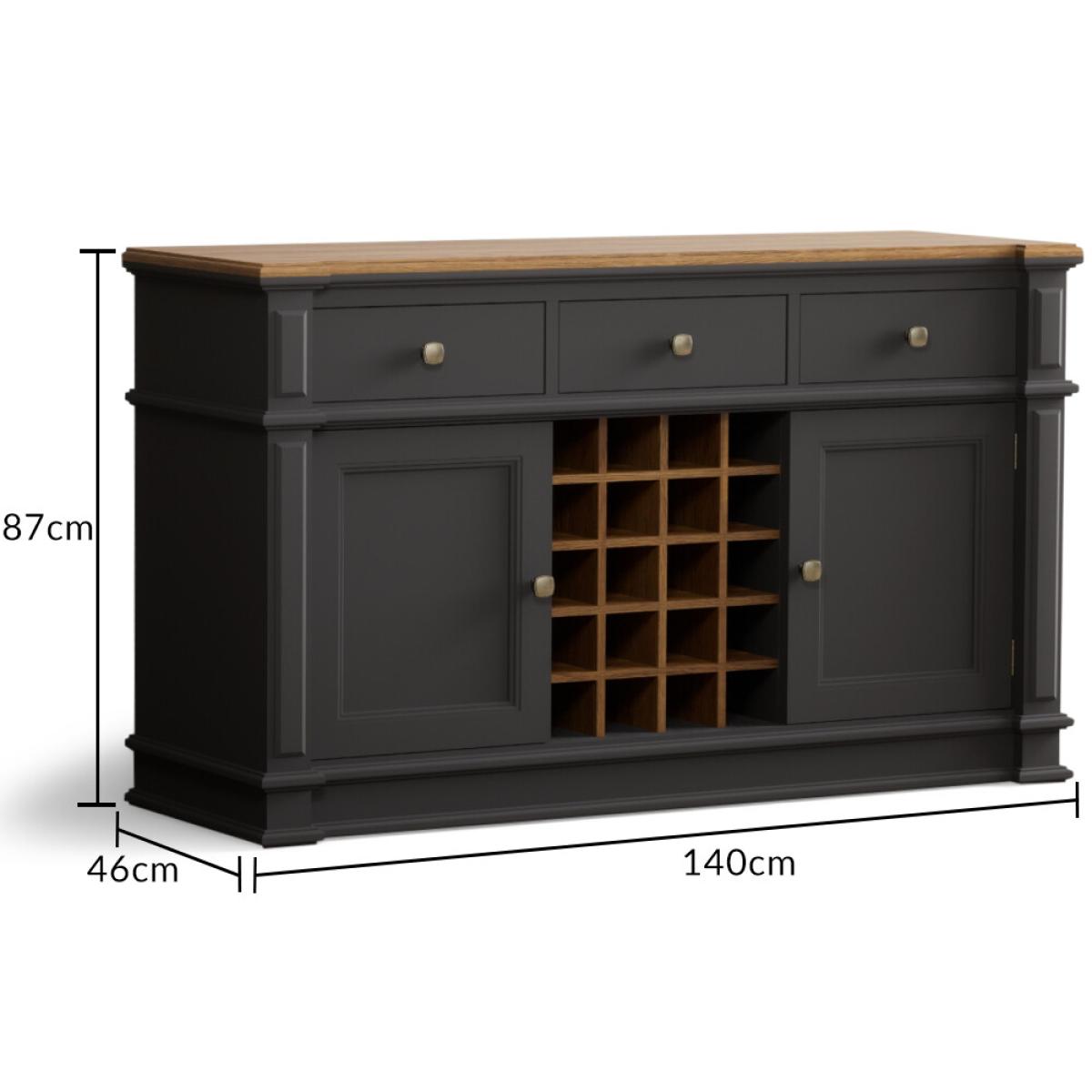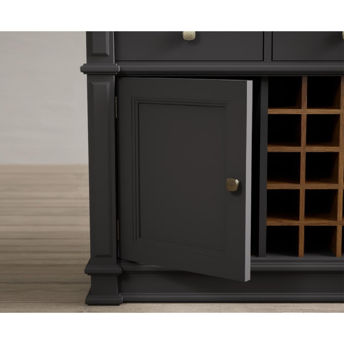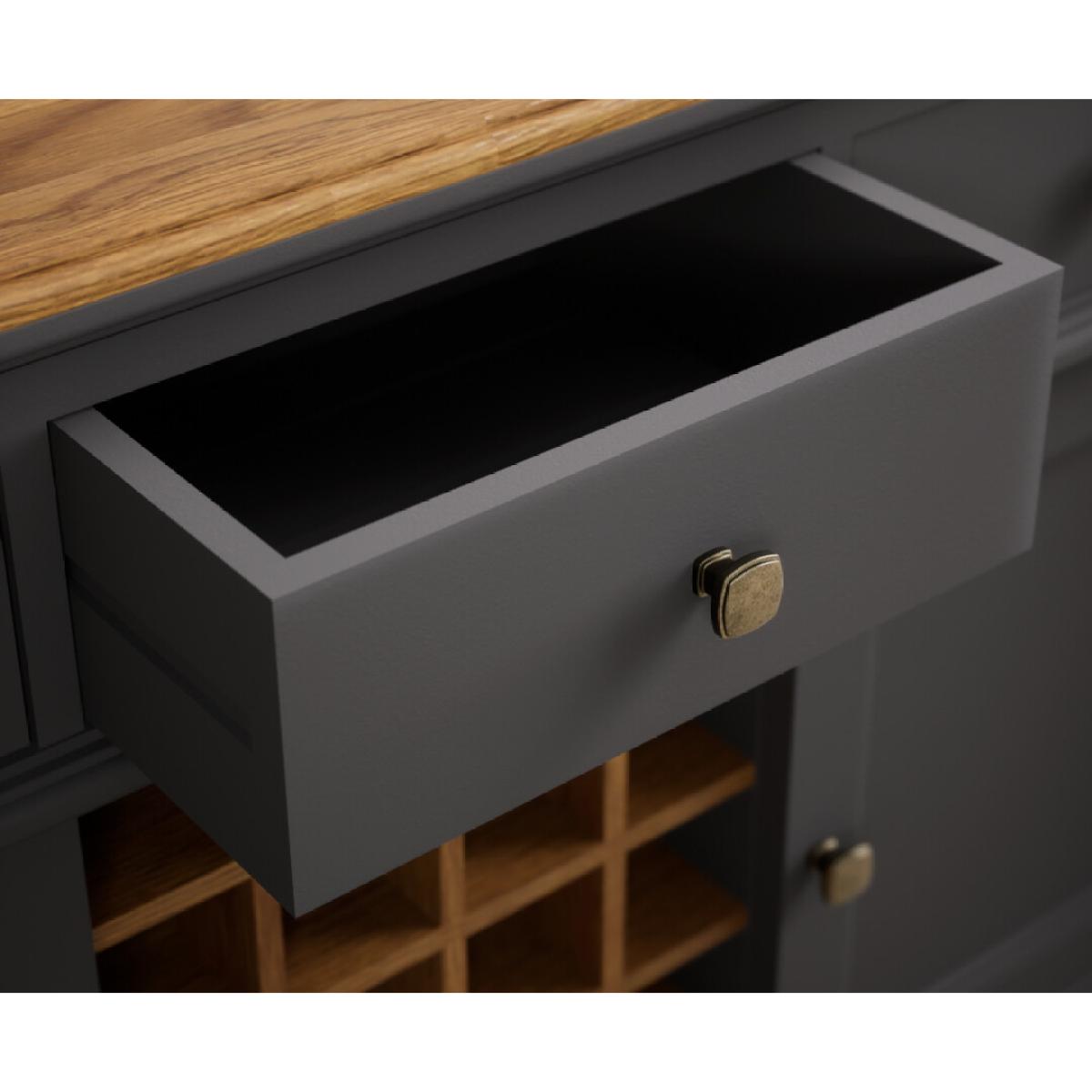The Lawson Charcoal Grey Large Sideboard features a grey painted solid hardwood frame with a 100% solid oak top, Dovetail drawers, bottle storage and cupboards.