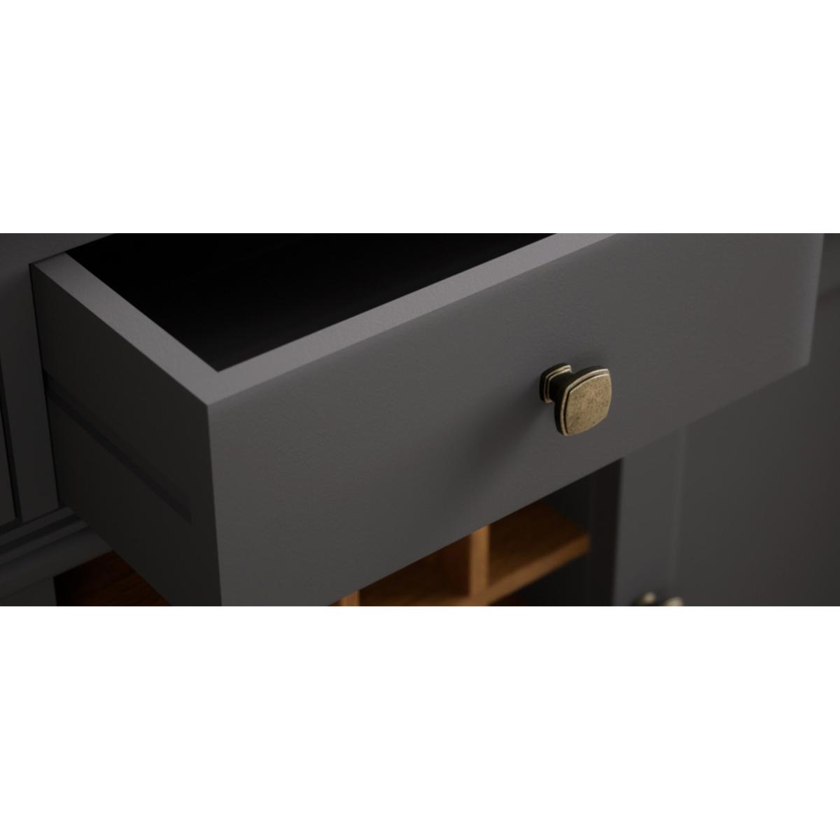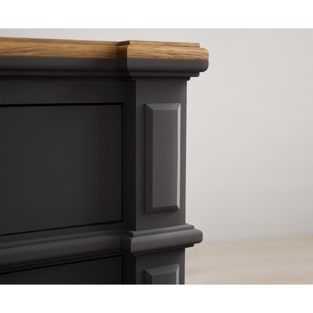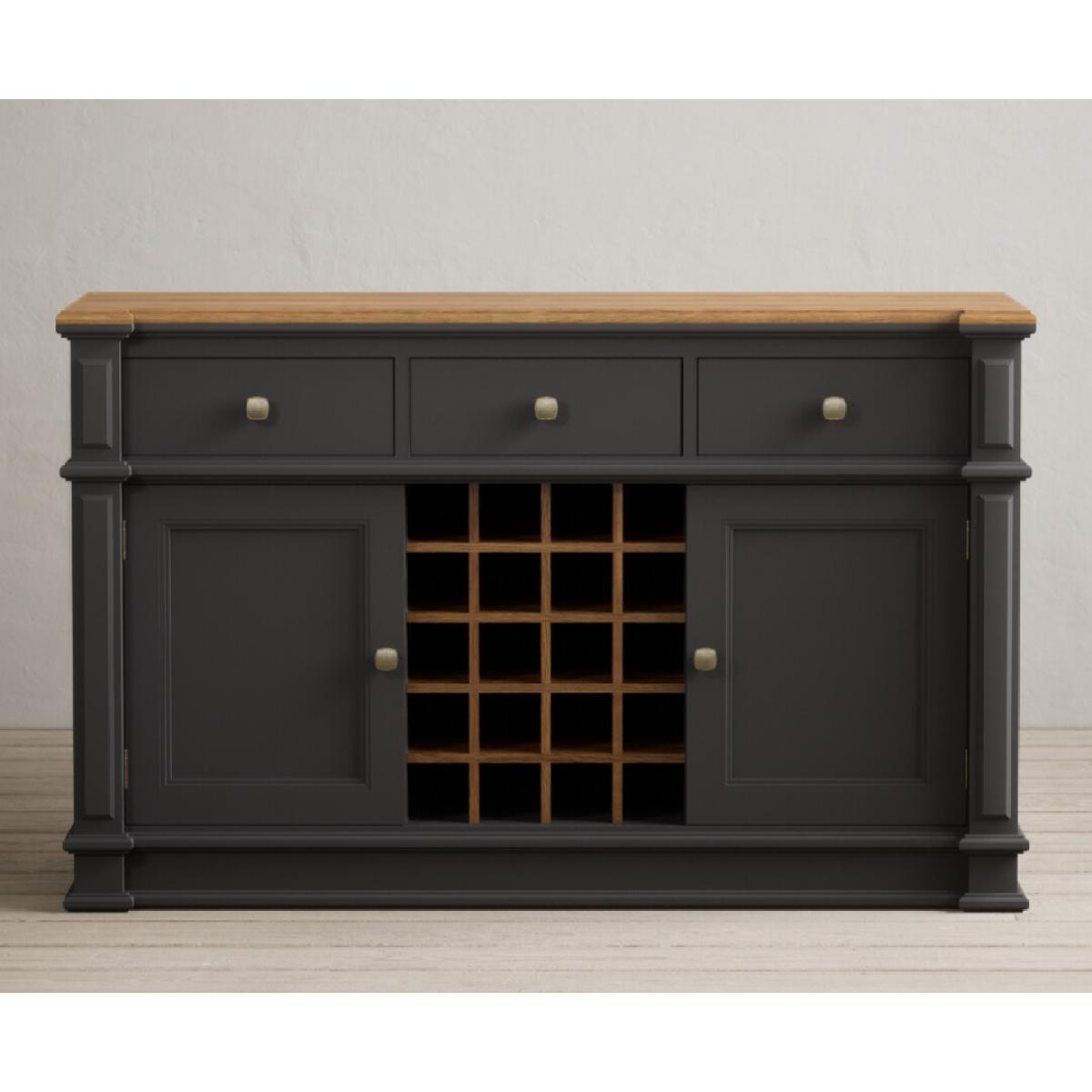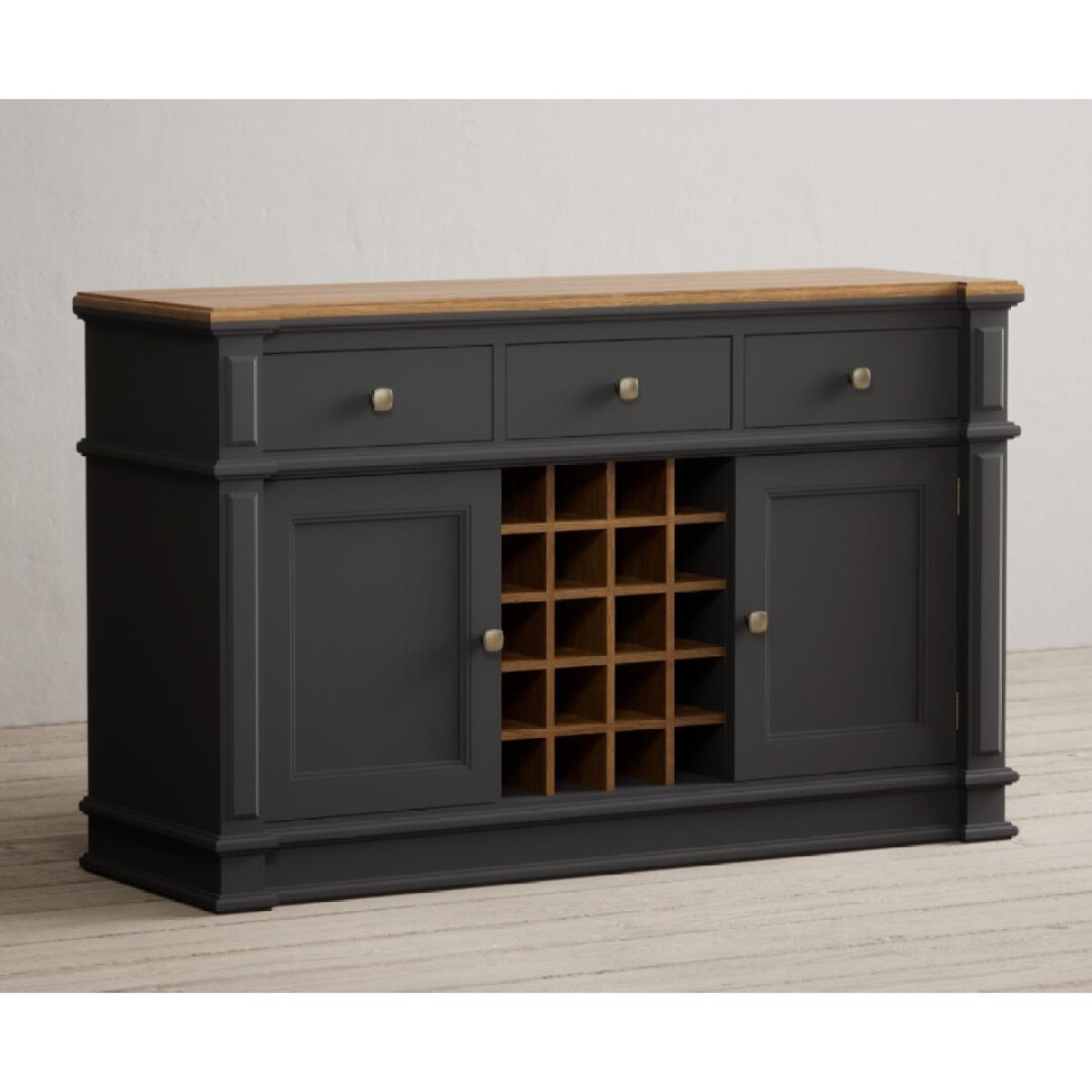 The Lawson Charcoal Grey Large Sideboard features a grey painted solid hardwood frame with a 100% solid oak top, Dovetail drawers, bottle storage and cupboards.