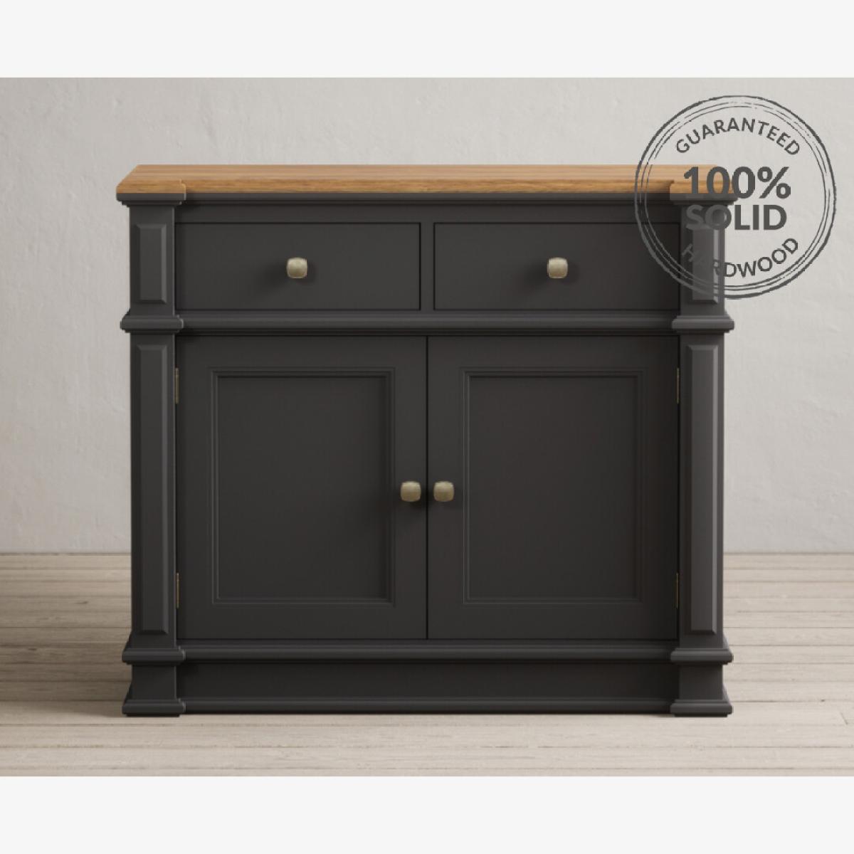 The Lawson Charcoal Grey Small Sideboard features a charcoal grey painted solid hardwood frame and 100% solid oak top, with Dovetail drawers and two cupboards.