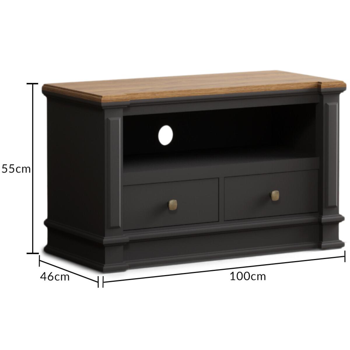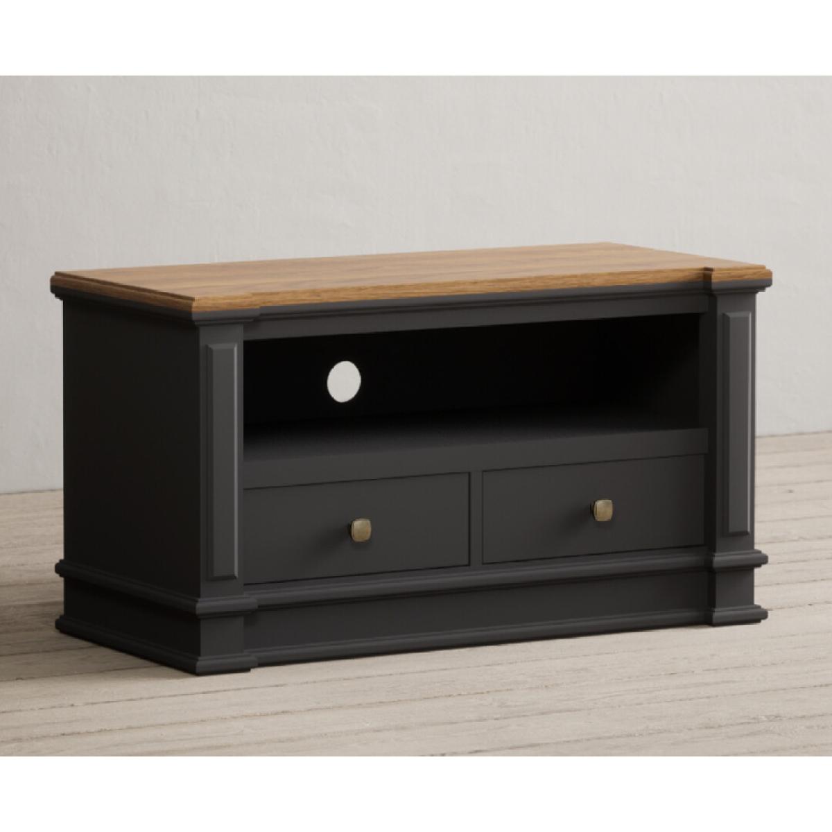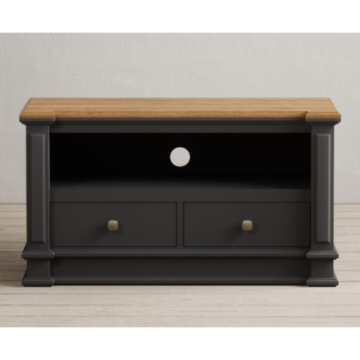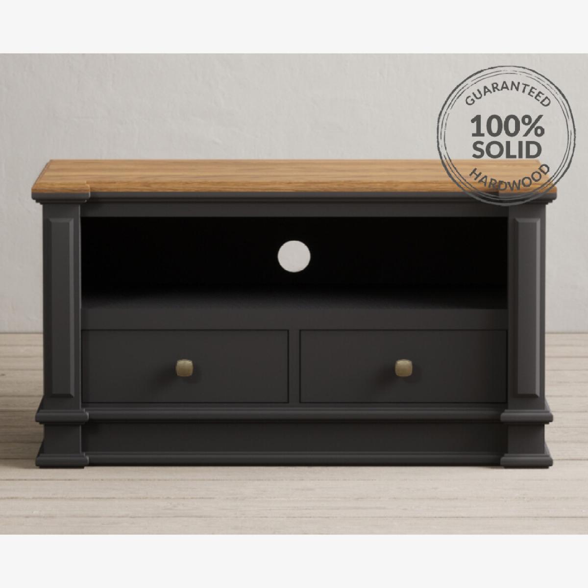 The Lawson Charcoal Grey Small TV Cabinet is crafted from solid hardwood with a charcoal grey painted finish and 100% solid oak top, cable management hole and two Dovetail drawers.