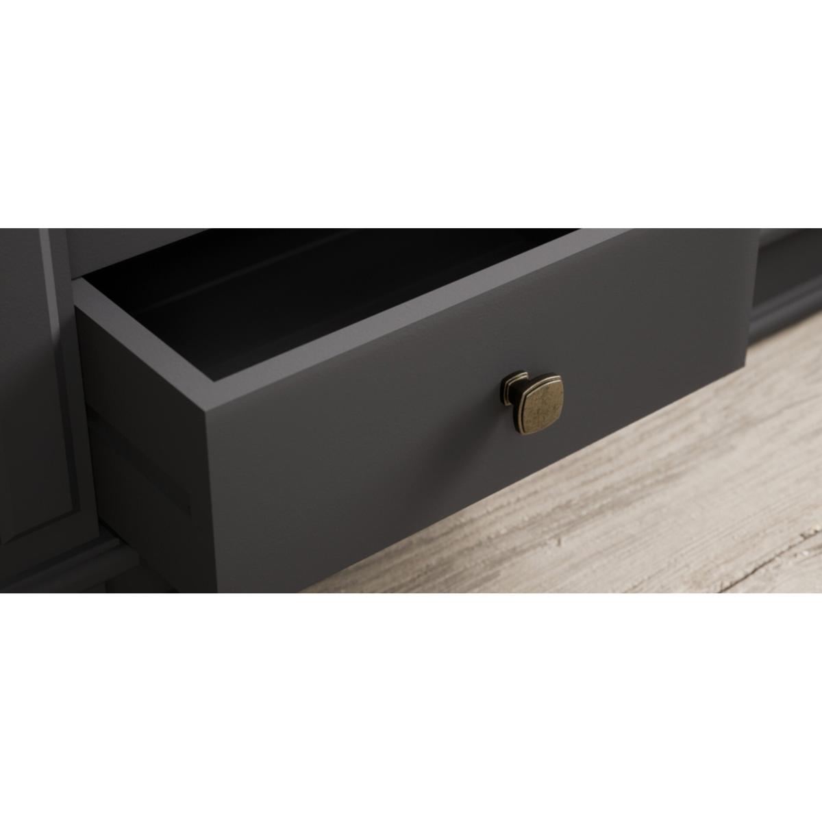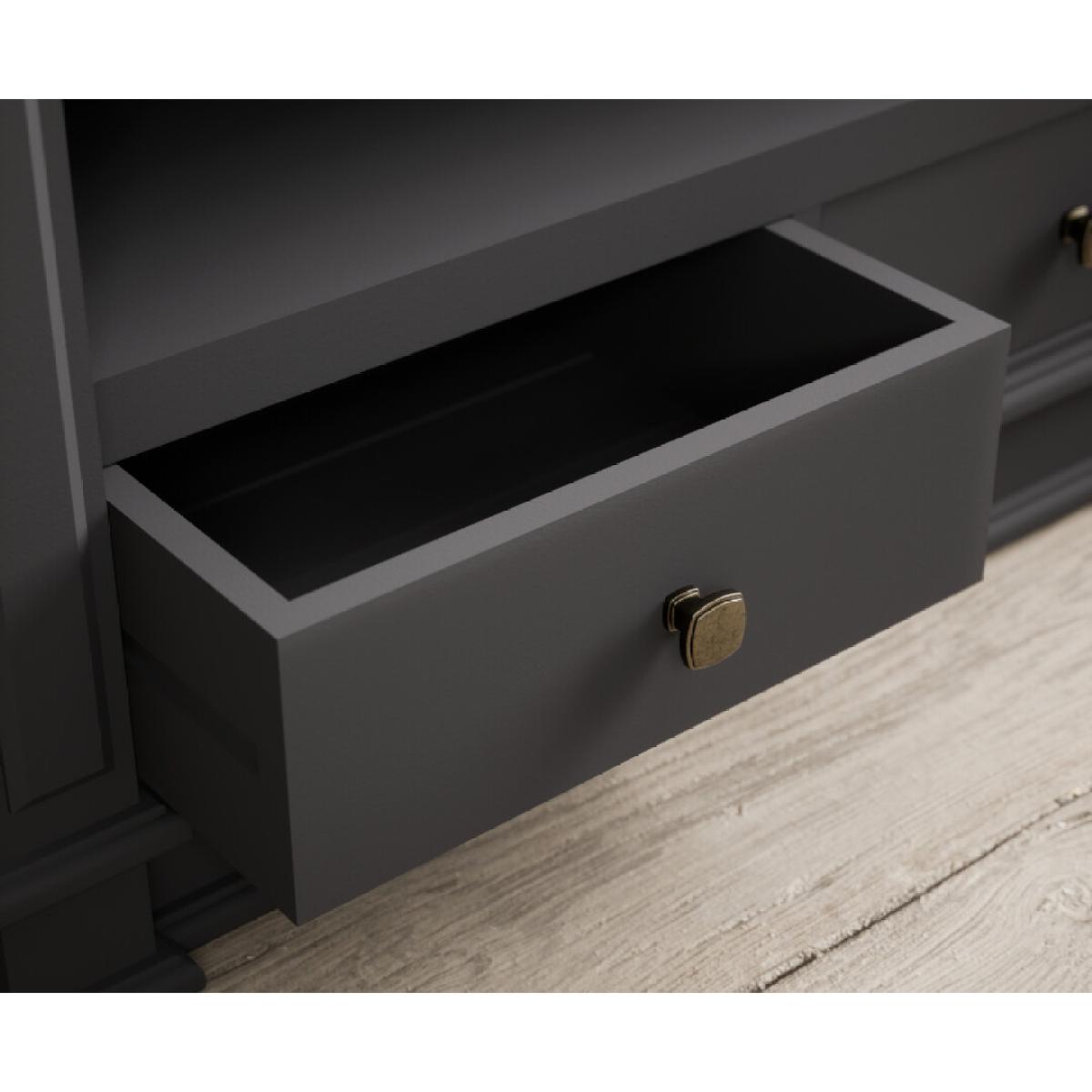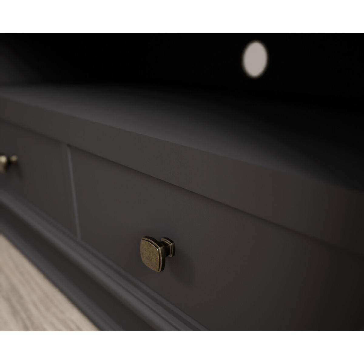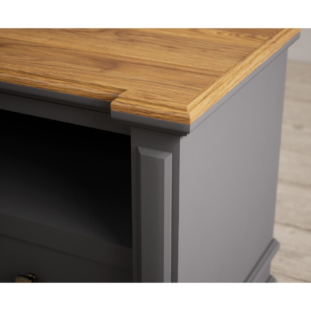 The Lawson Charcoal Grey Small TV Cabinet is crafted from solid hardwood with a charcoal grey painted finish and 100% solid oak top, cable management hole and two Dovetail drawers.