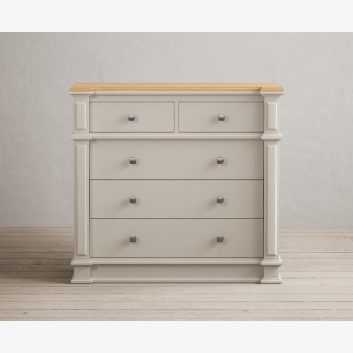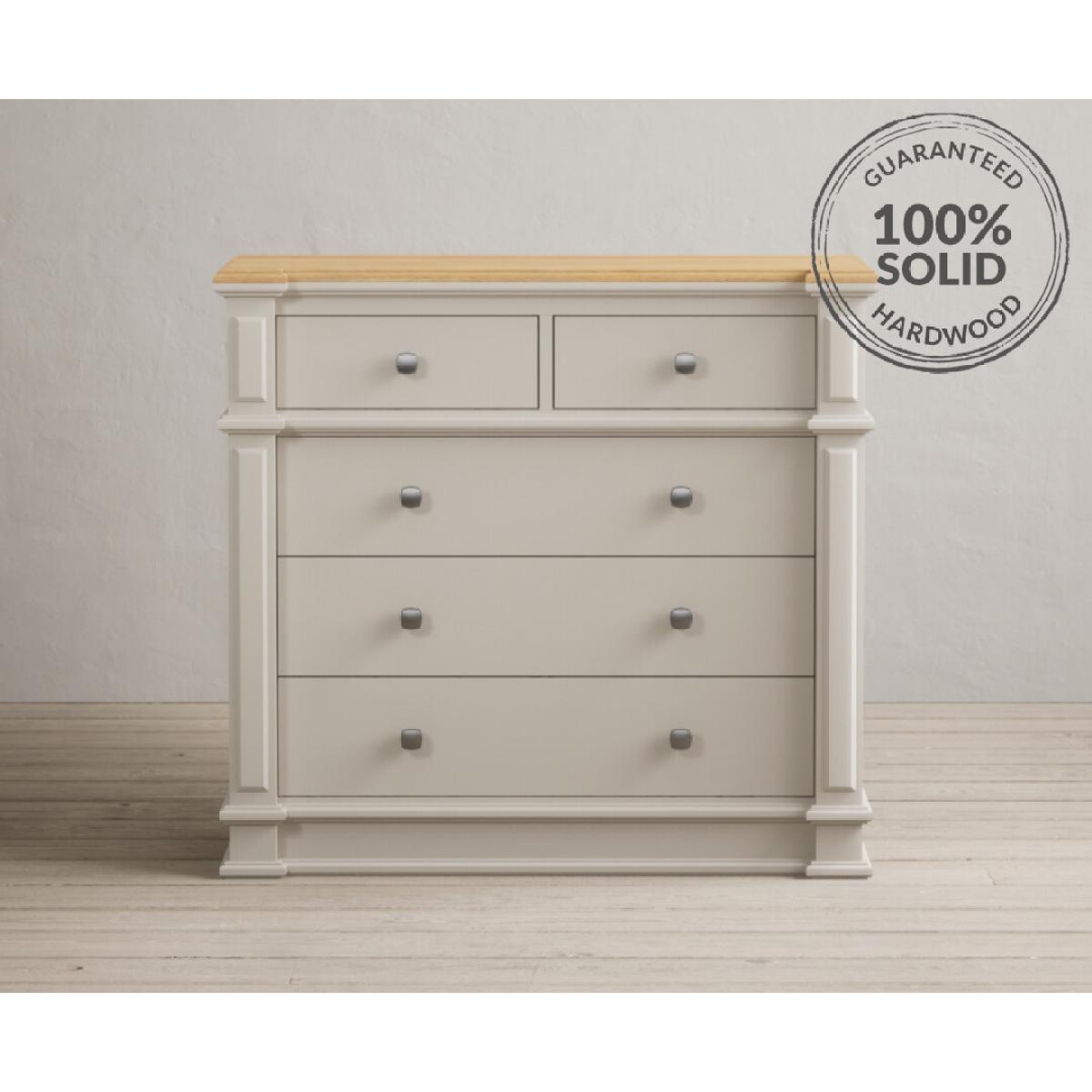 The Lawson Oak and Soft White 2 Over 3 Chest of drawers features a solid hardwood frame with a soft white painted finish and solid oak top, with five dovetail drawers on wooden runners.