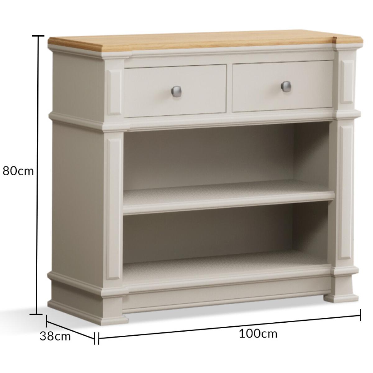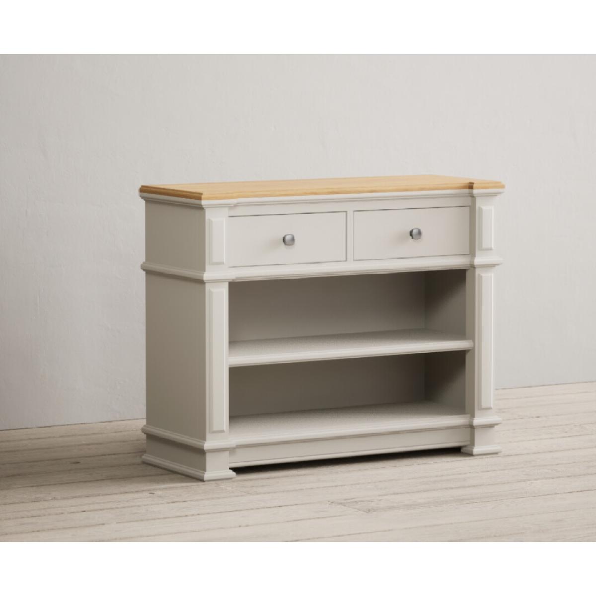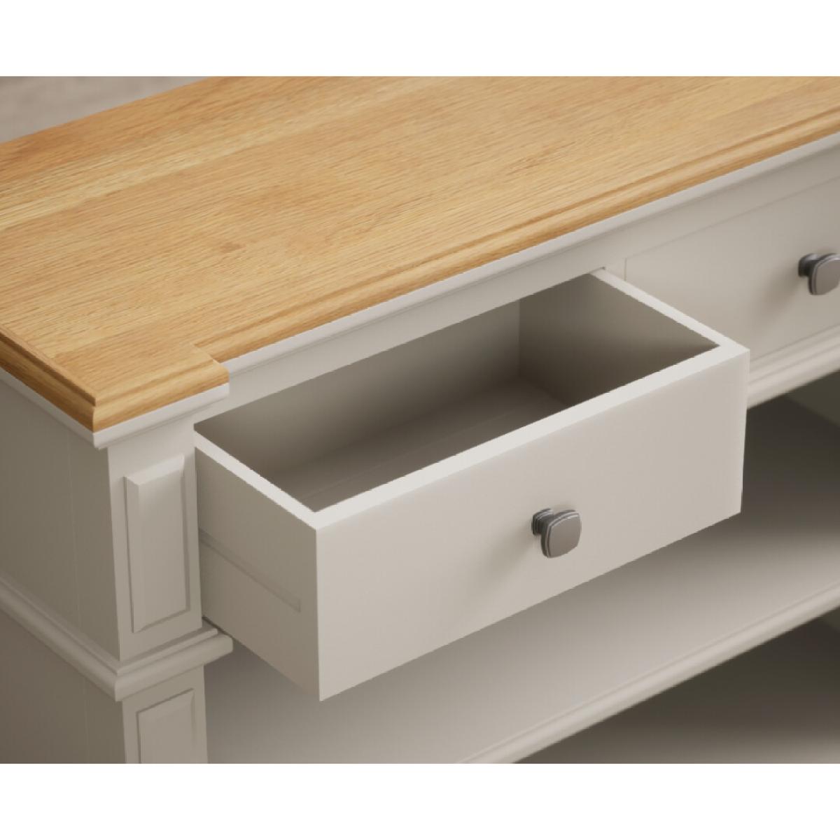 The Lawson Oak and Soft White Console Table features a soft white painted solid hardwood frame and 100% solid oak top, complete with a shelf and two dovetail drawers.