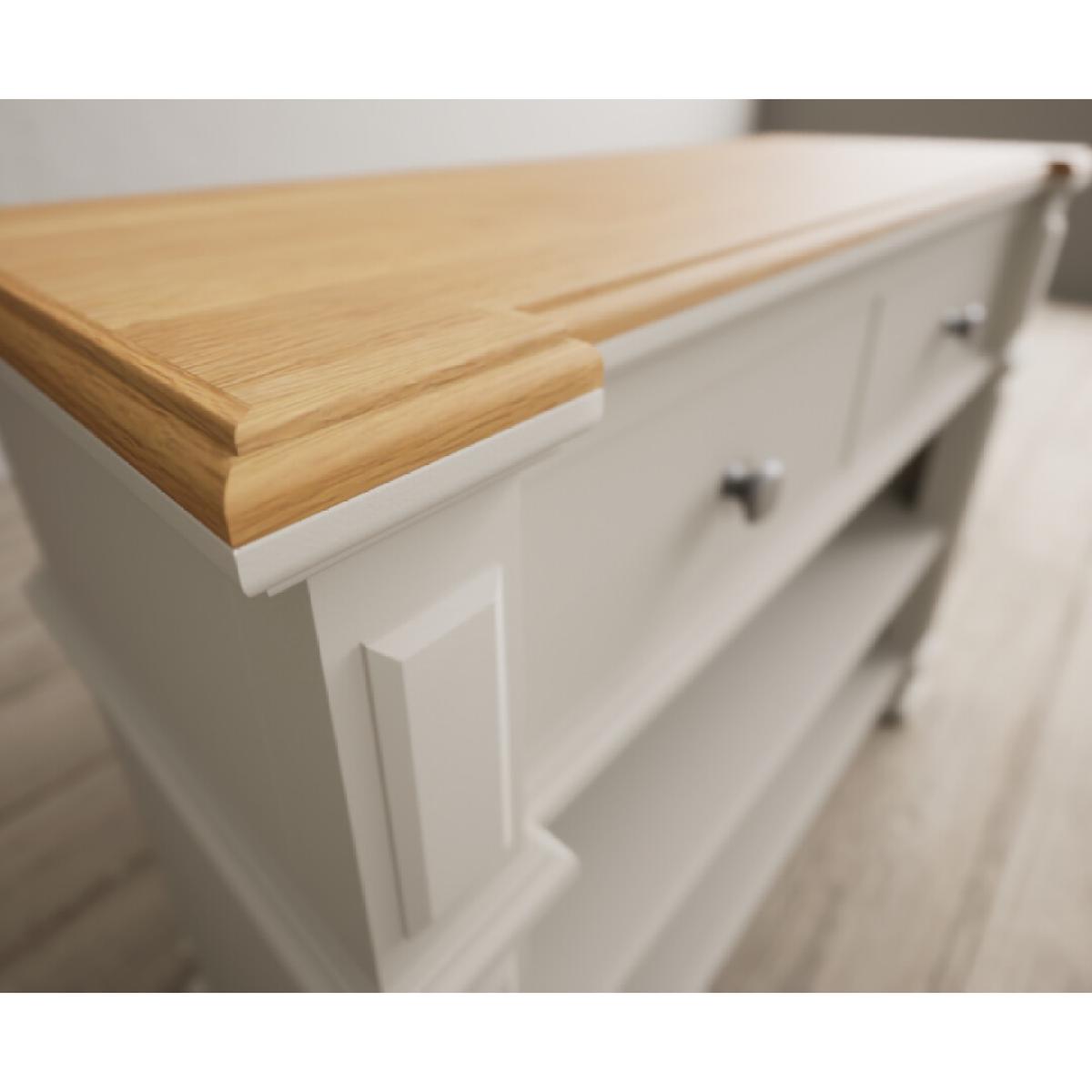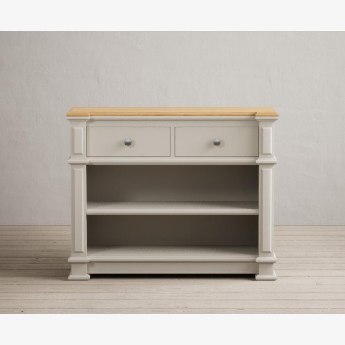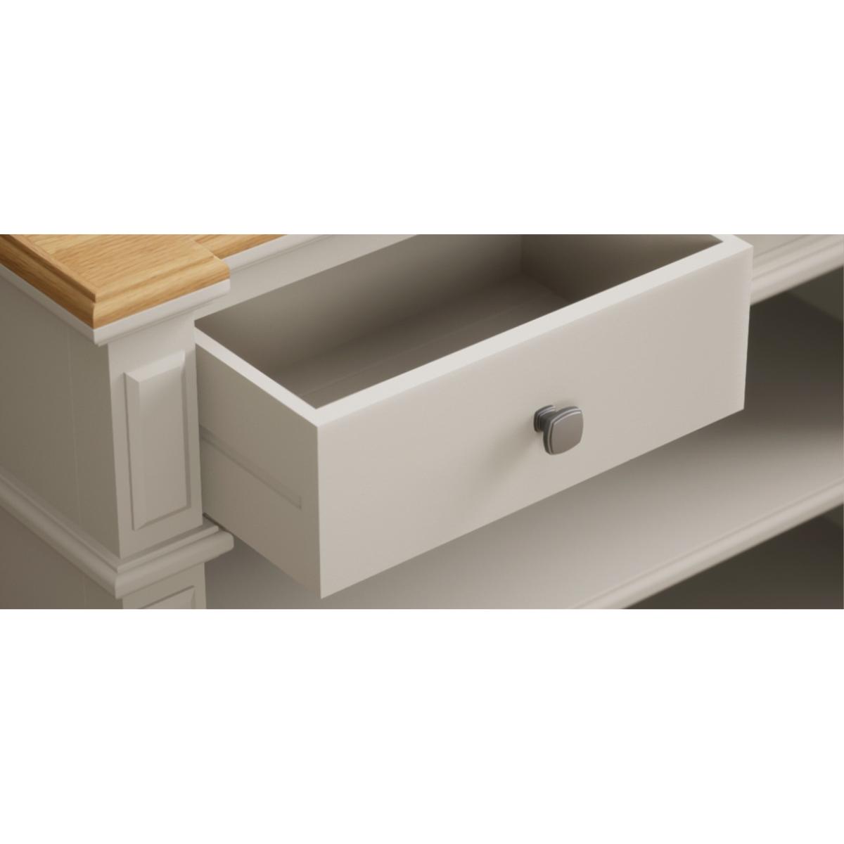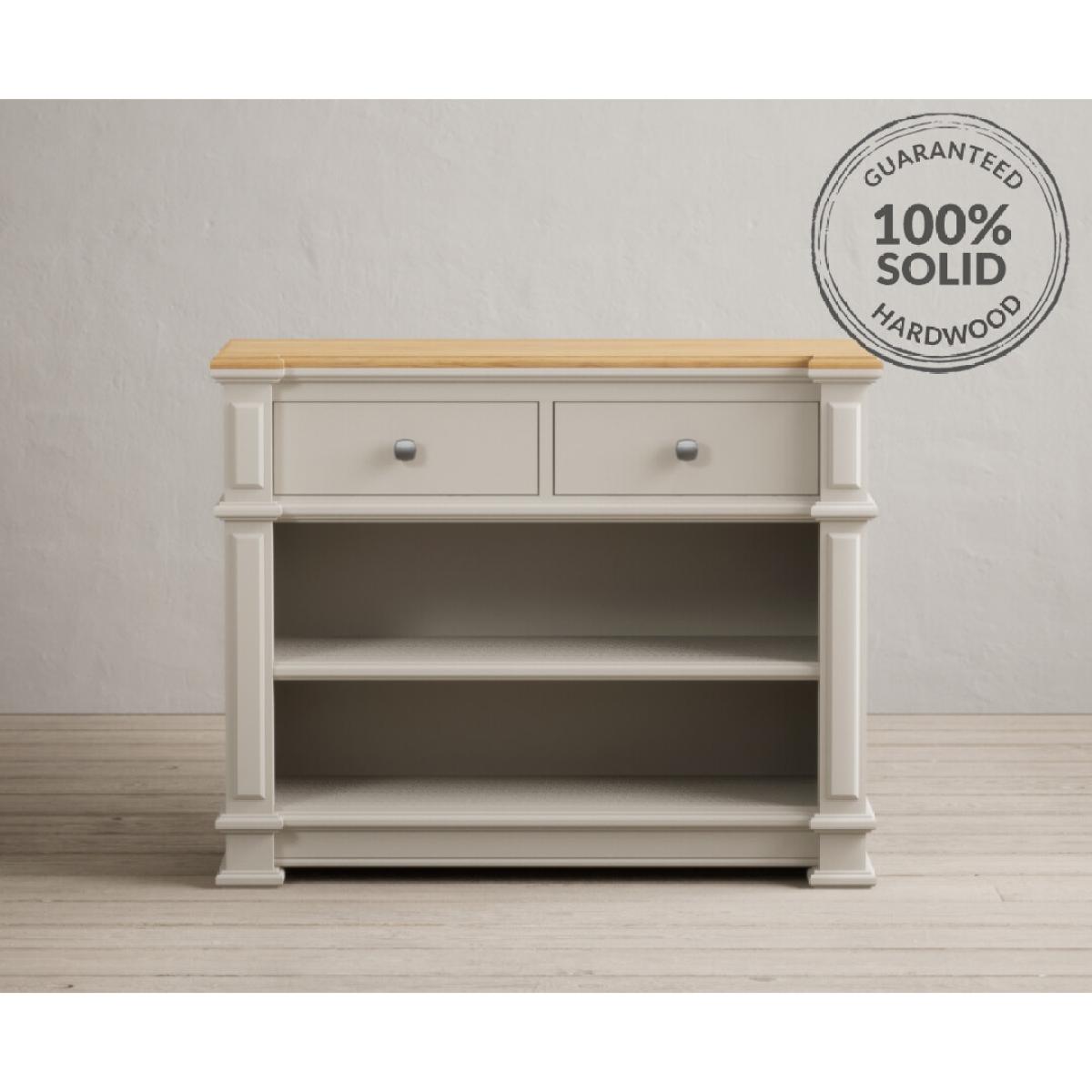 The Lawson Oak and Soft White Console Table features a soft white painted solid hardwood frame and 100% solid oak top, complete with a shelf and two dovetail drawers.