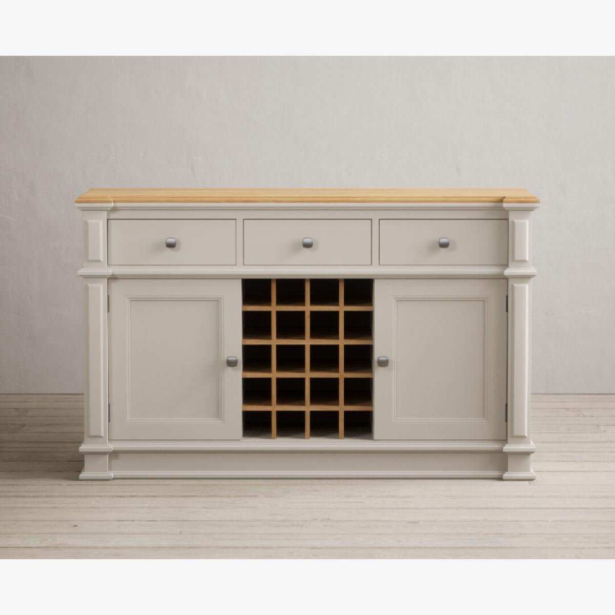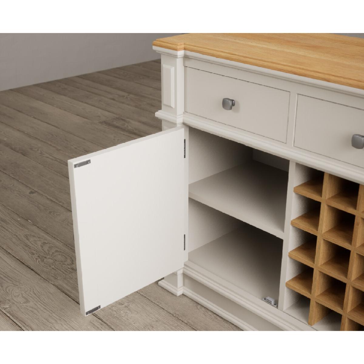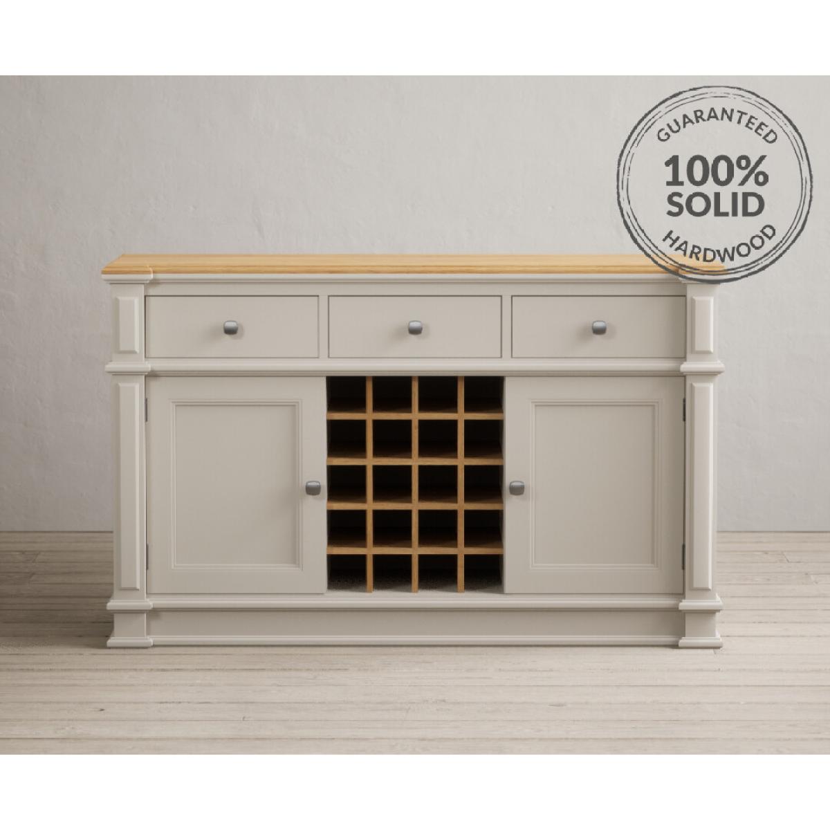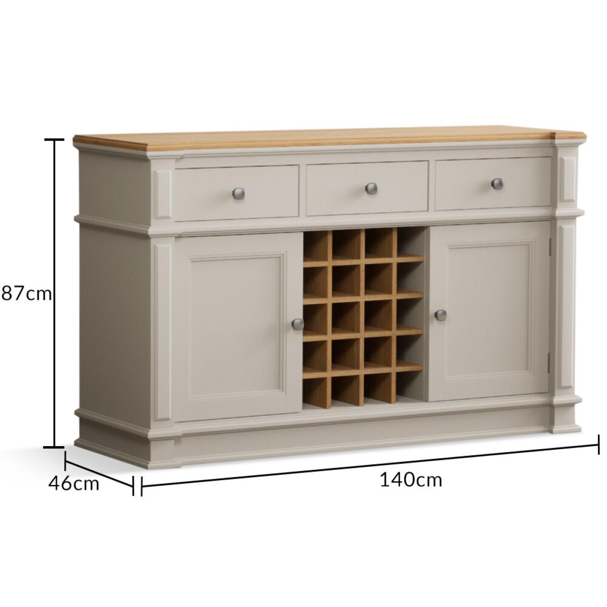 The Lawson Oak and Soft White Painted Large Sideboard features a soft white painted solid hardwood frame with a 100% solid oak top, dovetail drawers, bottle storage and cupboards.