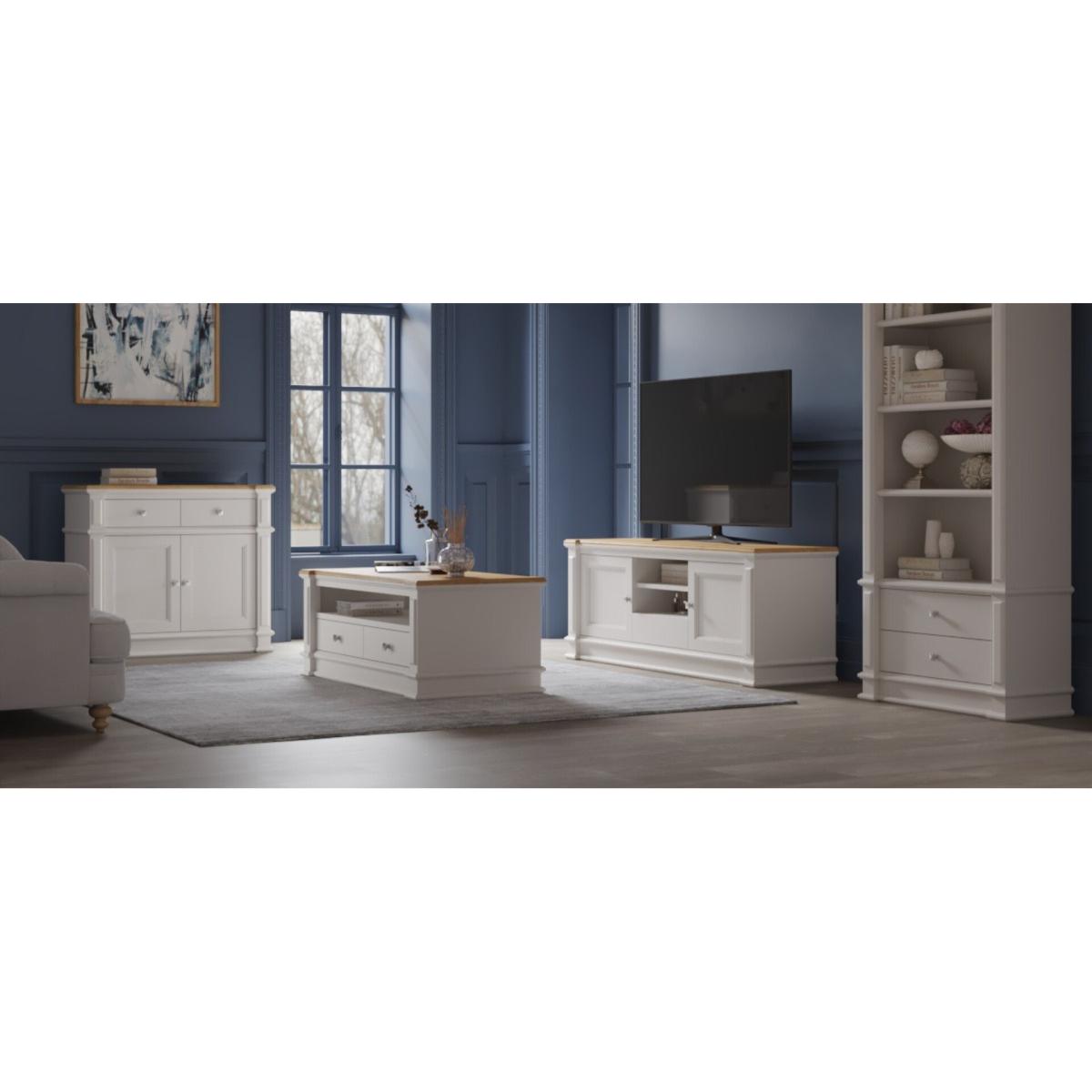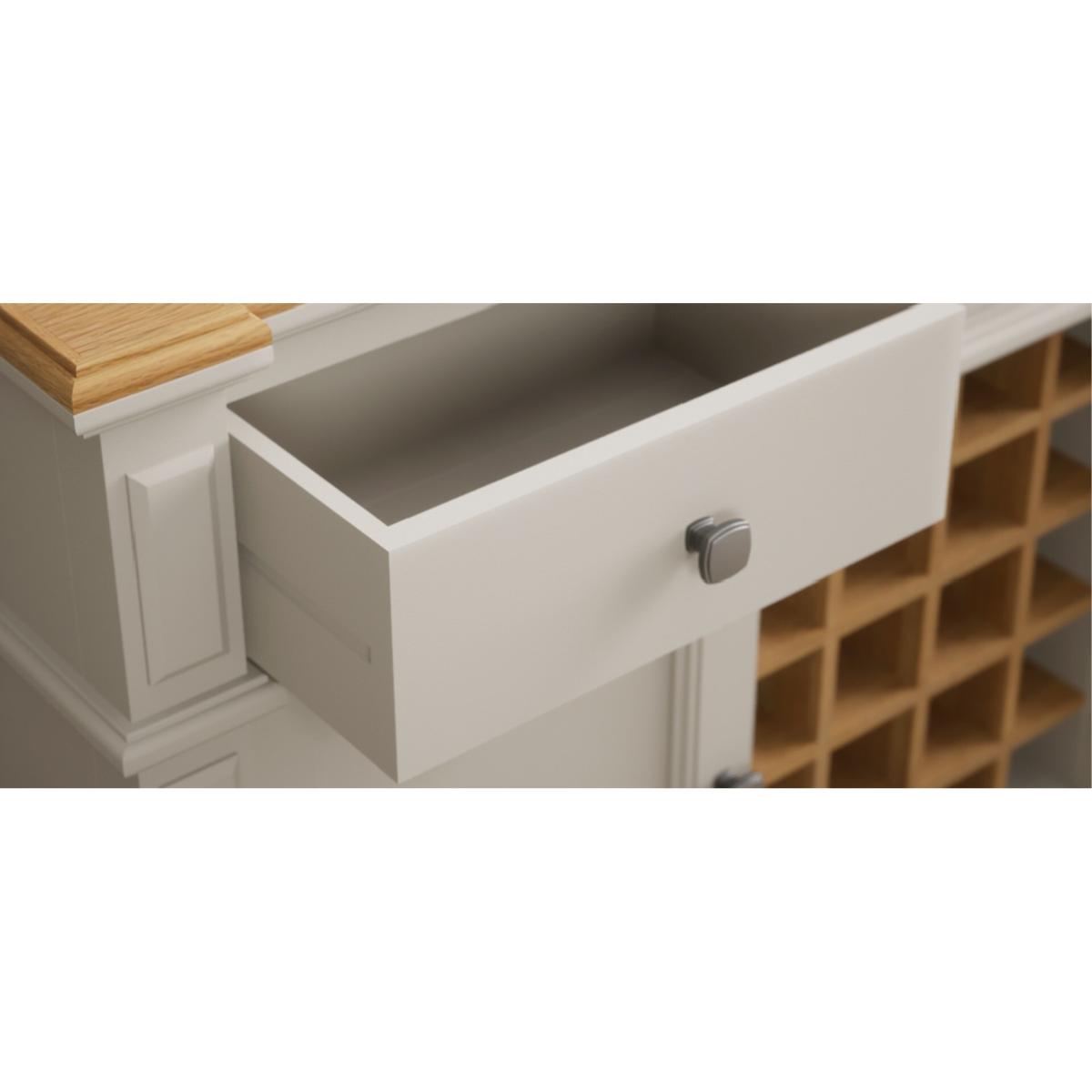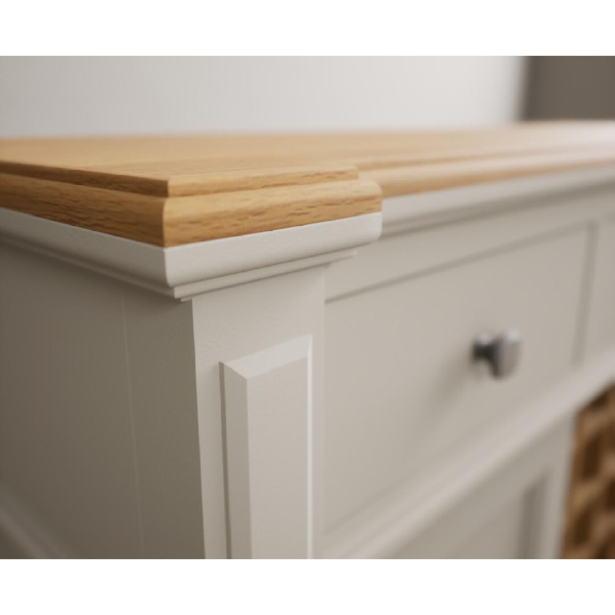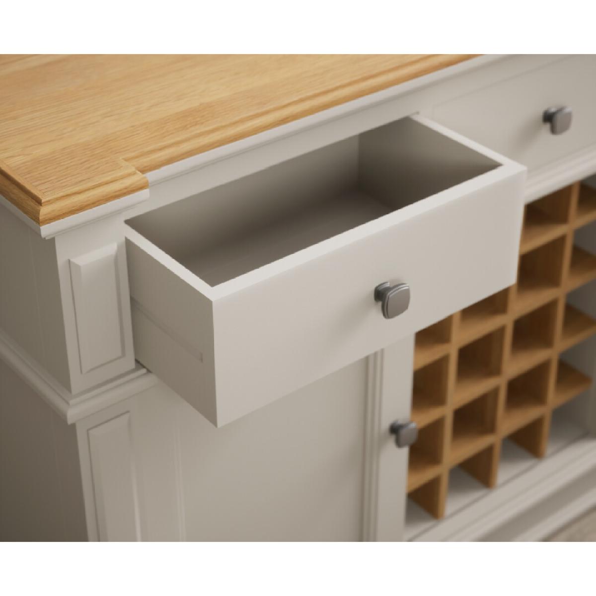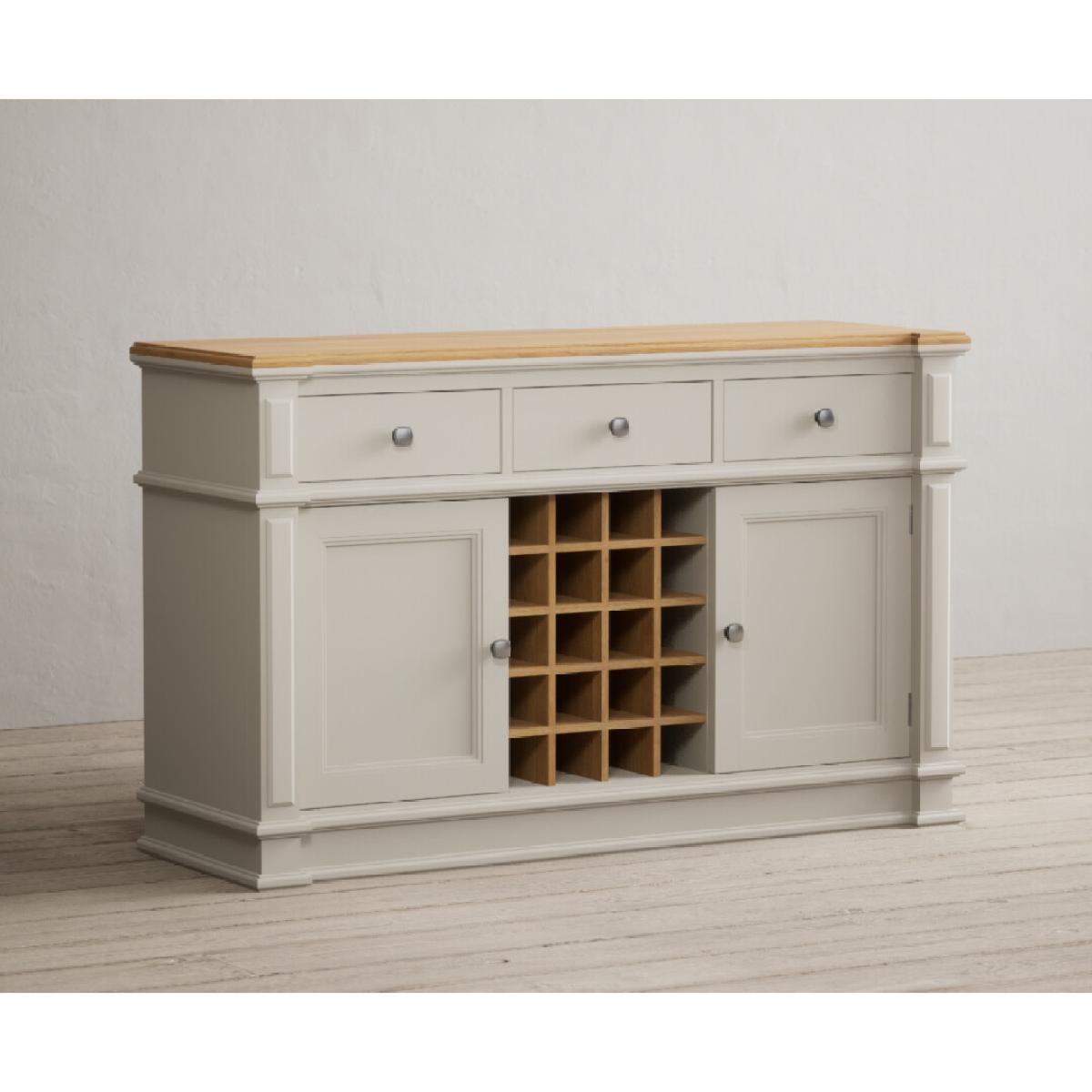The Lawson Oak and Soft White Painted Large Sideboard features a soft white painted solid hardwood frame with a 100% solid oak top, dovetail drawers, bottle storage and cupboards.