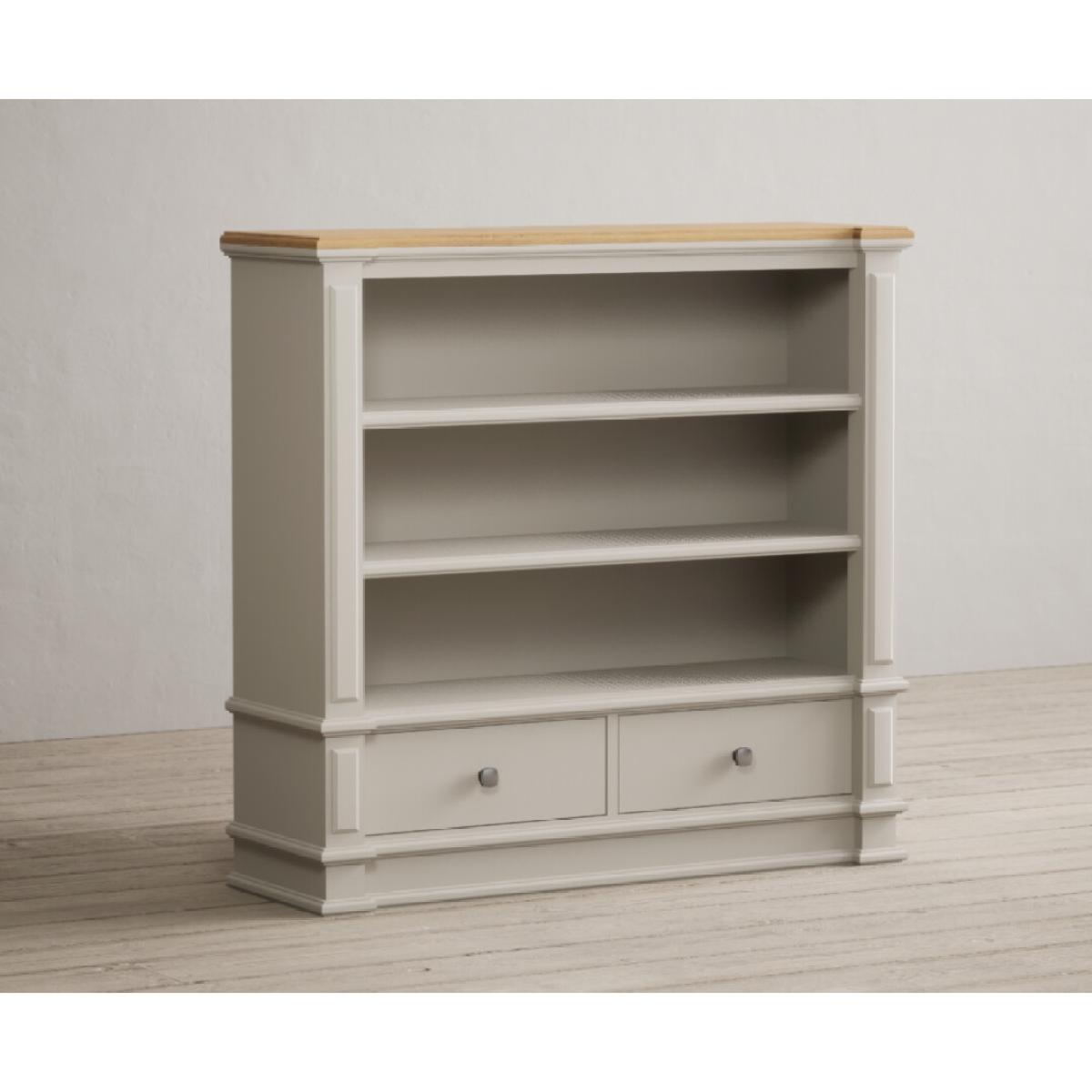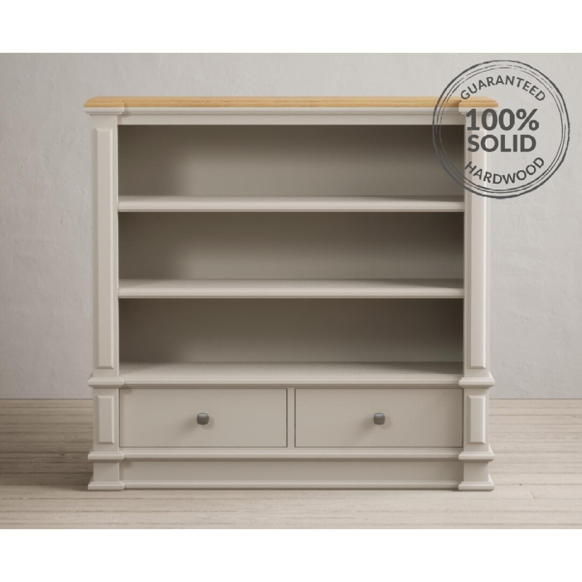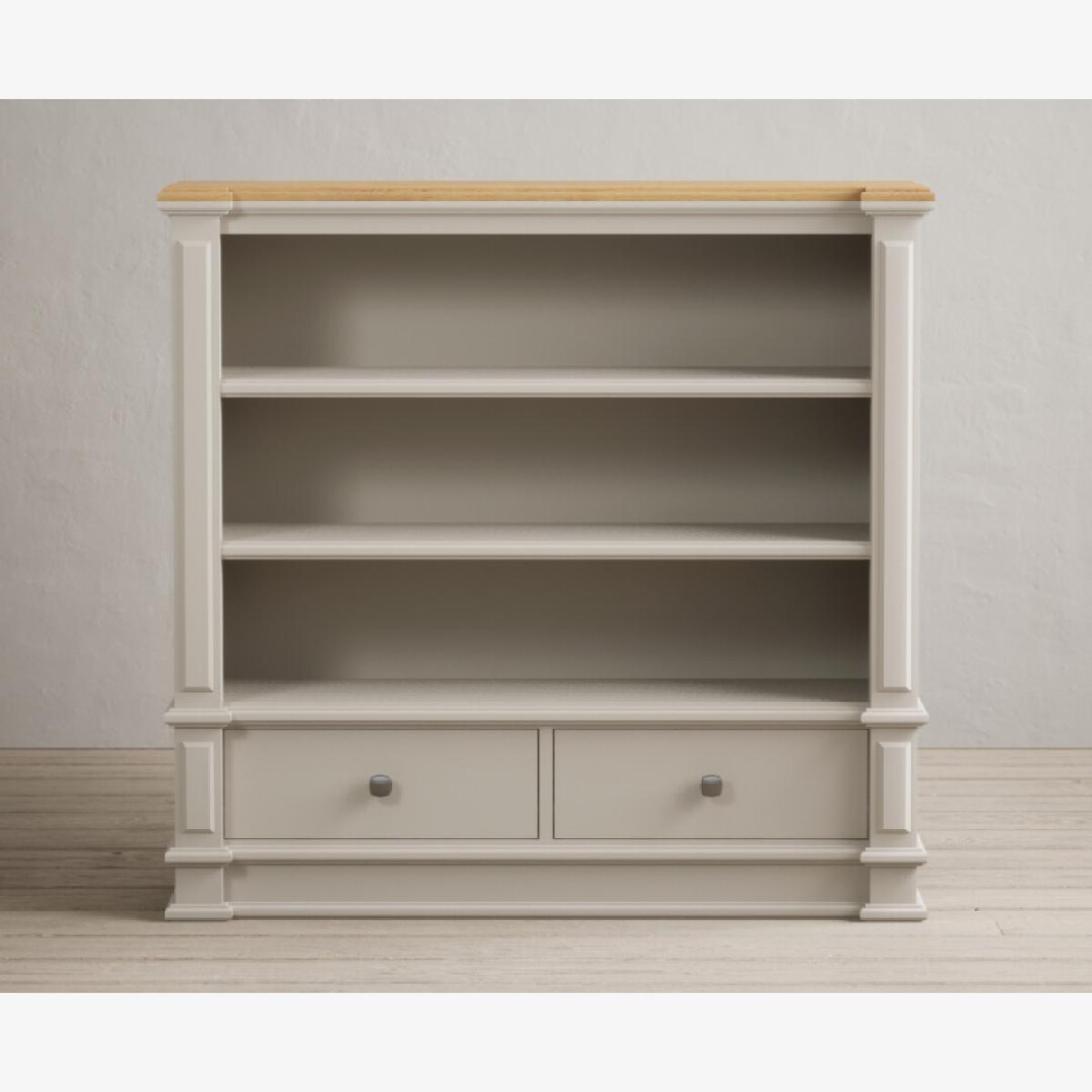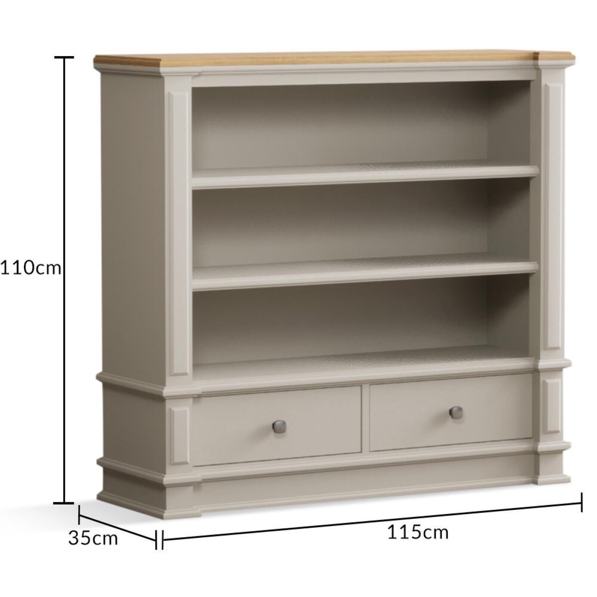 The Lawson Oak and Soft White Small Bookcase is crafted from solid hardwood with a soft white painted finish and solid oak top, with a sturdy shelf and two dovetail drawers.