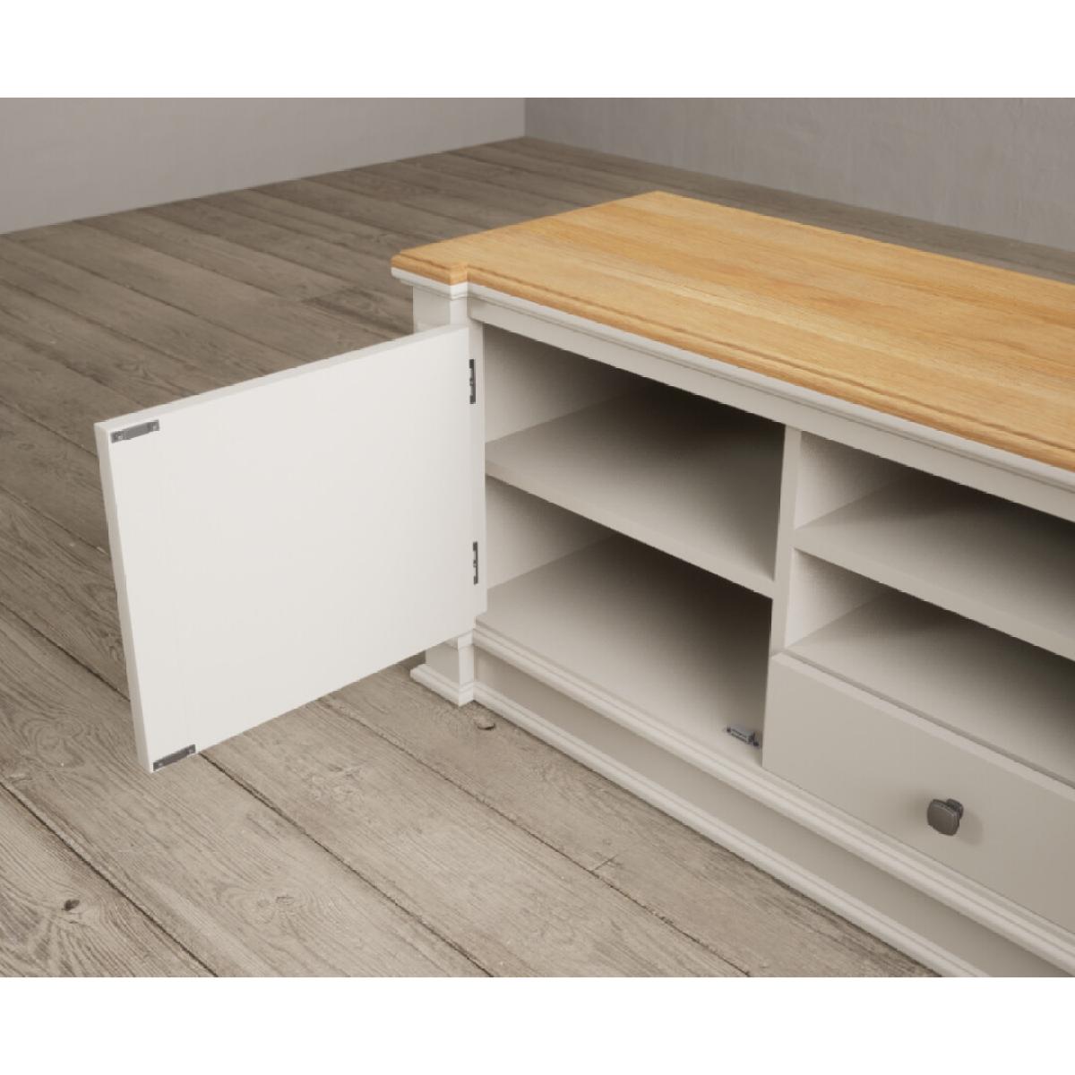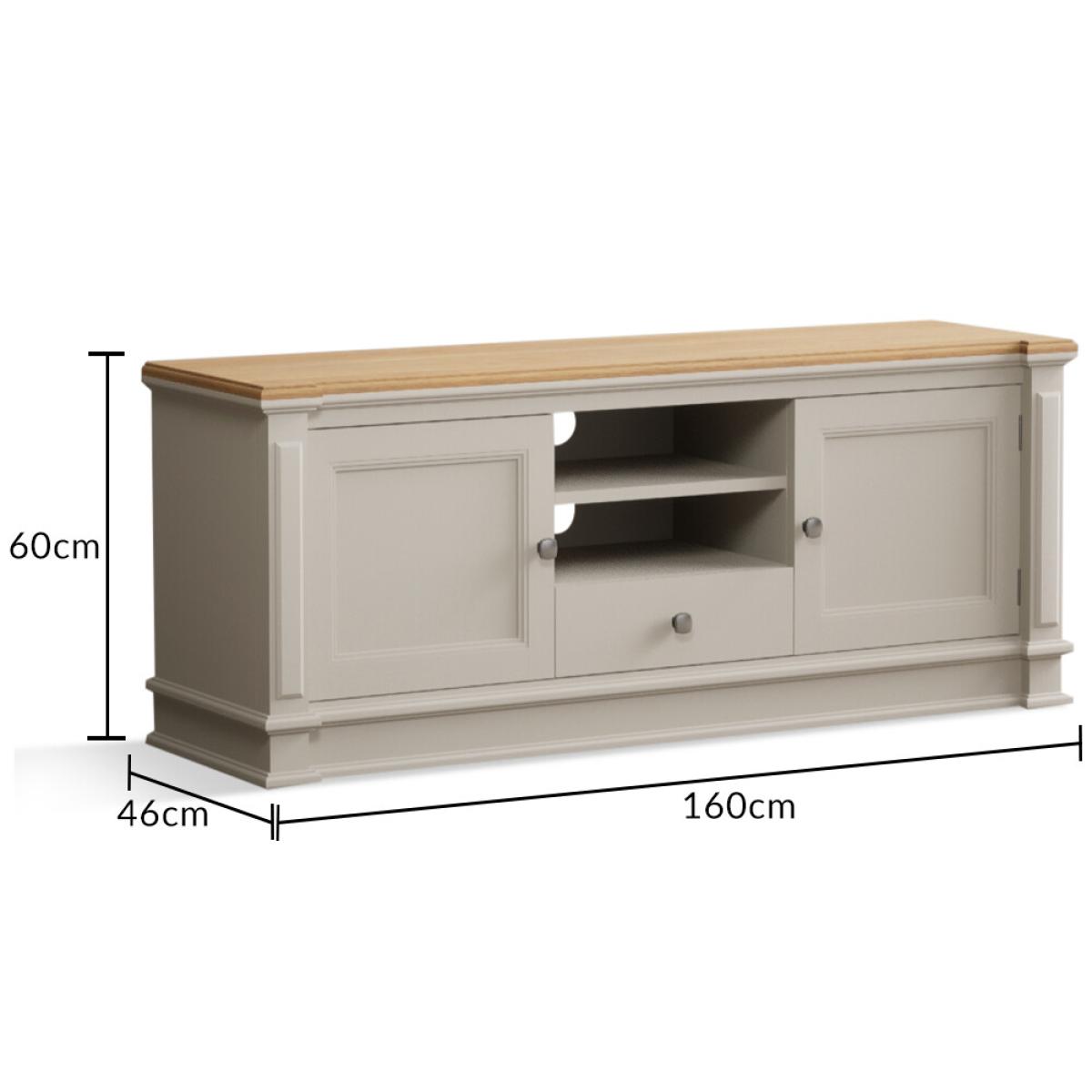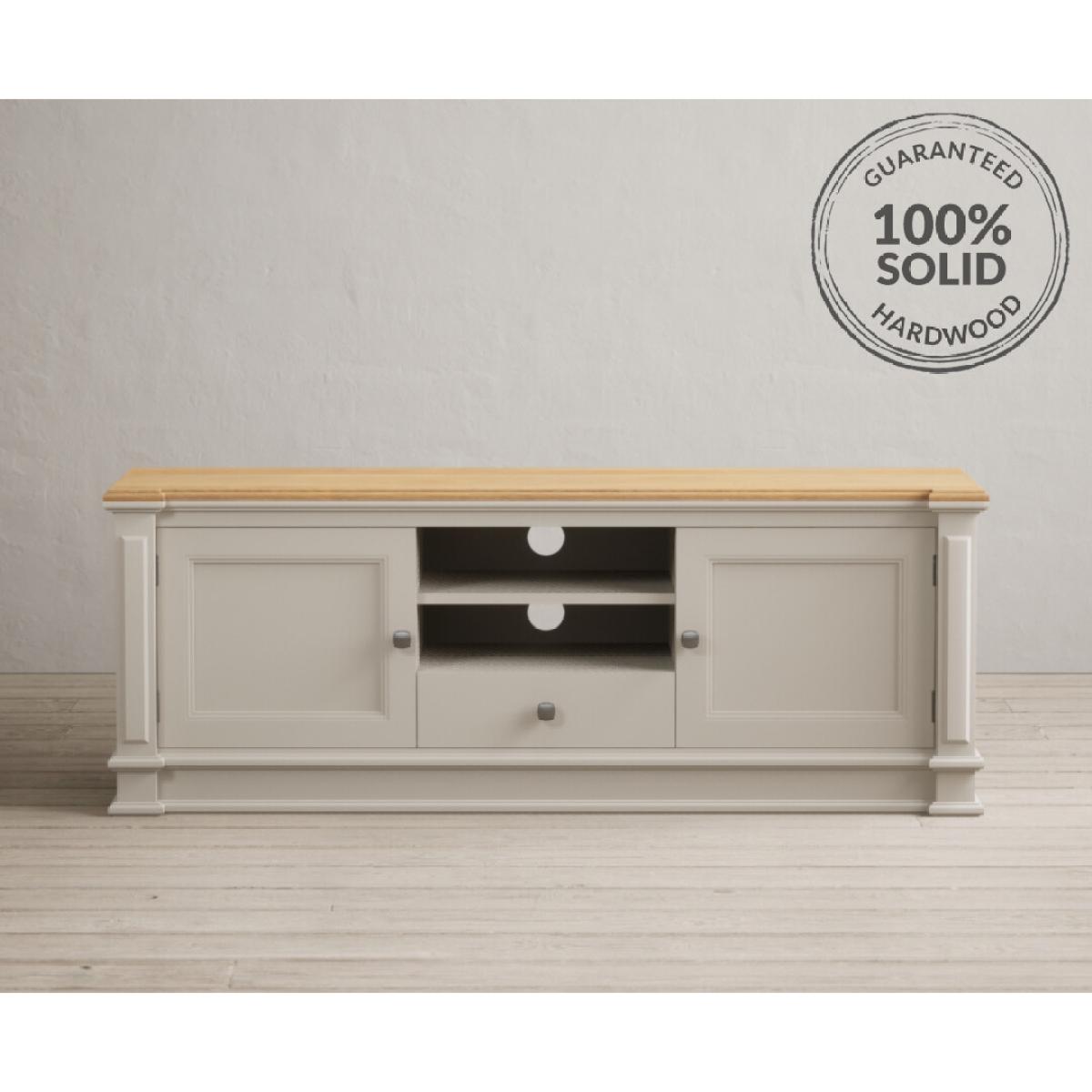 The Lawson Oak and Soft White Super Wide TV Cabinet is crafted from solid hardwood with a soft white painted finish, topped with 100% solid oak and complete with cable management holes, two side cupboards and a drawer.