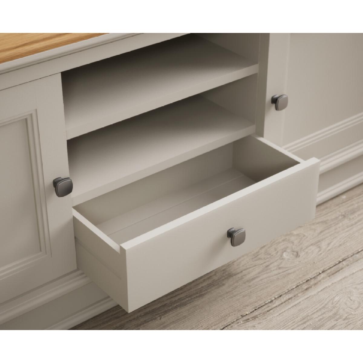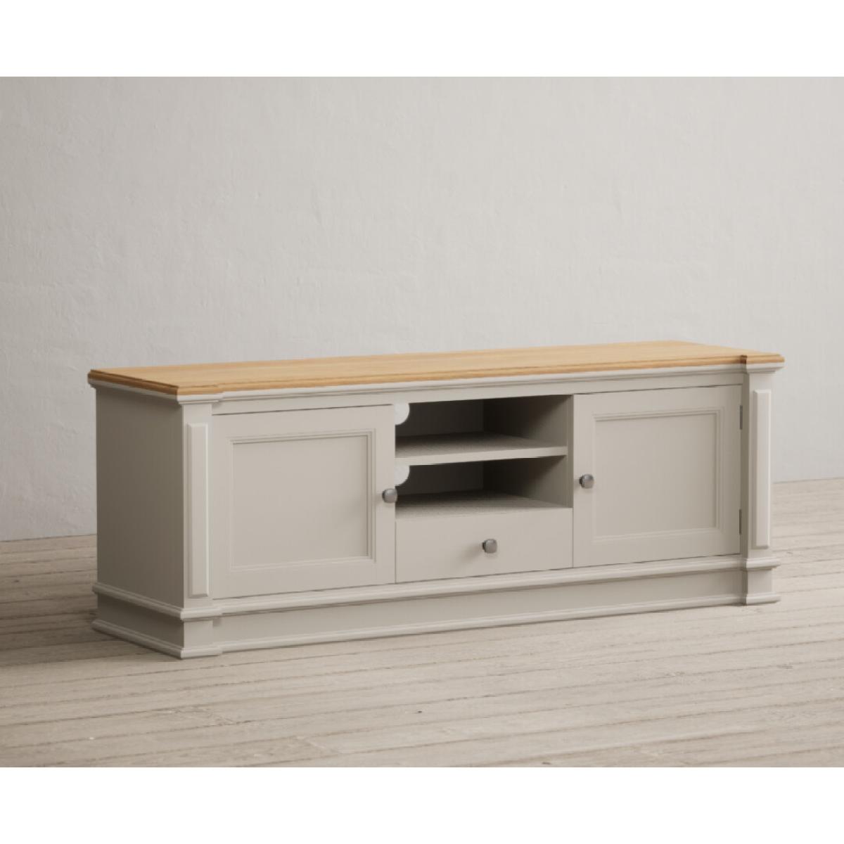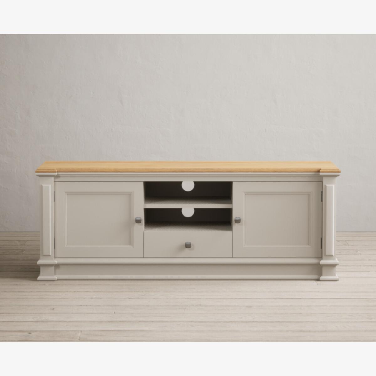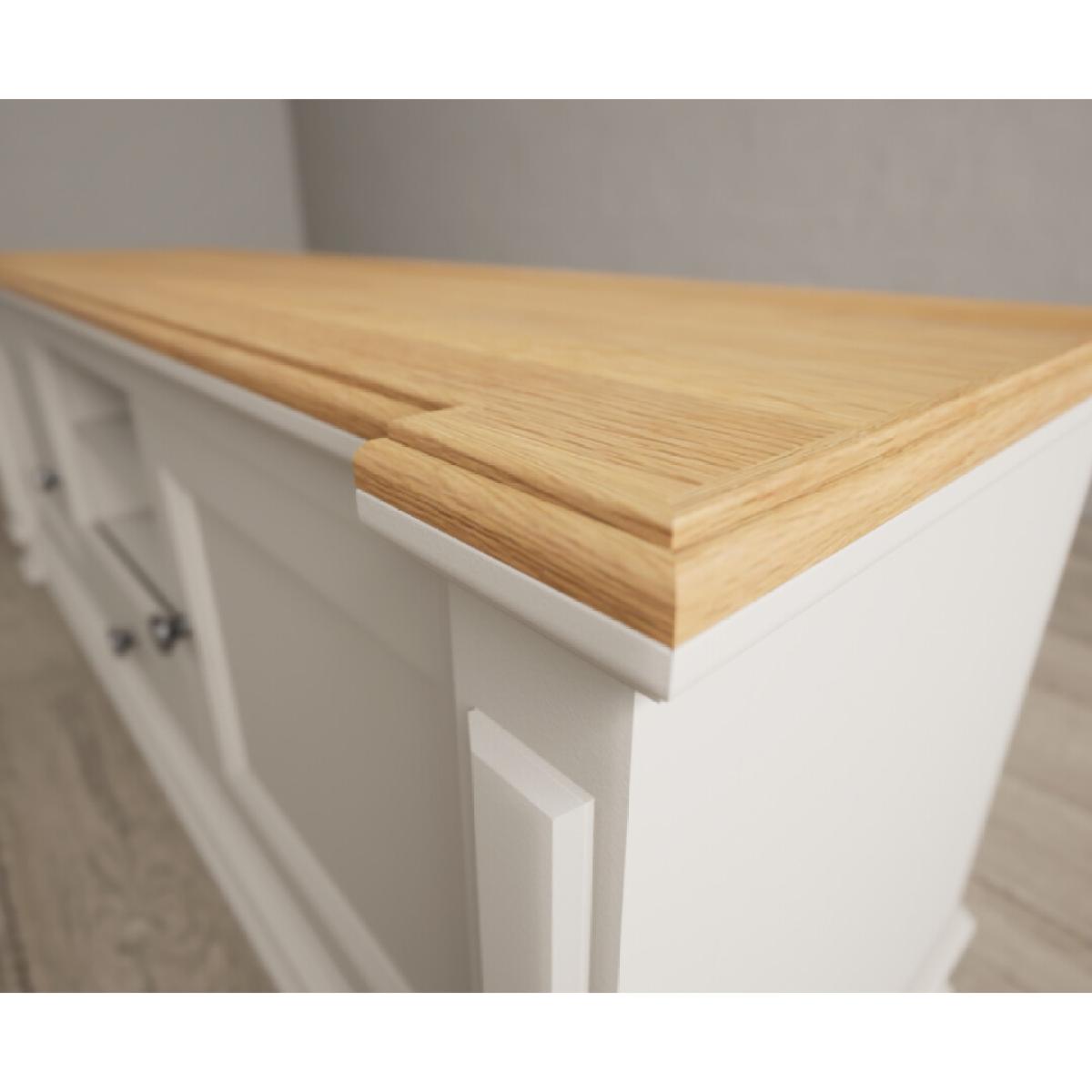 The Lawson Oak and Soft White Super Wide TV Cabinet is crafted from solid hardwood with a soft white painted finish, topped with 100% solid oak and complete with cable management holes, two side cupboards and a drawer.