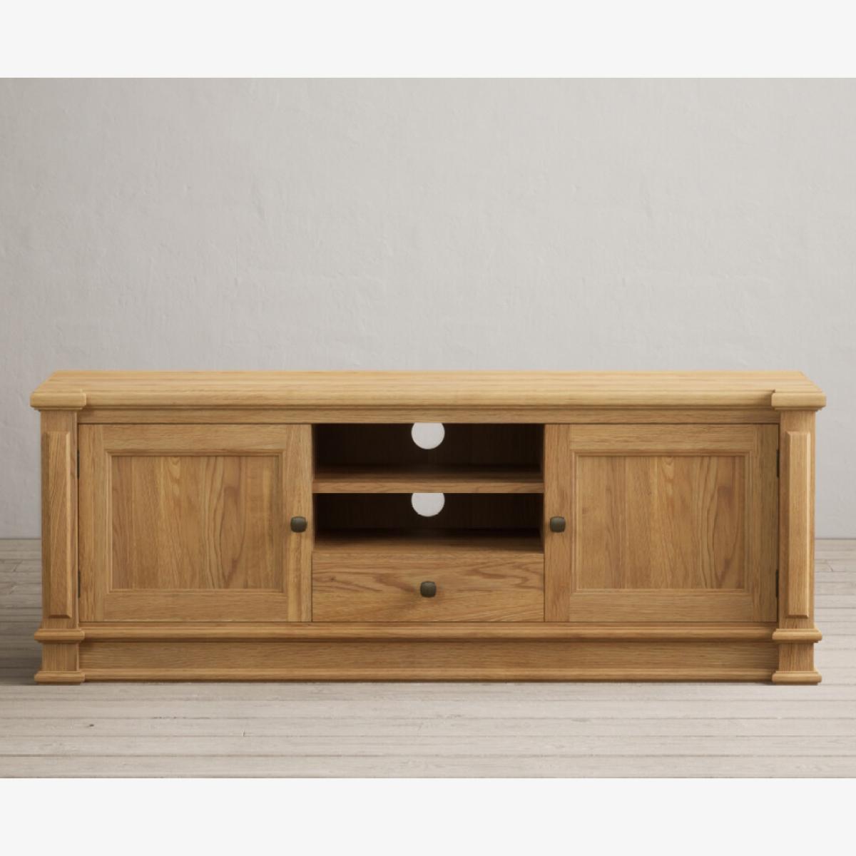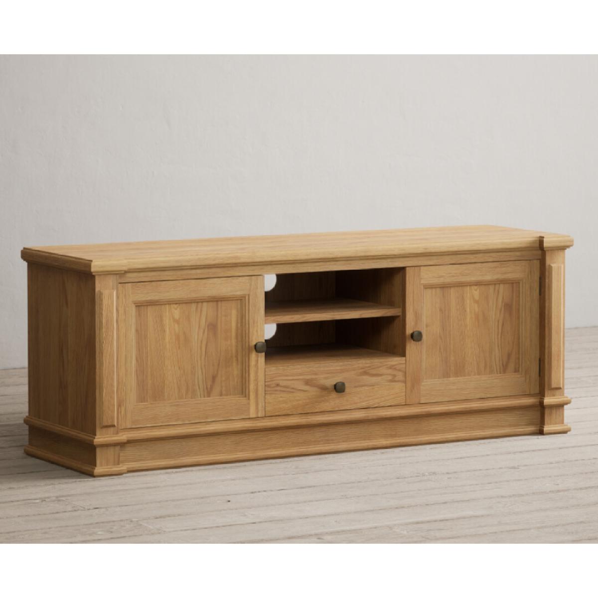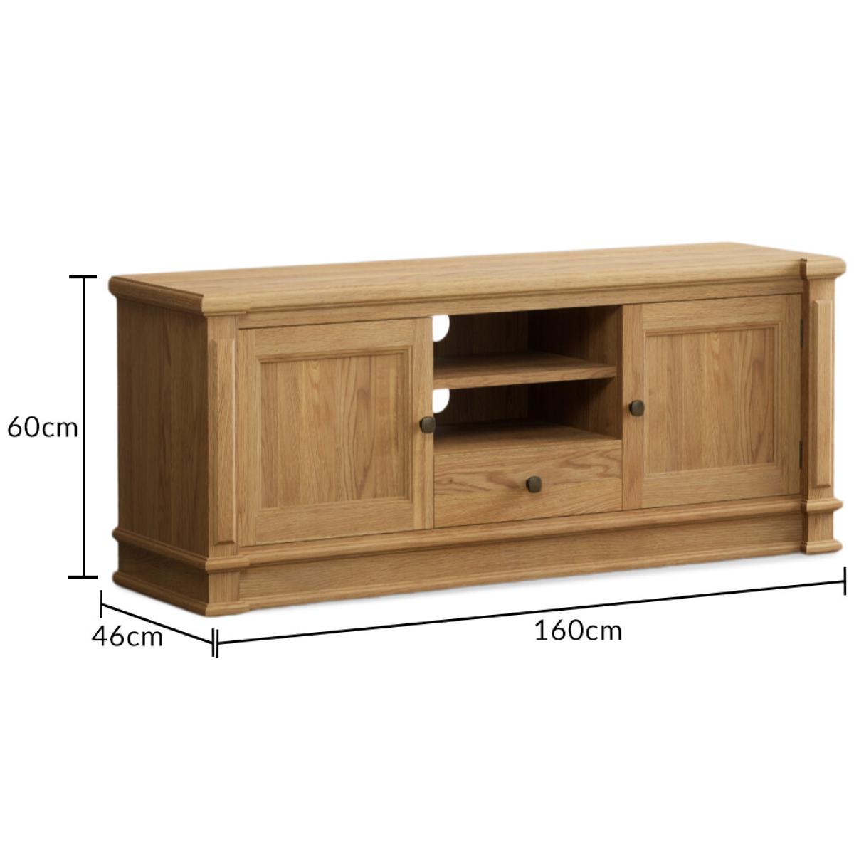 The Lawson Solid Oak Super Wide TV Cabinet is crafted from 100% solid oak and features cable management holes, two side cupboards and a drawer.