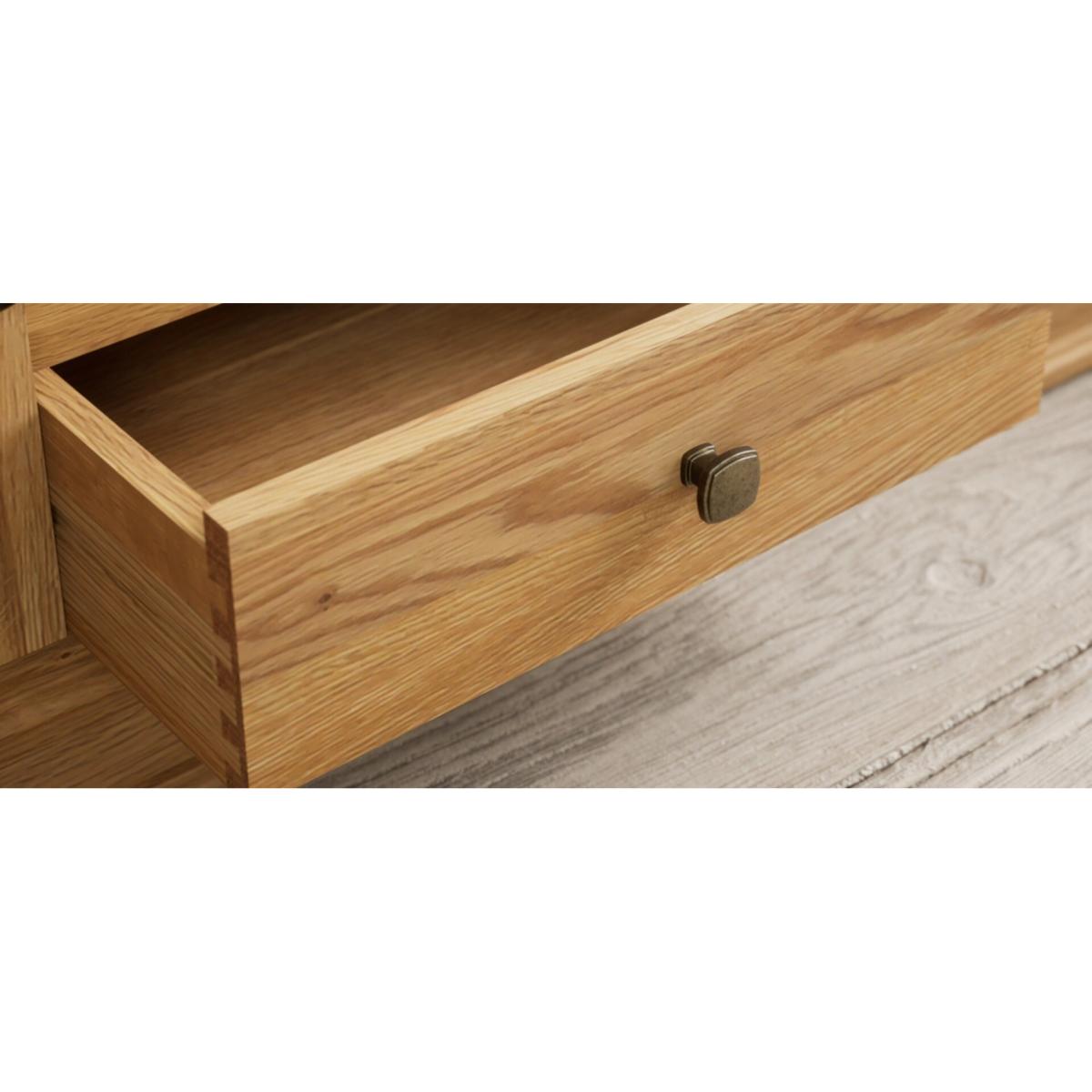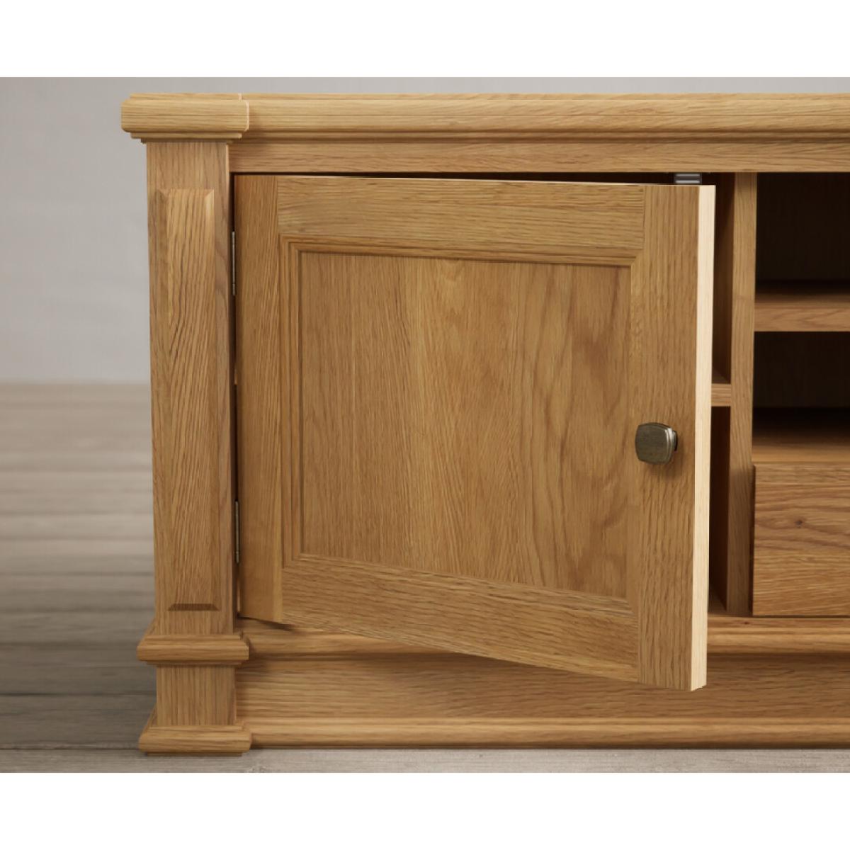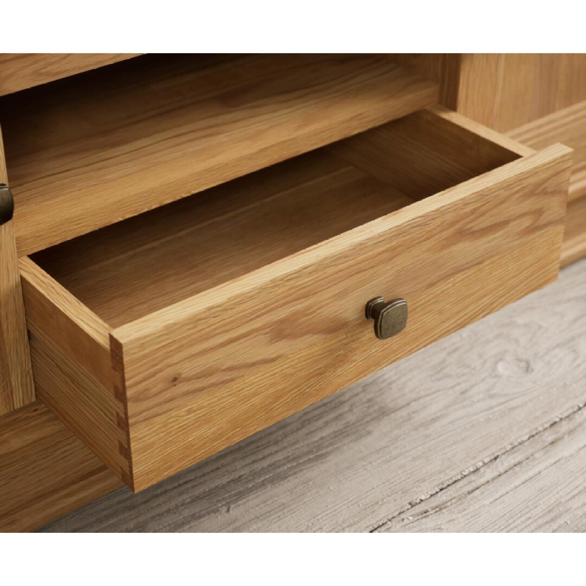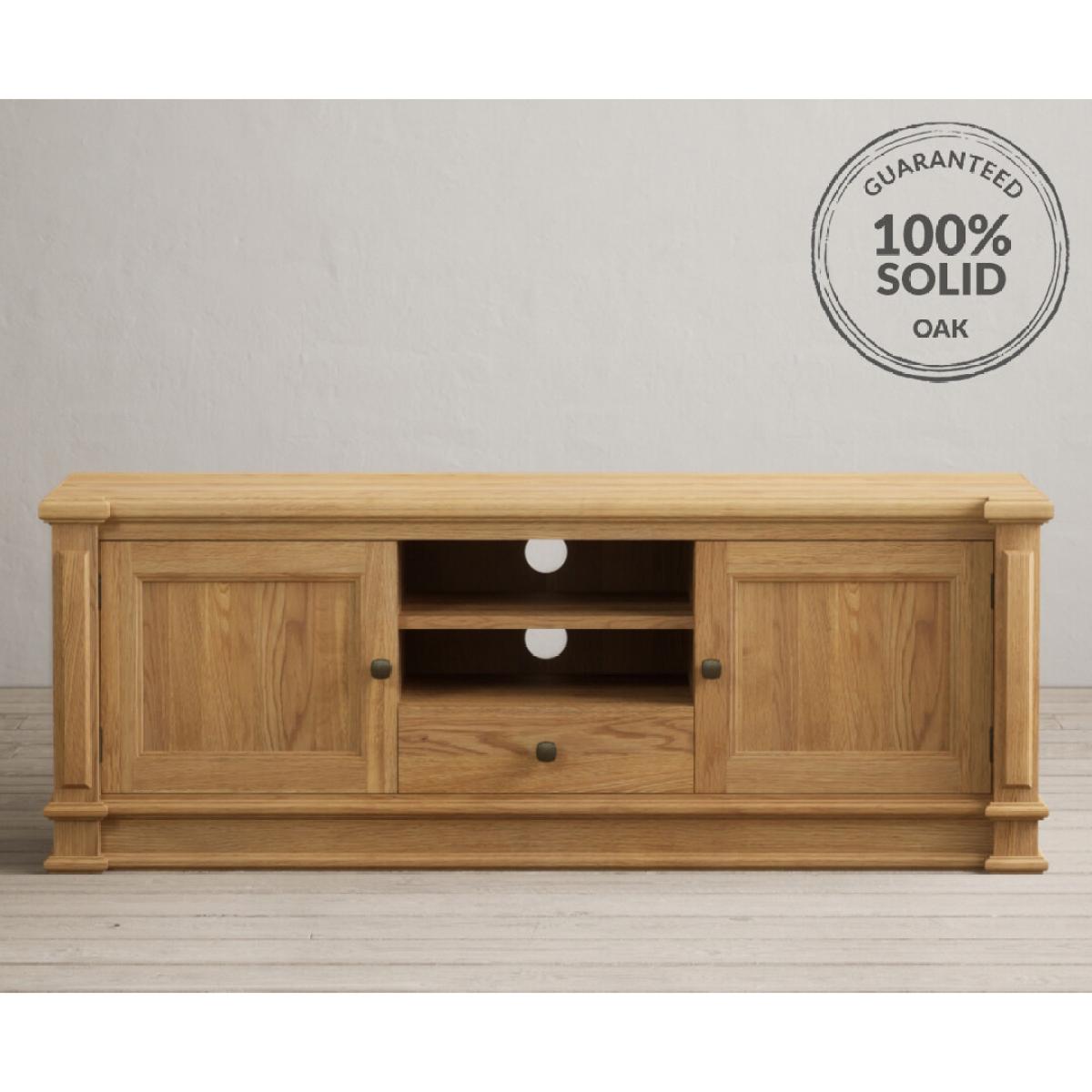 The Lawson Solid Oak Super Wide TV Cabinet is crafted from 100% solid oak and features cable management holes, two side cupboards and a drawer.