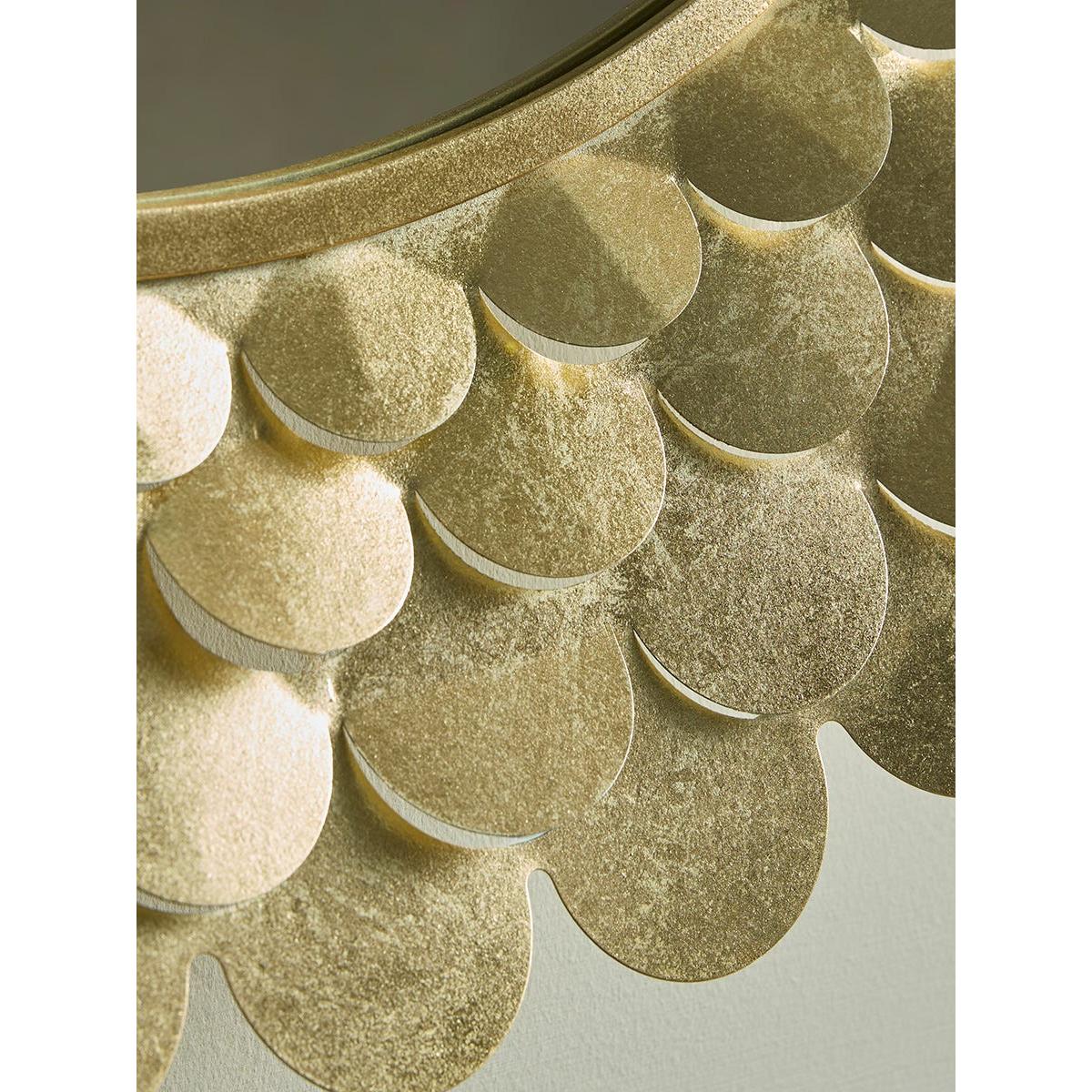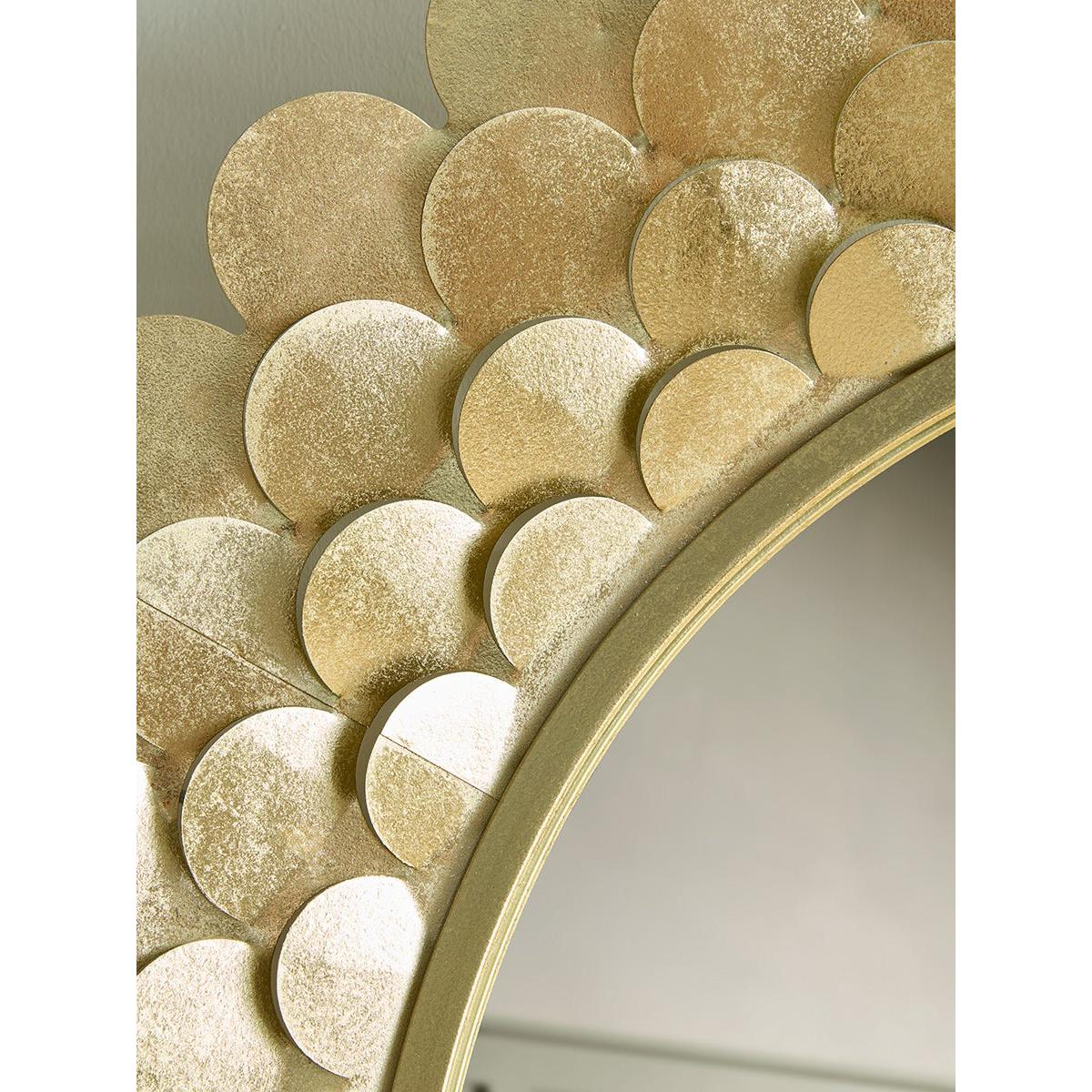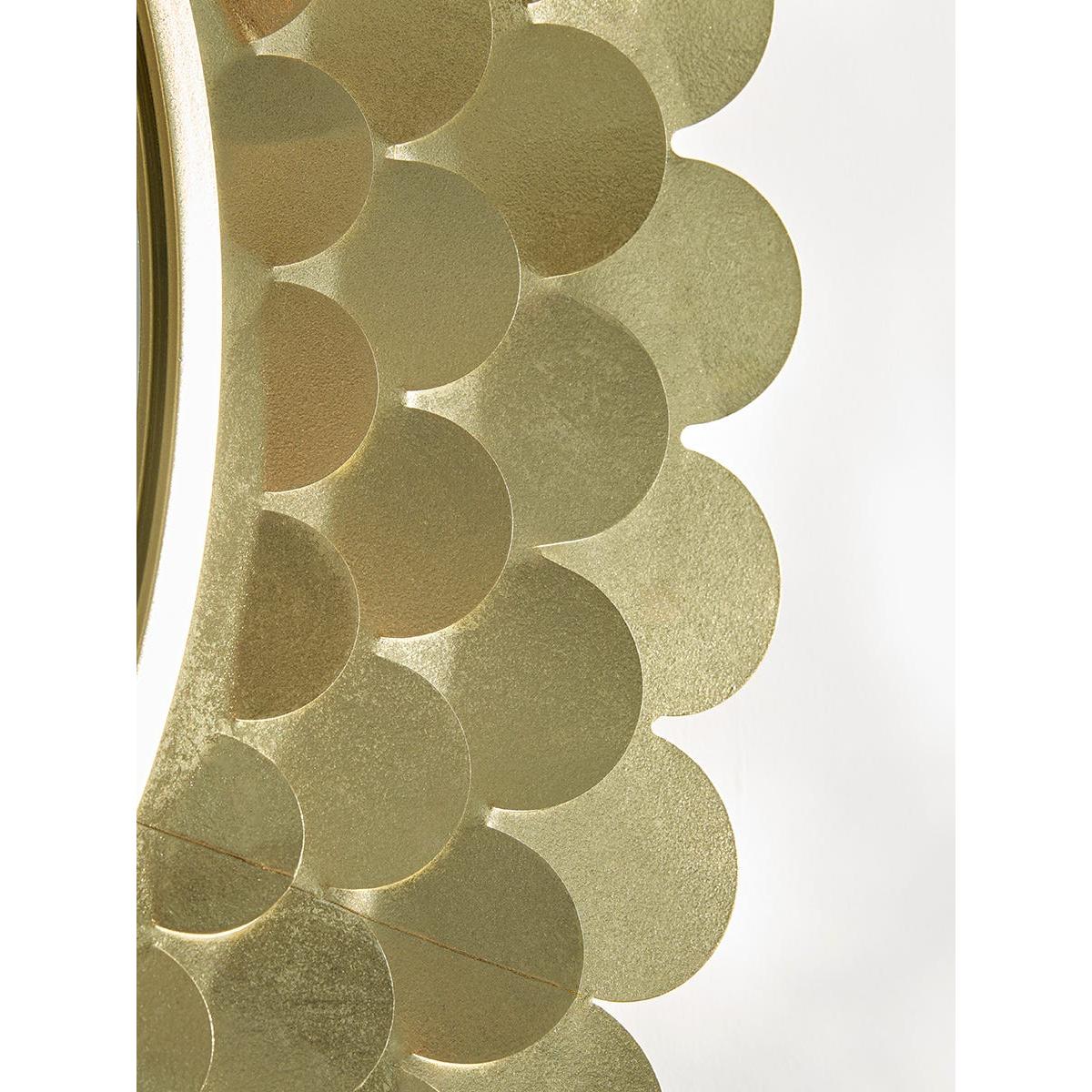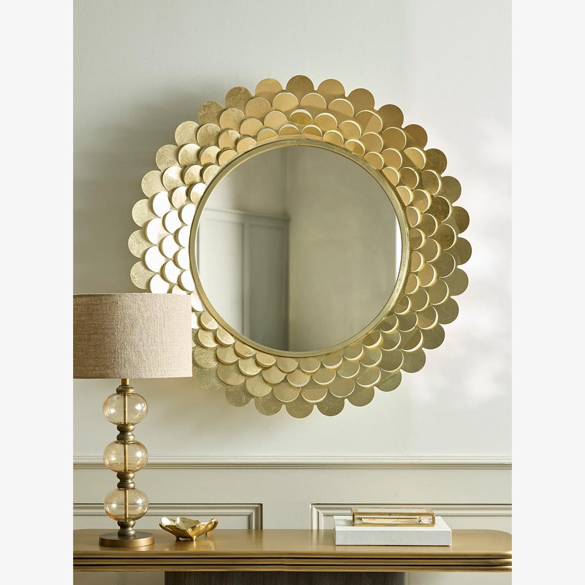 This striking circular mirror, with its bold design, adds a dramatic and elegant touch to any interior. The round glass is encased within a unique frame, resembling a flower with soft gold petals, creating a captivating visual effect. It is an ideal choice for enhancing the space above a fireplace or console table, offering a versatile aesthetic that complements both neutral and darker colour palettes.
