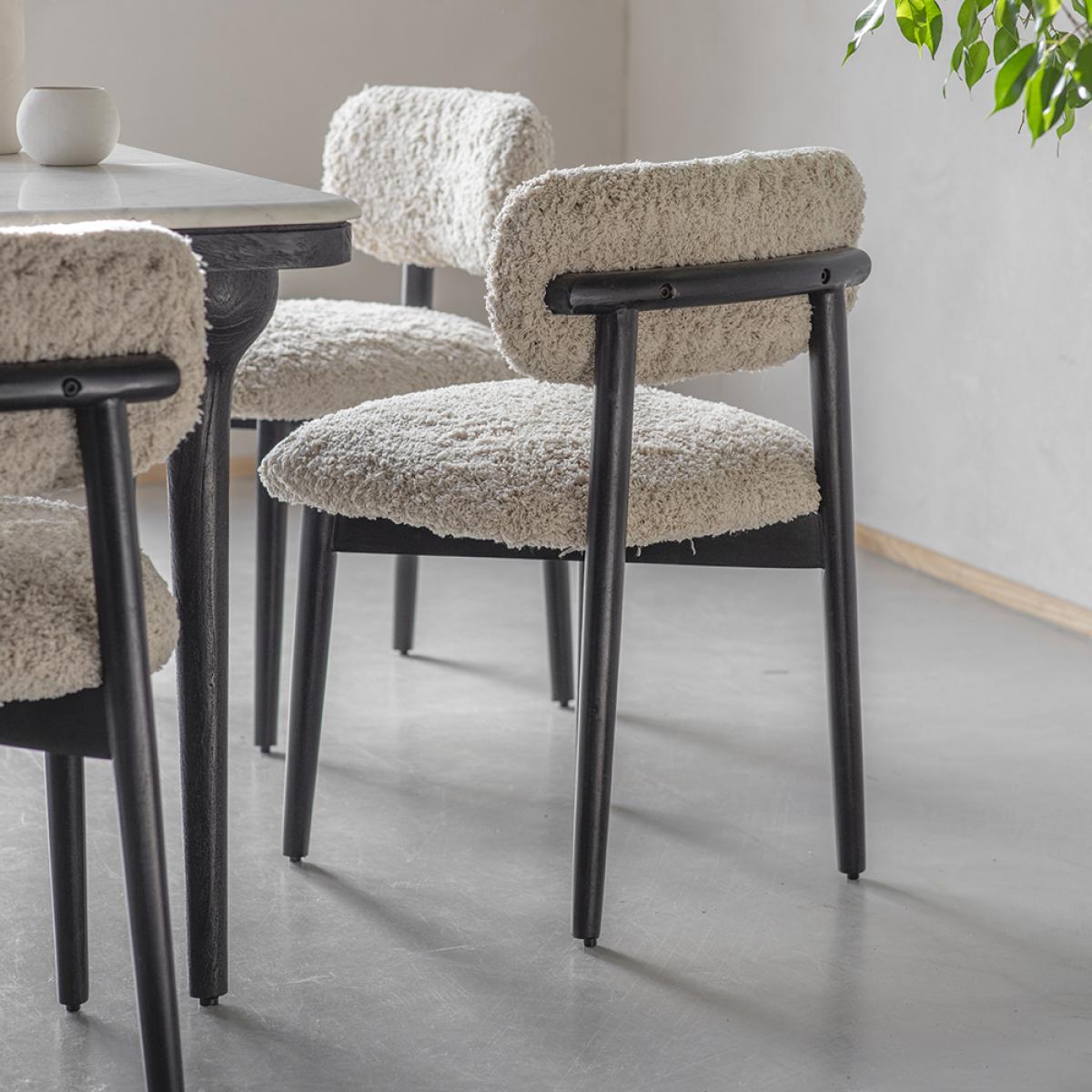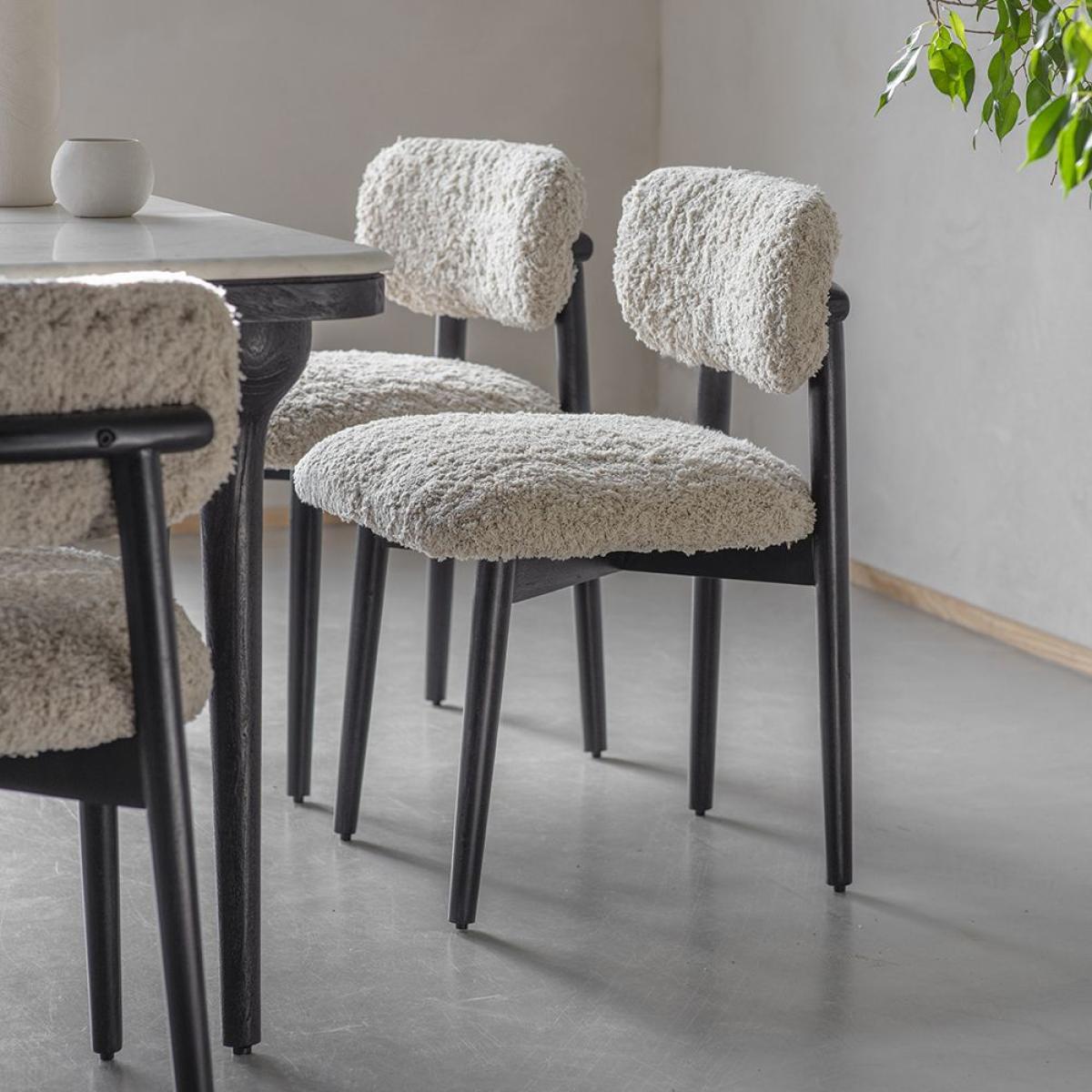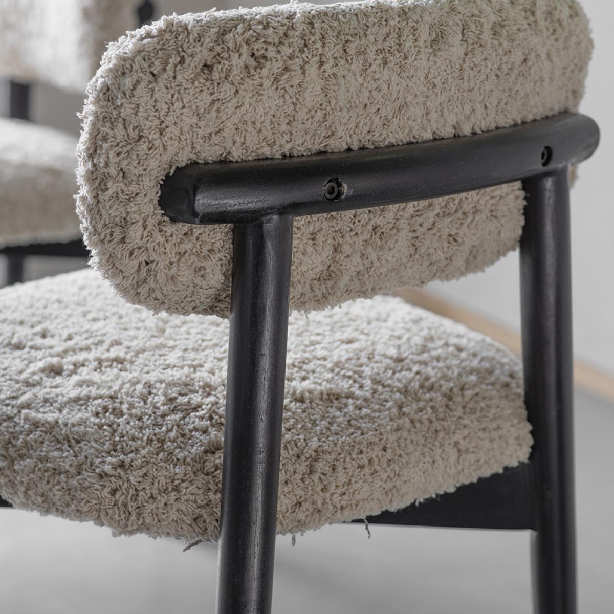 Dine in comfort with our Danish-style Layla Cotton Rug Dining Chair. This design-led rug fabric dining chair combines the neat proportions of its distinctive curved solid wooden backrest with an ultra-comfortable seat pad, both upholstered in luxurious and tactile neutral coloured cotton rug fabric. Strong and sturdy, the legs have a striking black stained finish with an appealing natural wooden grain texture. Feet gliders will protect floors from scuffs, marks and indents. This is a wonderful chic and stylish off white boucle style dining chair perfect, for any modern home with an easy living retro vibe. This monochrome look is super stylish and will give your home the designer feel – whether it’s paired with a black wood and marble dining table, mixed with black wooden benches used as a dressing table chair.