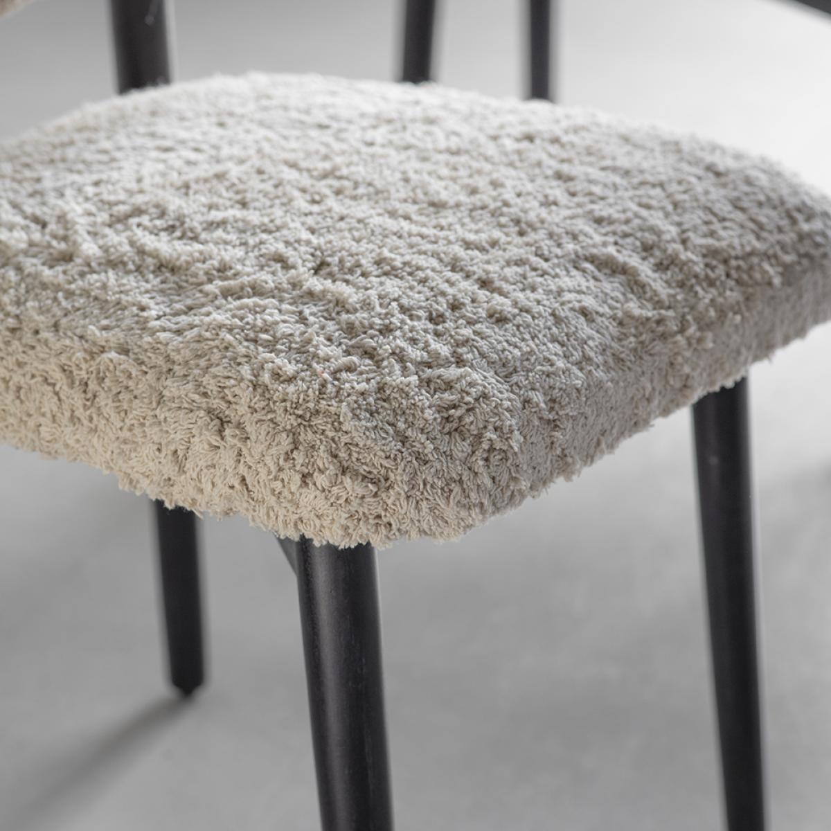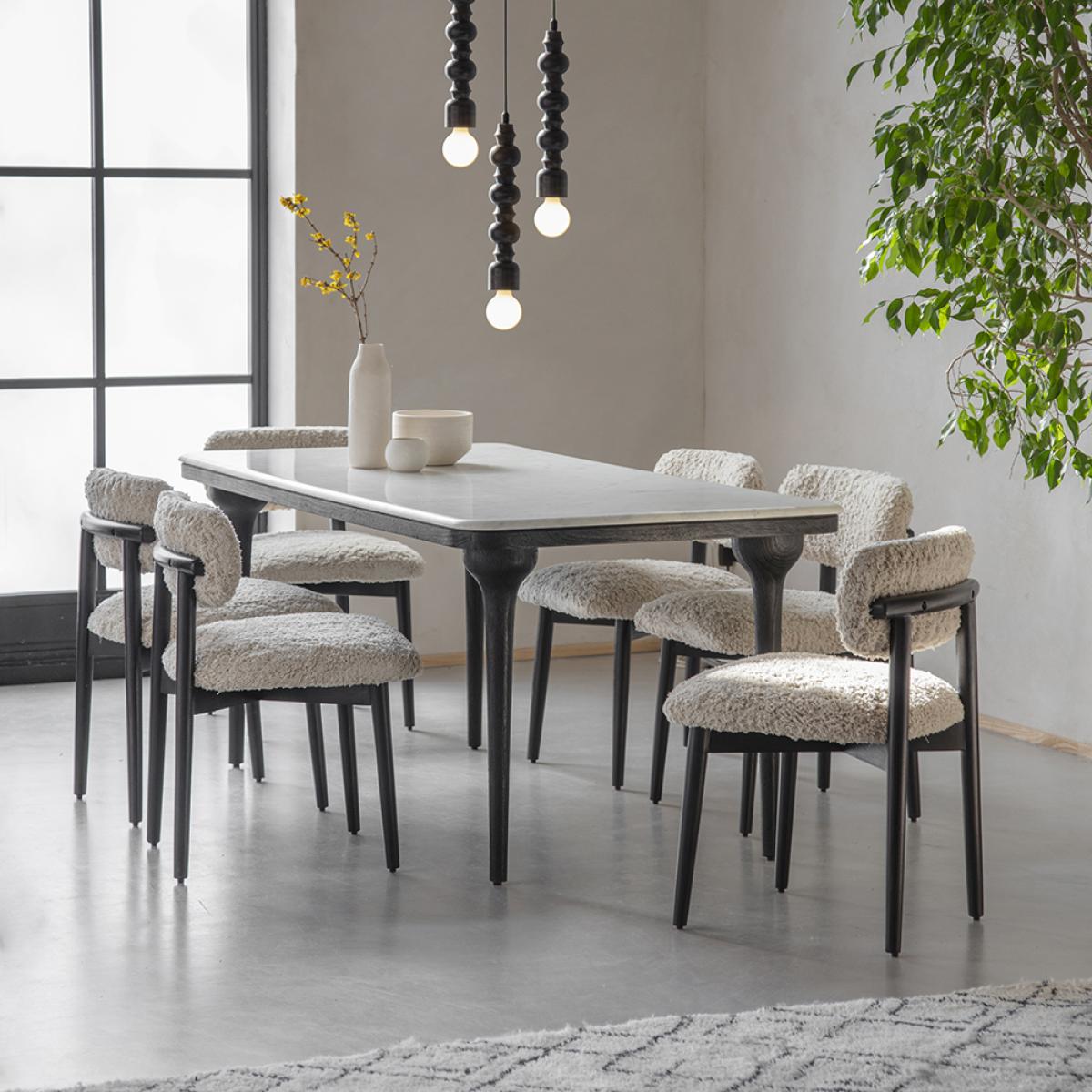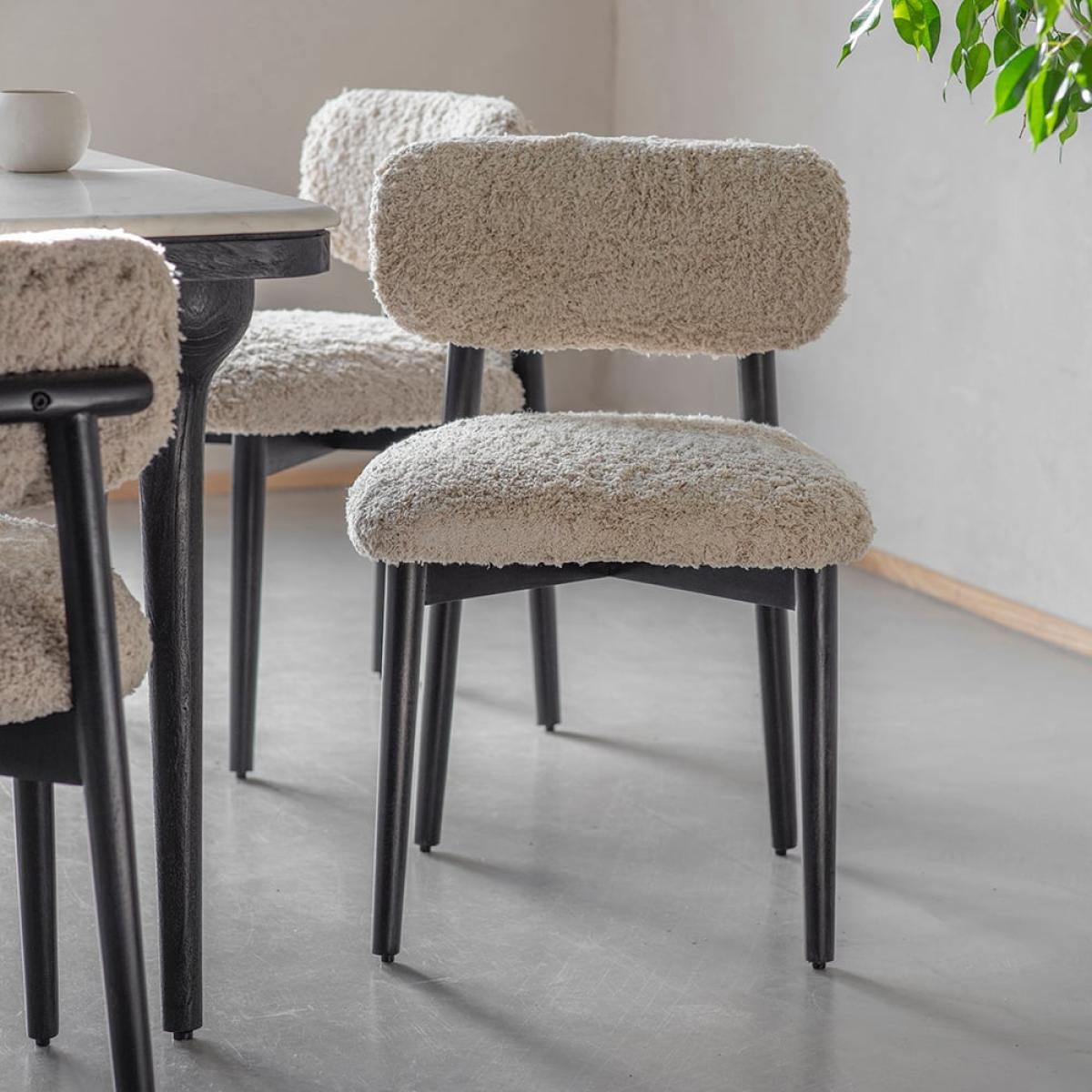 Dine in comfort with our Danish-style Layla Cotton Rug Dining Chair. This design-led rug fabric dining chair combines the neat proportions of its distinctive curved solid wooden backrest with an ultra-comfortable seat pad, both upholstered in luxurious and tactile neutral coloured cotton rug fabric. Strong and sturdy, the legs have a striking black stained finish with an appealing natural wooden grain texture. Feet gliders will protect floors from scuffs, marks and indents. This is a wonderful chic and stylish off white boucle style dining chair perfect, for any modern home with an easy living retro vibe. This monochrome look is super stylish and will give your home the designer feel – whether it’s paired with a black wood and marble dining table, mixed with black wooden benches used as a dressing table chair.