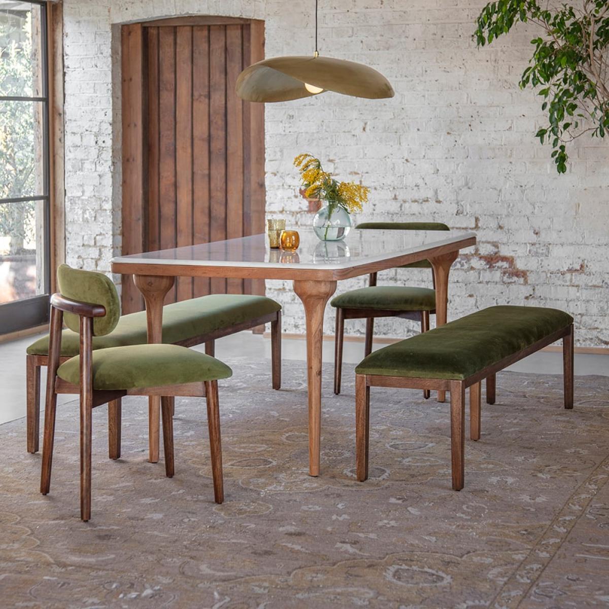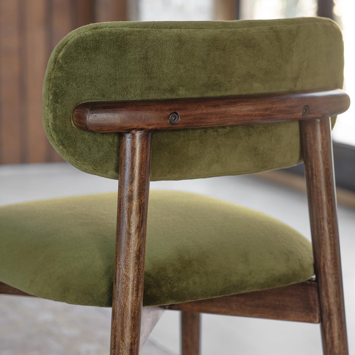 Dine in comfort with our Danish-style Layla Velvet Dining Chair in Deep Green. This design-led contemporary rich green velvet dining chair combines the neat proportions of its distinctive curved solid wooden backrest with an ultra-comfortable seat pad, both upholstered in luxurious cotton velvet. Strong and sturdy, the solid wood legs have a rich vintage stained finish with an appealing natural wooden grain texture. Feet gliders will protect floors from scuffs, marks and indents. This is a wonderful chic and stylish green velvet dining chair perfect for any modern home with an easy living retro vibe. The green colour is on trend, and offers a more contemporary alternative to grey as a colour that complements most room schemes, from light and bright rooms to darker moodier rooms. Pair with any of our dining table designs to create your own unique look for your kitchen or dining room.
