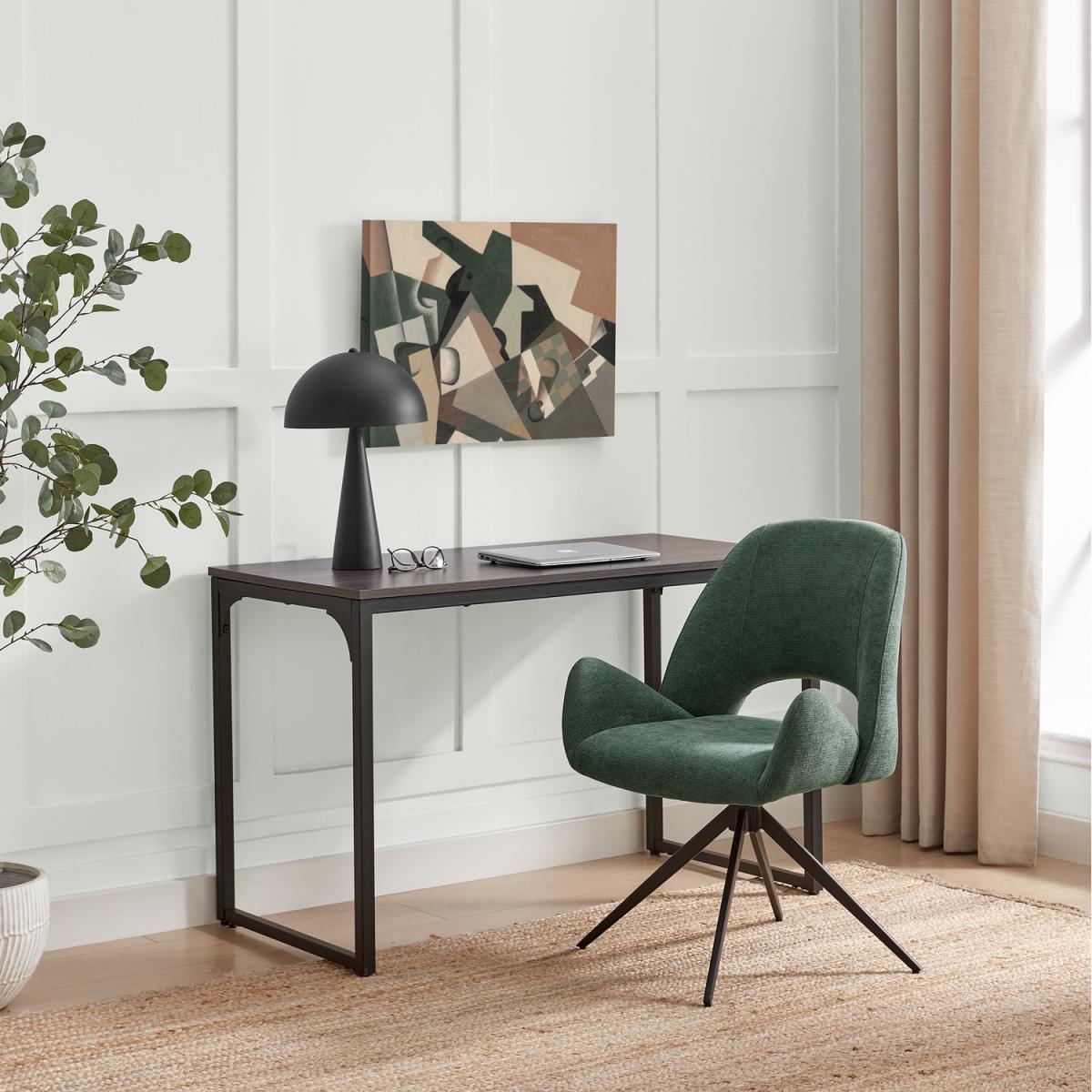 Our Layla fabric swivel chair with black legs can be used in a number of spaces throughout your home. A stunning dining chair, or perfect for your office, as an accent chair in your bedroom or for your dressing table vanity space - we love a versatile fabric seating option! Swivel chairs are great for narrower spaces as you don't need to push them back from a table to stand up. A curvy chair, featuring a rounded back and cut out hole to the lumbar area (which adds a bit of mid century modern flair but is also designed to alleviate pressure to your lower back while sitting) and gently sloping wings which rise from the chair seat to form arms that will hug you. Upholstered in a gorgeous polyester with a textured weave that is both soft and durable. A sleek design with vintage nods that will great in a range of homes. Sat on tapered black metal legs that attach to a sturdy swivel plate on the underside of the chair and ergonomically designed to support you while you sit. Our Layla green fabric swivel chair with black legs can be used in a number of spaces throughout your home. A stunning dining chair, or perfect for your office, as an accent chair in your bedroom or for your dressing table vanity space - we love a versatile fabric seating option! Swivel chairs are great for narrower spaces as you don't need to push them back from a table to stand up. A curvy chair, featuring a rounded back and cut out hole to the lumbar area (which adds a bit of mid century modern flair but is also designed to alleviate pressure to your lower back while sitting) and gently sloping wings which rise from the chair seat to form arms that will hug you. Upholstered in a gorgeous green polyester with a textured weave that is both soft and durable. A sleek design with vintage nods that will great in a range of homes. Sat on tapered black metal legs that attach to a sturdy swivel plate on the underside of the chair and ergonomically designed to support you while you sit.