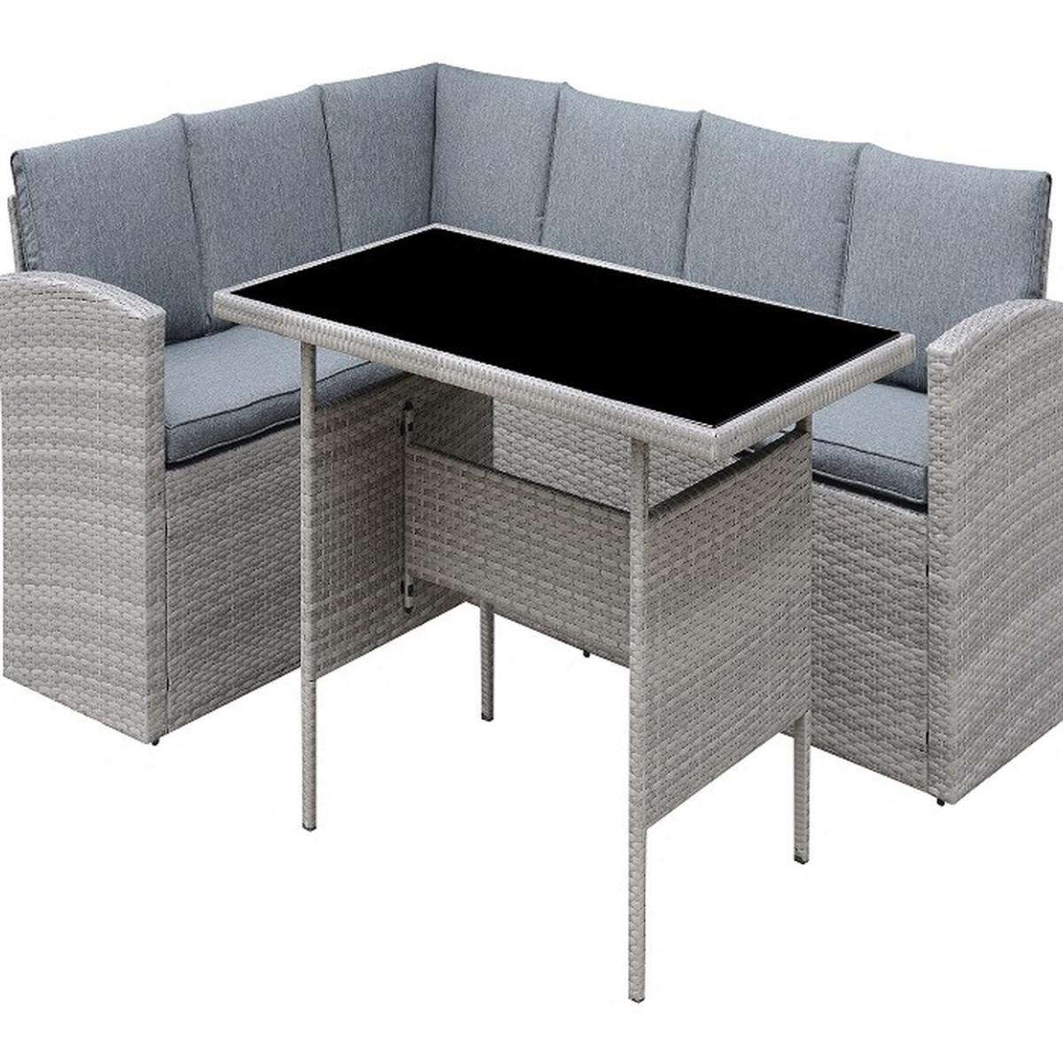 Introducing Layton, a 3 piece grey rattan corner sofa dining set consisting of 2 x Sofa pieces which come together to form L-Shape, and one black glass topped dining table, including grey seat and backrest cushions. More and more of us are spending our summer holidays in the garden, maximising our personal space and saving money on pricey international travel! Any modern home can benefit from our collection of brown patio furniture, which features a chic wicker style made of PE rattan. Escape to your private refuge in your garden or patio to extend the length of the summer. Enjoy the bright weather while sitting with up to 5 family members and friends. This set does not come with a cover - we recommend you purchase a waterproof cover to preserve your garden set when not in use. This garden set is durable and for outdoor use all year round in mild to warm weather. Although the cushions are weather-proof, we do not advise leaving them out in adverse weather conditions for long periods of time. We recommend the whole set be moved indoor over the winter. Each seating part is an individual module, the set is made up by putting the modules together. They DO NOT clip together but instead sit next to each other to make the corner unit.