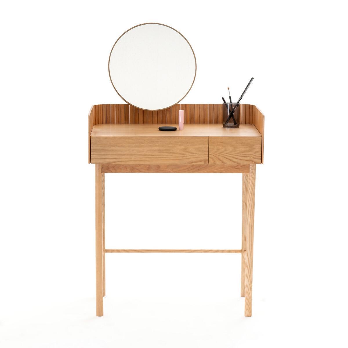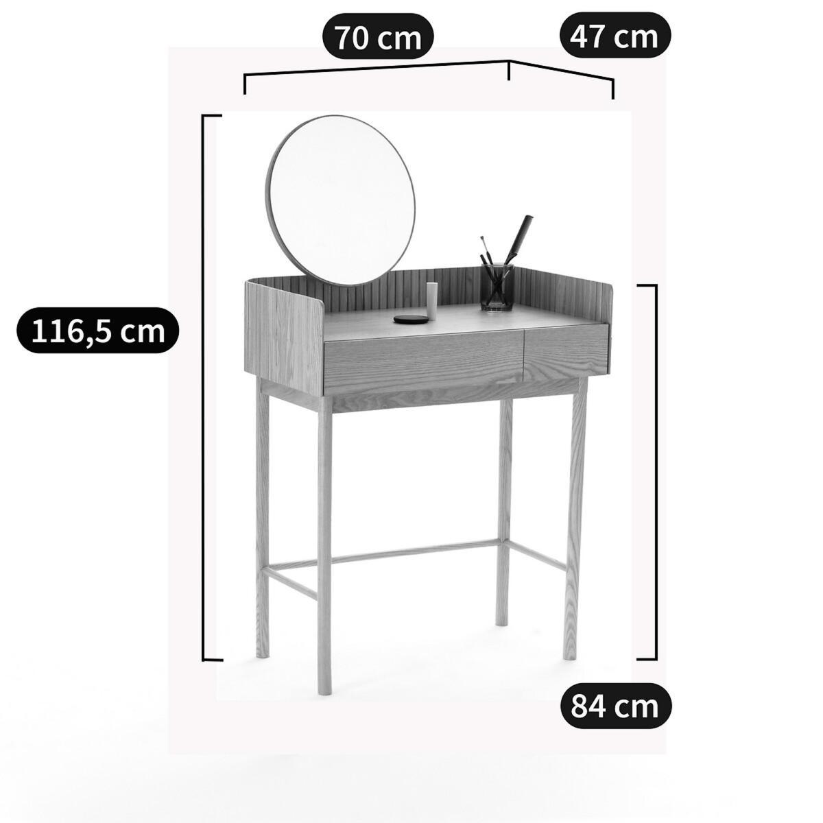 In blonde wood, this petite dresser has a retro feel and offers plenty of storage space thanks to its 2 drawers. Product Details. 2 Drawers. In solid ash and ash veneered MDF, NC varnish finish. Solid birch veneered ash legs, NC varnish finishDimensions. Overall. Width : 70cm. Height : 84 cm (without mirror) / 116.5 cm (with mirror). Depth : 47cm. Weight: 18.5 kgs. Mirror. Diameter: 38cm. Tabletop:. Width : 68.4cm. Height : 75.5cm. Depth : 40.3cm. Interior Dimensions. Large Drawer: L40.8 x D27 x H4.7 cm. Small Drawer: L14.7 x D27 x H4.7 cm. Home delivery:This dressing table is sold pre-assembled. It will be delivered to your home by appointment, even upstairs. Note! Please check that all access points are large enough to accommodate your delivery (doors, stairs, lifts).Dimensions and weight of package:. L82 x H52 x D37.5 cm. 21.5 kg.
