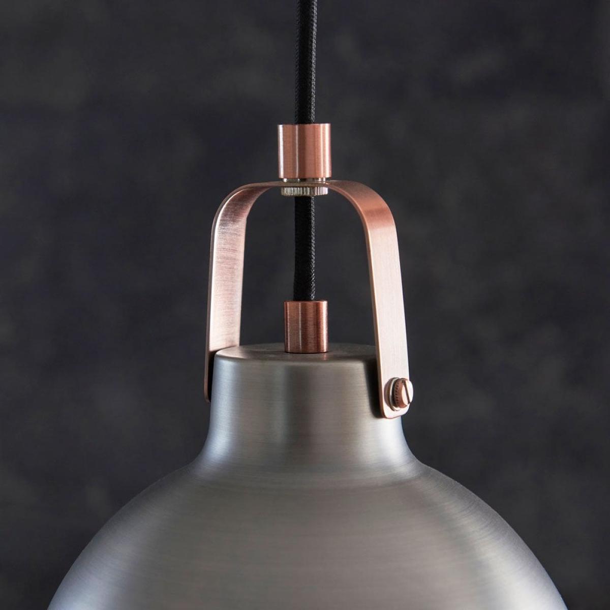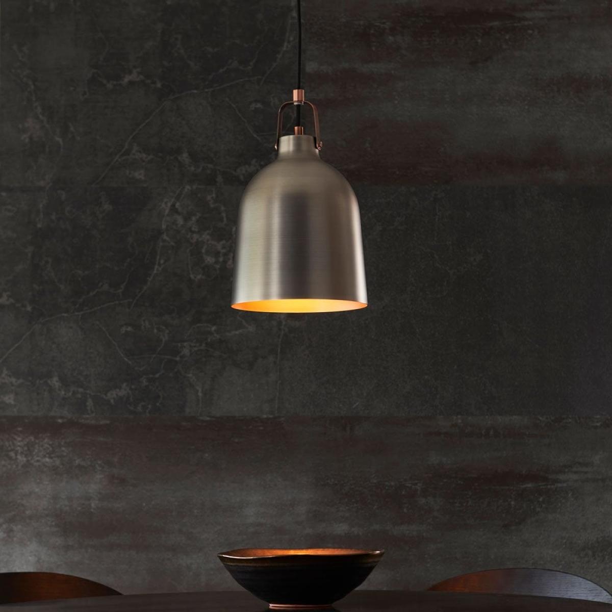 Bustling modern restaurants call upon industrial designs for their low maintanence and highend style. You can do the same with the Lazenby Pendant Light! For design-led resto style, the smooth unfussy dome shade has a matte black finish with aged pewter on the inside for a golden glow, finished with copper plated details. A modern living look, choose to display in a group of three or four across your kitchen counter.