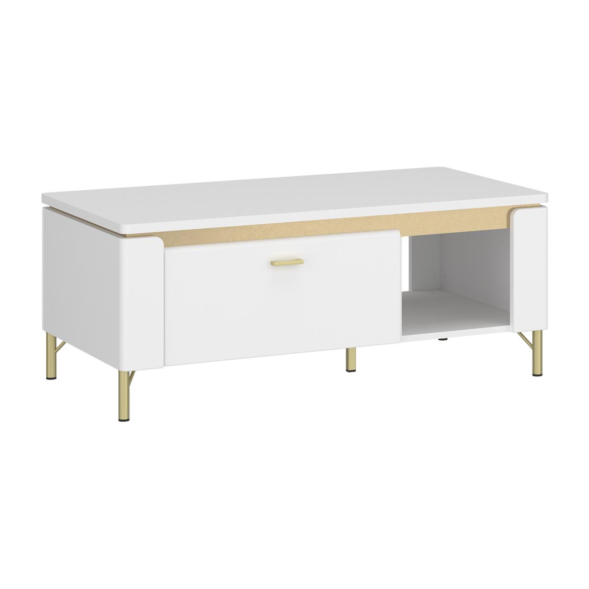 Elevate your decor with this Lazio Coffee Table. Designed with practicality and style in mind, the stunning coffee table flaunts a crisp white exterior with gold accents to enhance any space and a spacious drawer to meet your organising needs. Ideal for living rooms, the spacious top offers ample space for decorative ornaments, entertaining guests and placing your TV remote. Sturdy and stable, the coffee table is not just about style; the solid MDF and laminated chipboard construction offers durability. Part of the Lazio collection, you can pair it with other matching furniture items to create a standout interior.