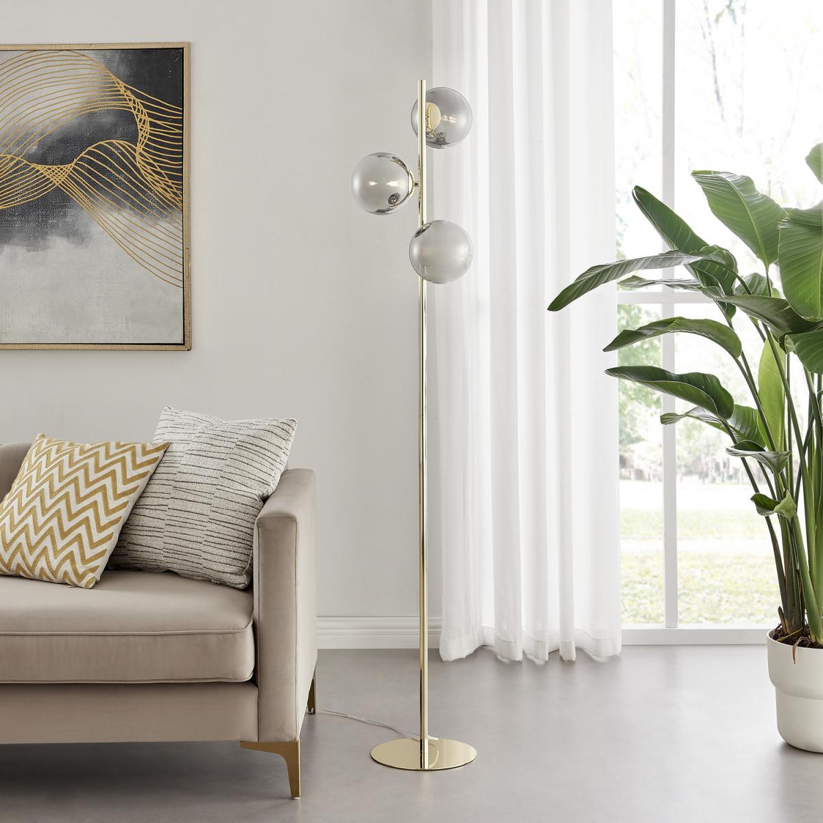 Our Lazio tree floor lamp with gold brass stand and 3 smoked glass globe lamp shades is a modern standing lamp that'll add some glam lighting to your bedroom, living room or even office! The Lazio is a simple design with nods to more retro vintage lighting styles - those smoked glass globe shades have a bit of 1920s Art Deco flair and will diffuse the light nicely. The Lazio will look stunning in a range of home styles, from maximalist to minimalist, glam to industrial. With a clear cable and foot-button switch. Check out our full lighting range for more ideas. Requires 3x 20W G9 bulbs (not included).