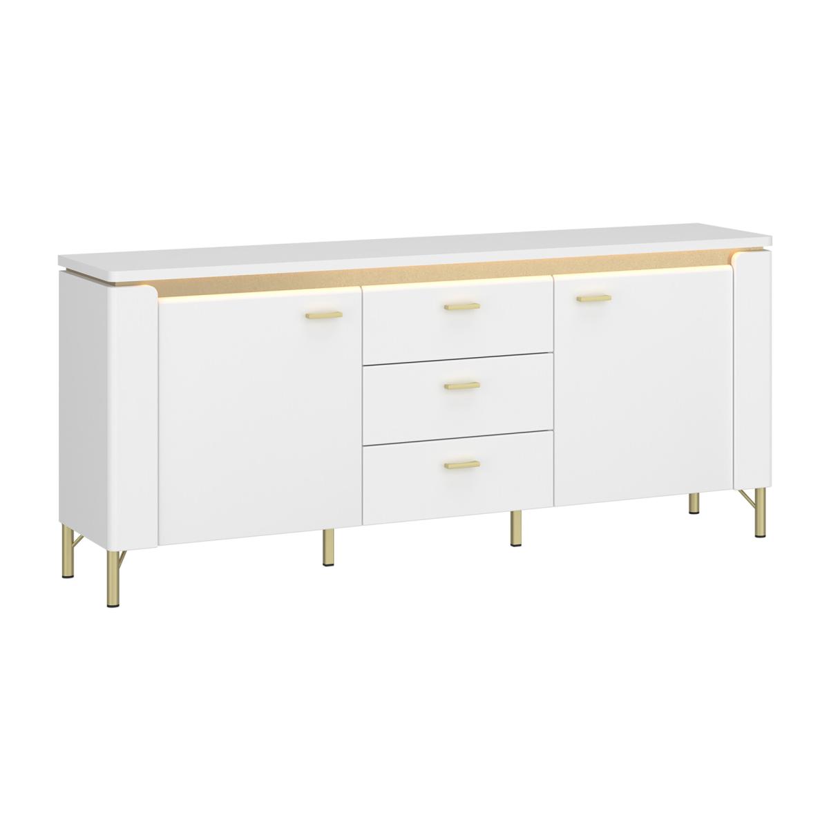 Transform your living space with the Lazio TV Cabinet, a stunning blend of style and functionality. Finished in an elegant Alpine White and Gloss White, this modern cabinet adds a touch of luxury to any room. With its two stylish doors and spacious drawers, there's ample storage for your media devices and accessories. The LED lighting illuminates your items beautifully, creating an inviting atmosphere for movie nights or gatherings with friends. Crafted from durable MDF and laminated chipboard, the unit boasts a sleek design enhanced by gold accents and sturdy high metal legs for added sophistication. Enjoy the convenience of soft-close doors and a spacious drawer equipped with ball-bearing guides for smooth operation.