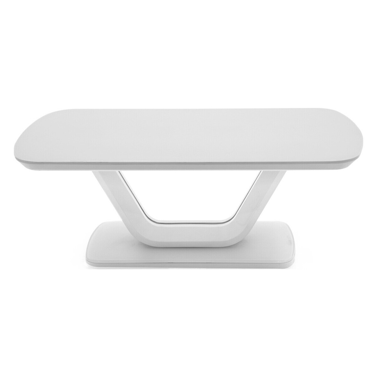 The Lazzaro Coffee Table is an immaculate and eye-catching addition to any home. Its beautiful and modern design is perfectly finished in a glossy white lacquer which helps enhances its already contemporary look. The rounded edges and v-shaped legs help to create its unique, which brings fun and modern style to any living space. Immaculate white gloss finish. Rounded edges to the base and tabletop. Sturdy MDF construction is robust and durable. Teams perfectly with the wider Lazzaro Collection.
