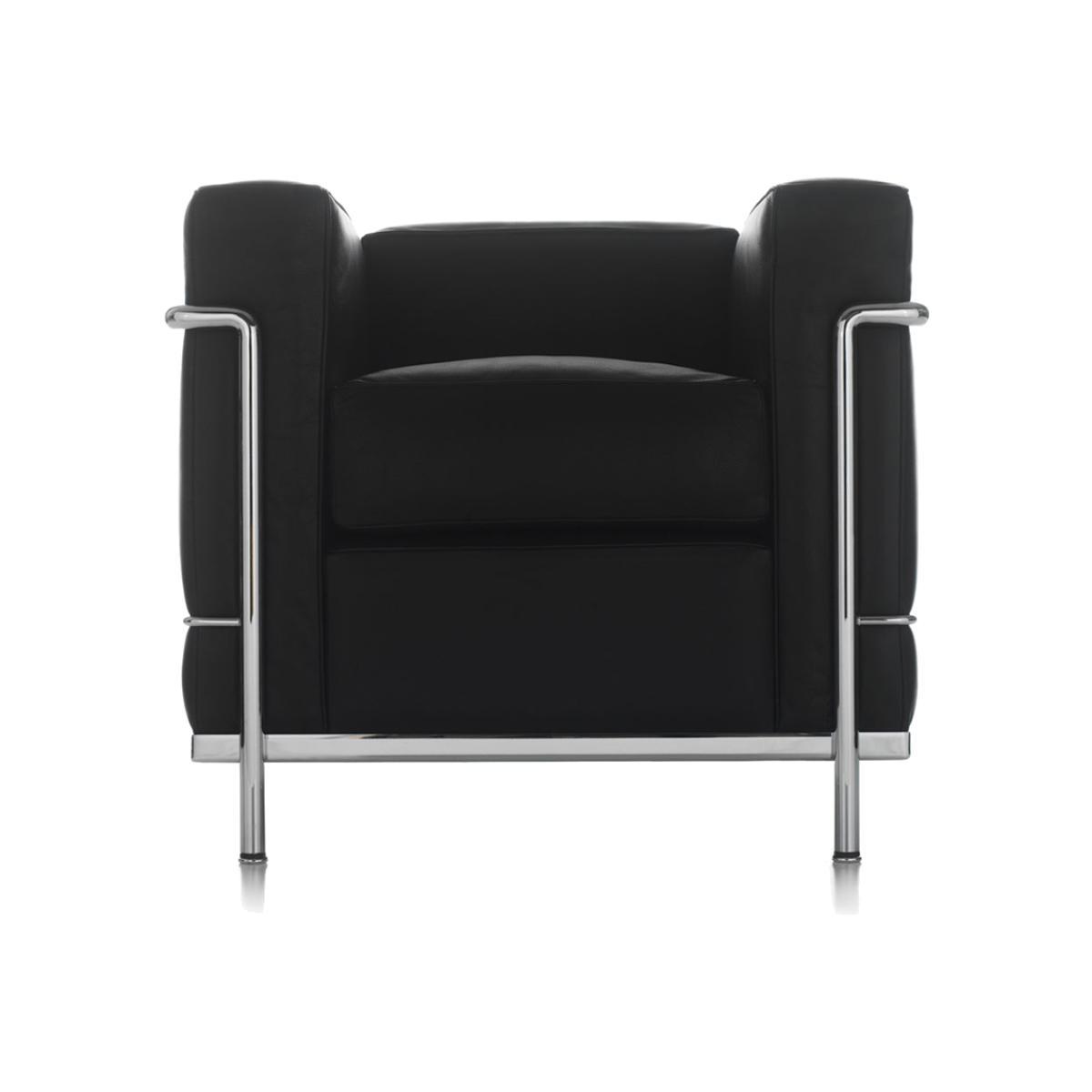 Revive your interiors with the LC2 Armchair in polished trivalent chrome plated steel and graphite Scozia leather, a design classic by Le Corbusier, Charlotte Perriand and Pierre Jeanneret for Cassina. Originally designed in 1928, this timeless modernist design has a sculptural shape and comfortable arm rests that ensure this armchair was ahead of its time. Crafted from a chromed tubular steel frame that supports the graphite Scozia leather seats, the LC2 Armchair is padded with feathers for optimal comfort. With its machine-age materials and lack of ornamentation, the 1928 LC2 Armchair, manufactured by Cassina, is a classic example of the refined functional aesthetic that was embraced by such designers as Le Corbusier, Charlotte Perriand and Pierre Jeanneret. Part of the Cassina I Maestri collection, the LC2 Armchair is a certified original design. Each armchair is marked with the designers' signatures and the Cassina I Maestri logo, alongside the production number and identity card.